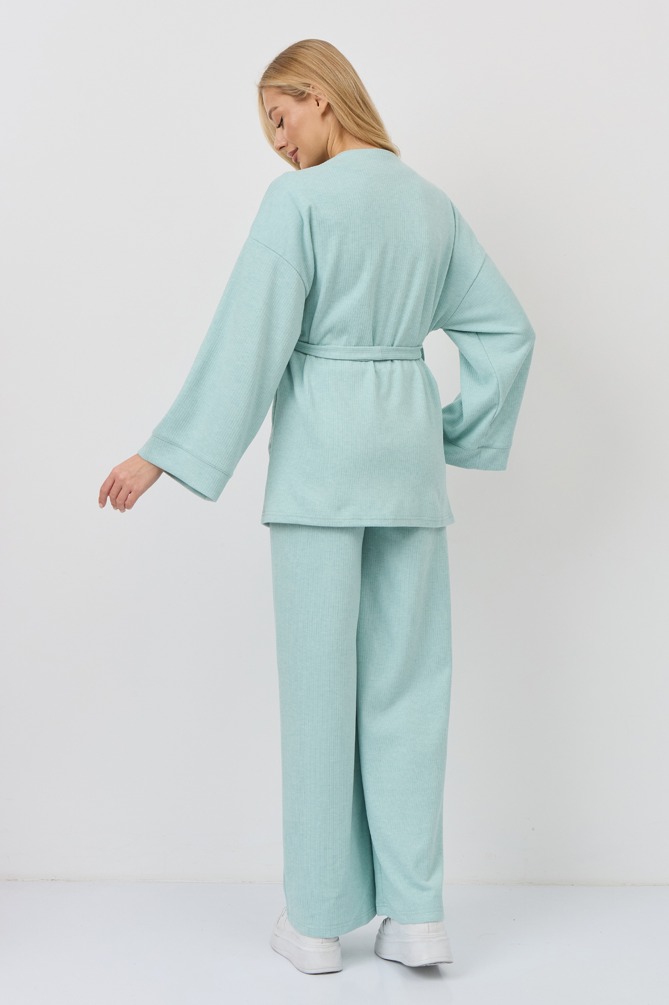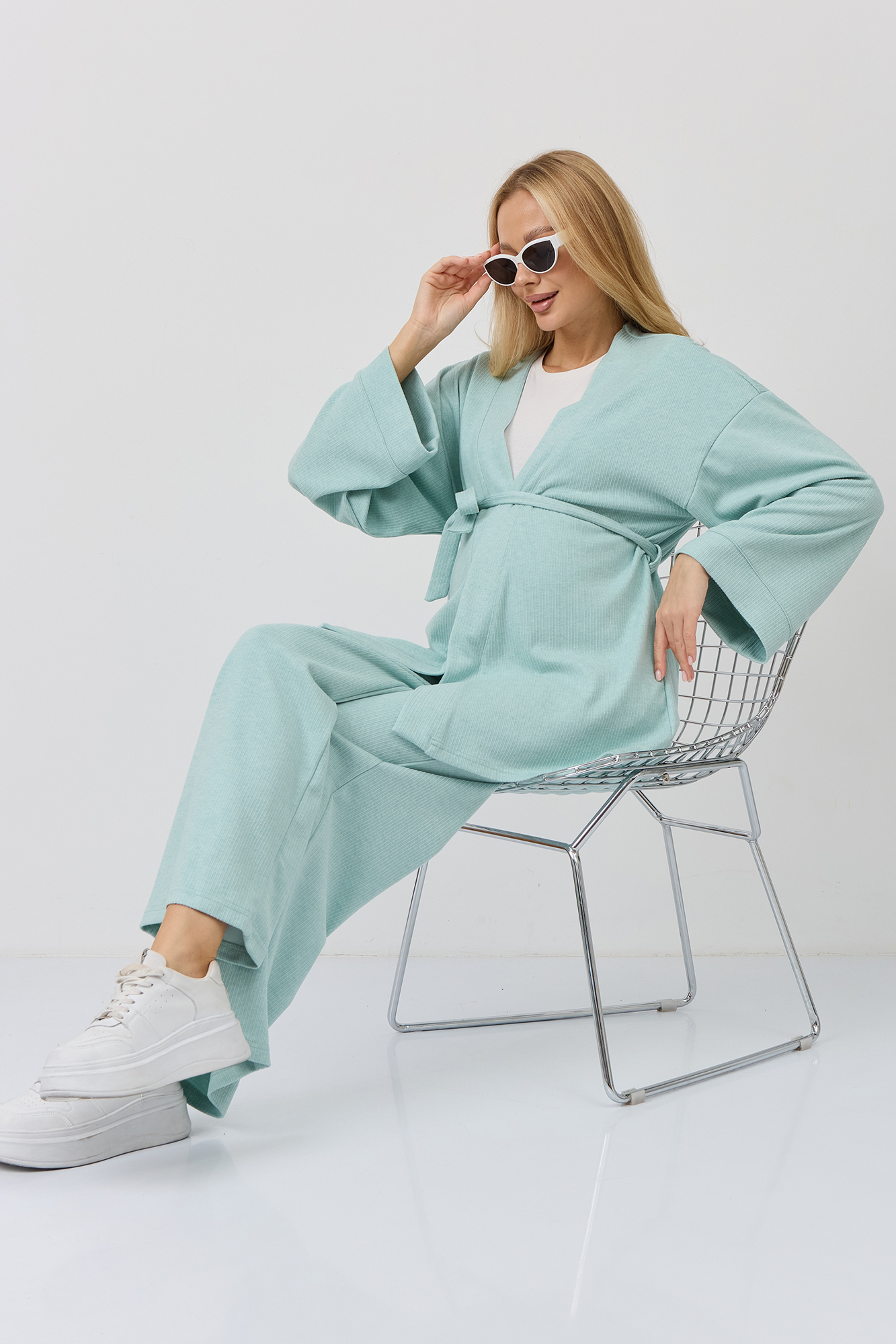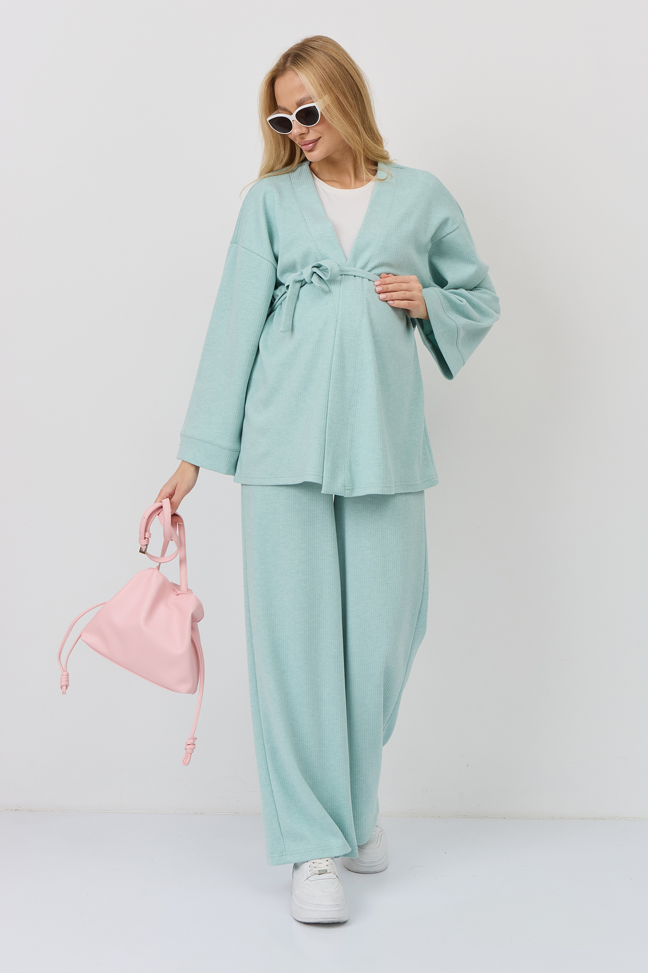 Костюм для беременных изготовлен из качественного мягкого трикотажа в рубчик. Фактурная трикотажная ткань с эффектом вельвета приятна на ощупь и гипоаллергенна. Женский брючный костюм - отличный выбор для повседневного образа. В комплект для будущих мам входят кардиган на запах и штаны. К кимоно предусмотрен пояс. Щирокие штаны оверсайз, прямого кроя, с высоким эластичным поясом, который выполняет роль бандажа. Модель рассчитана на весь период беременности: обхват регулируется за счет пуговицы на резинке. Брючный летний костюм для беременных подойдет для прогулок, офиса или носки дома. Стильный костюм двойка - незаменимая одежда для беременных в любое время года. Трикотажный однотонный костюм подходит девушкам и женщинам больших размеров плюз сайз. Состав: 65% Вискоза, 30% Полиэстер, 5% Лайкра. Костюм для беременных - отличный выбор для будущих мам на весну.