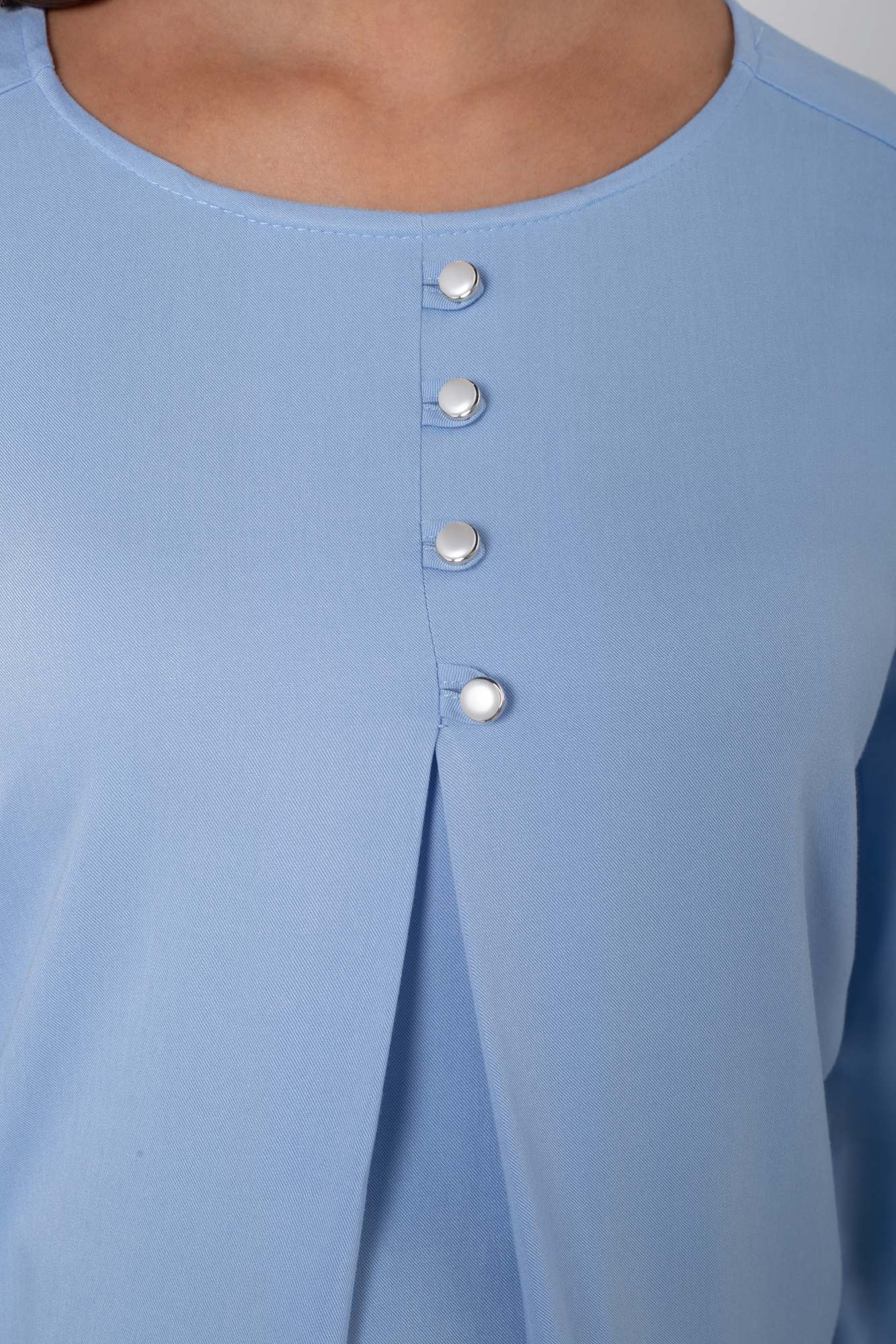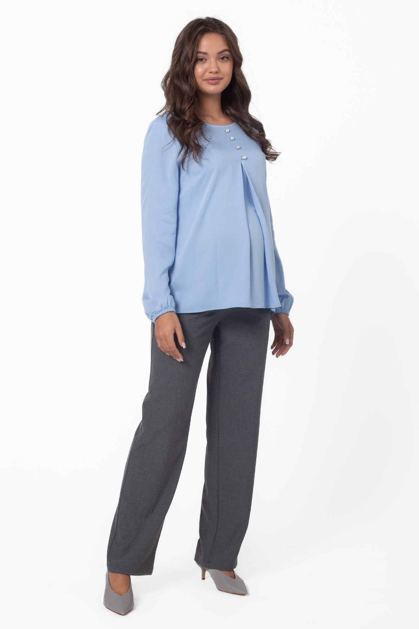 Классическая женская блузка для беременных выполнена из шелковистой вискозы. Легкая струящаяся ткань приятна к телу, не мнется и не вытягивается. Крой модели прямой, свободный, со встречной складной на животе и по спинке. Рубашка хорошо сидит по фигуре на любом месяце беременности и даже после родов. Рукава длинные, с манжетами, на груди декоративная застежка с жемчужными пуговицами, вырез горловины круглый. Стильная блуза гармонично сочетается с деловыми брюками и юбками, casualджинсами, разной обувью, дополняется аксессуарами. Такая рубашка подойдет для офисного делового образа, выхода в свет или как модный look будущей мамы на каждый день.