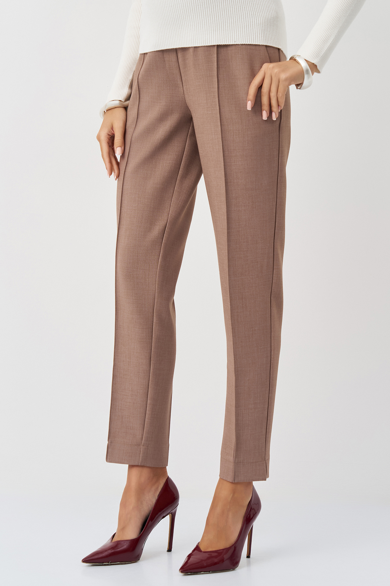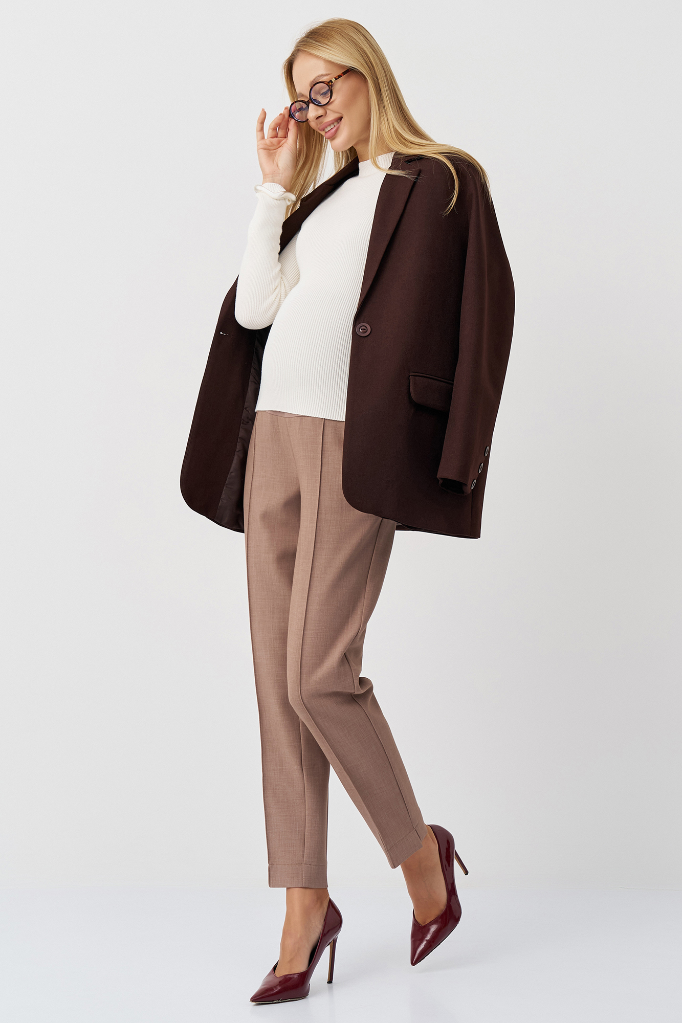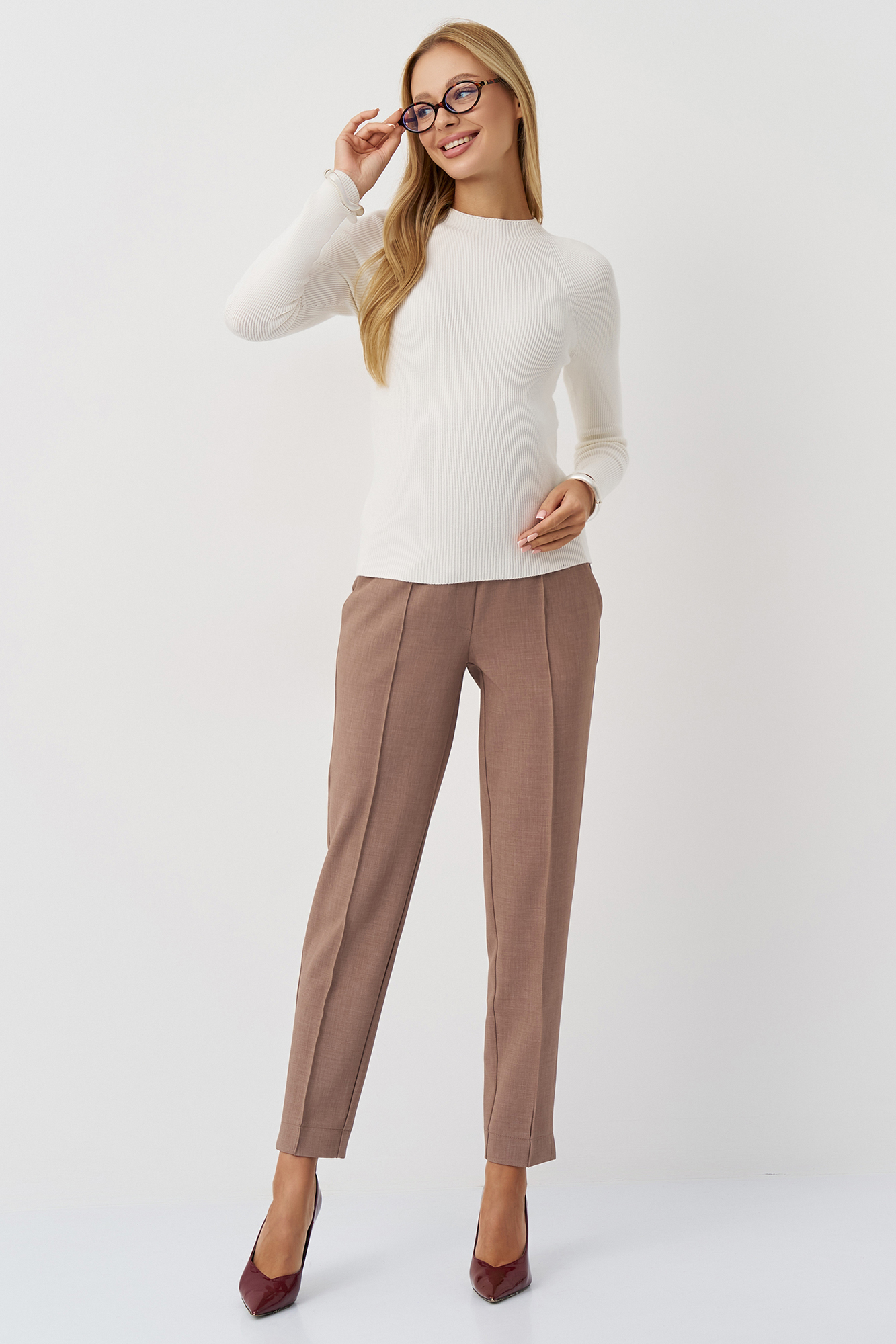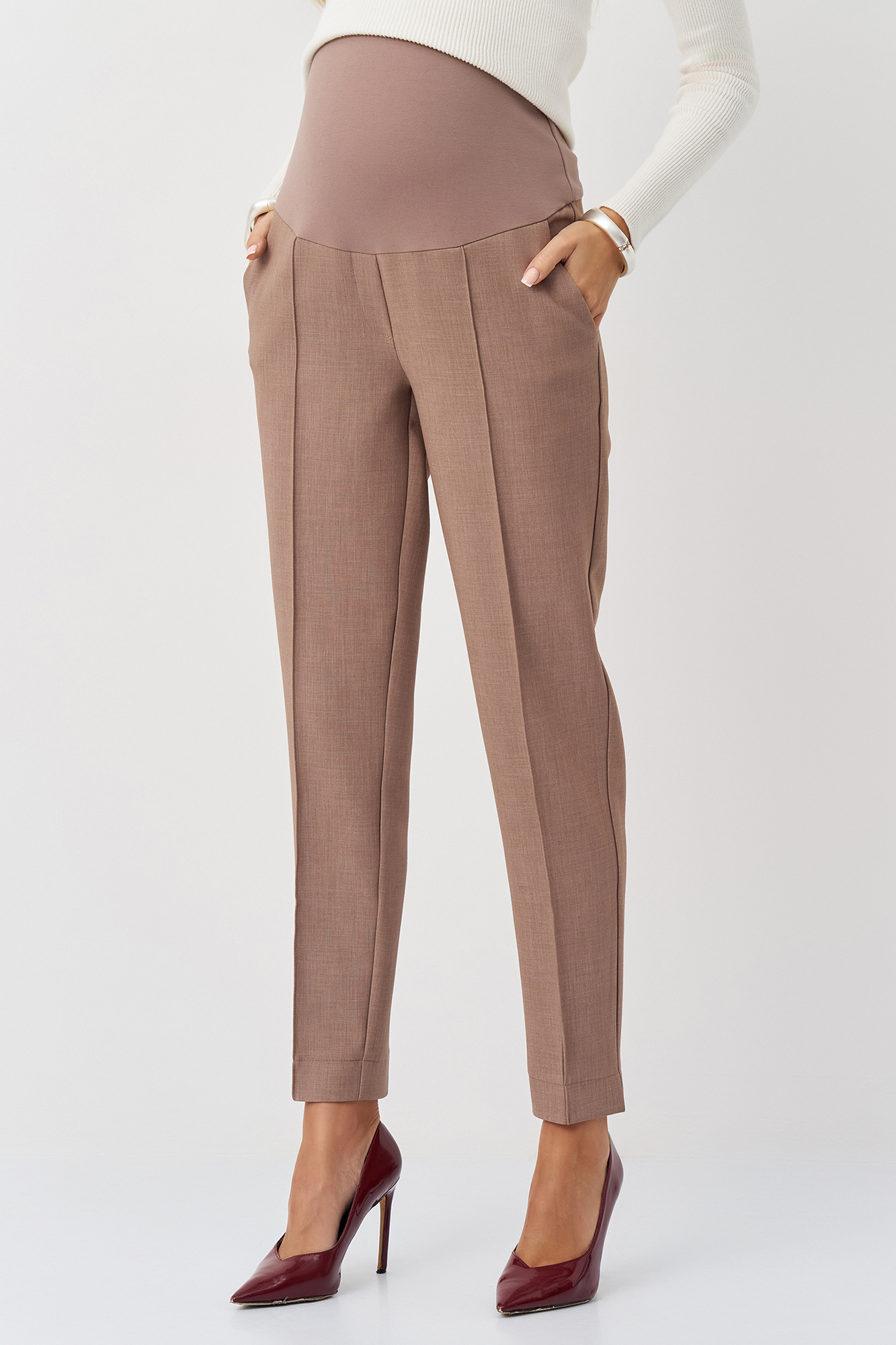 Брюки для беременных прямые выполнены из плотной костюмной ткани. Крой брюк прямой, стандартной длины, с высокой посадкой. Широкий эластичный пояс обеспечивает функцию мягкого бандажа, а скрытая регулировка объема на пуговице позволяет будущей маме носить такие штаны на протяжении всего срока беременности и после рождения малыша. Классические стильные брюки с высоким поясом станут удобным вариантом повседневной одежды, дополнят офисный и деловой гардероб. Они хорошо сочетаются с блузками или рубашками. Умеренная плотность материала делает штаны из габардина универсальной одеждой для любого времени года, включая зиму и осень. Состав: 65% Вискоза 30% Полиэстер 5% Лайкра.