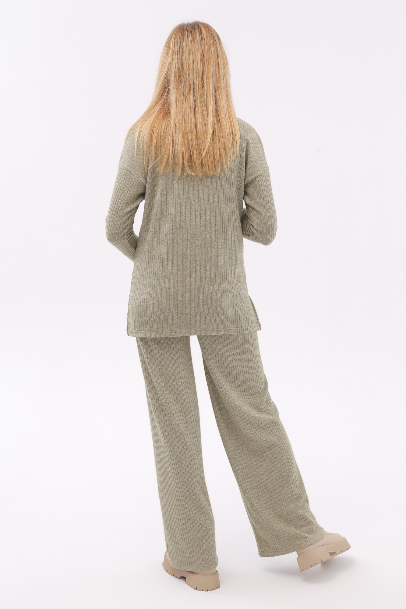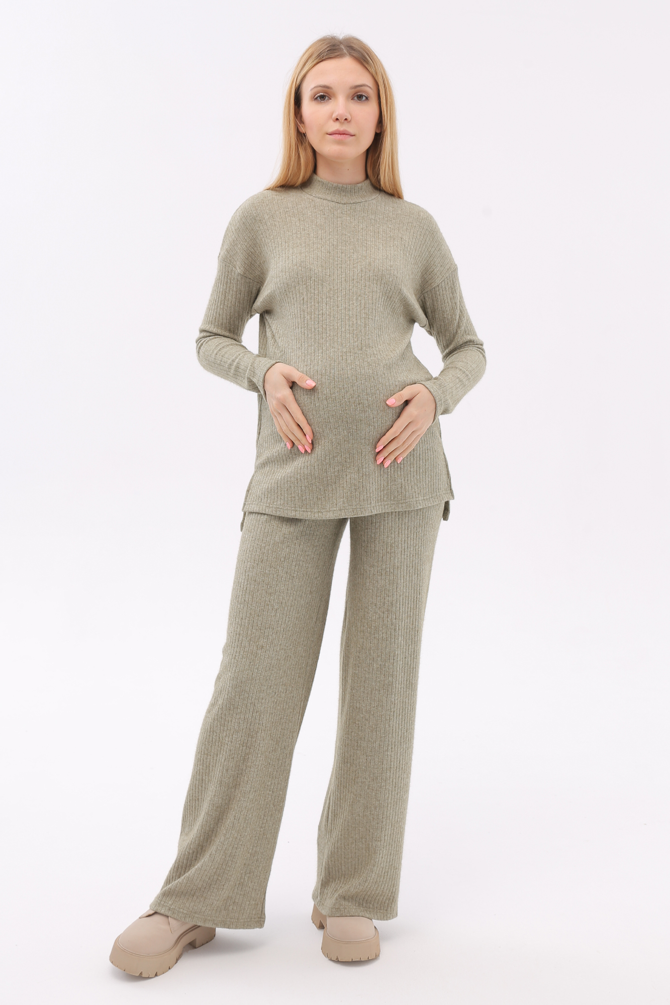 Брючный костюм для беременных сшит из качественного теплого вязанного трикотажного материала. Фактурная ткань лапша в рубчик приятна на ощупь, гипоаллергенна и отлично согревает в непогоду. Женский костюм из трикотажа - удачный выбор для повседневного ношения в холодное время года. В комплект для будущих мам включены кофта и штаны. Джемпер со спущенной линией плеча слегка удлинен сзади, по бокам - небольшие разрезы. Штаны широкие, прямого кроя, с высоким эластичным поясом, который выполняет роль бандажа. Модель рассчитана на весь период беременности: обхват регулируется за счет пуговицы на резинке. Брючный костюм для беременных подойдет для прогулок, офиса или ношения дома. В осенний и весенний периоды он пригодится на выписку. Модель предлагается в нескольких однотонных расцветках и полной размерной линейке.