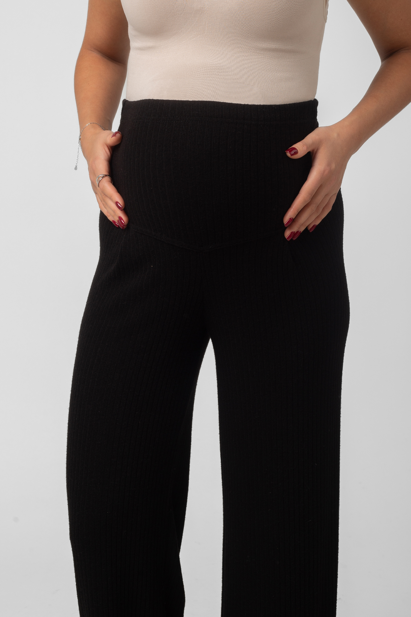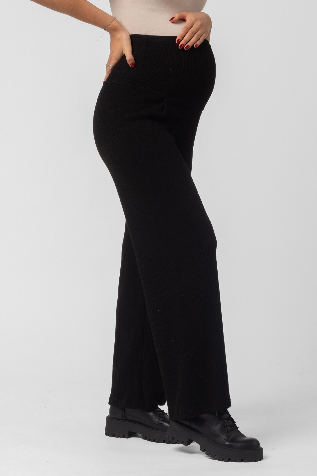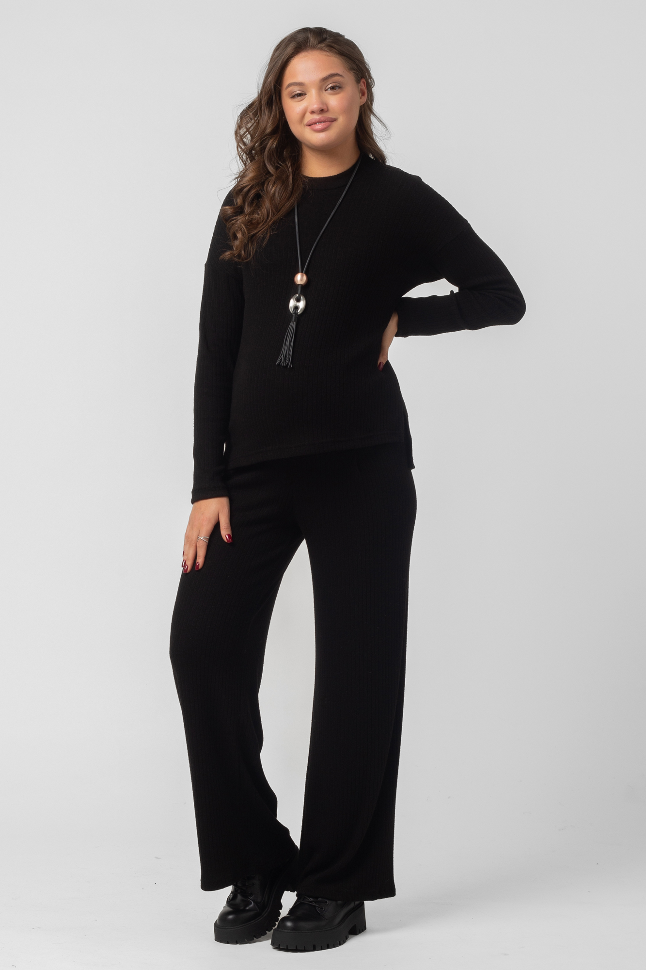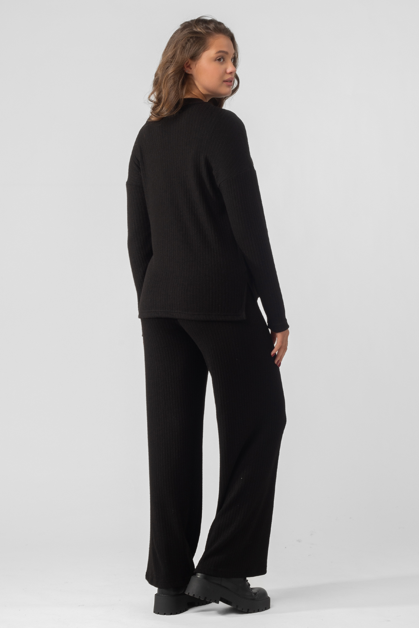 Брючный костюм для беременных сшит из качественного теплого вязанного трикотажного материала. Фактурная ткань лапша в рубчик приятна на ощупь, гипоаллергенна и отлично согревает в непогоду. Женский костюм из трикотажа - удачный выбор для повседневного ношения в холодное время года. В комплект для будущих мам включены кофта и штаны. Джемпер со спущенной линией плеча слегка удлинен сзади, по бокам - небольшие разрезы. Штаны широкие, прямого кроя, с высоким эластичным поясом, который выполняет роль бандажа. Модель рассчитана на весь период беременности: обхват регулируется за счет пуговицы на резинке. Брючный костюм для беременных подойдет для прогулок, офиса или ношения дома. В осенний и весенний периоды он пригодится на выписку. Модель предлагается в нескольких однотонных расцветках и полной размерной линейке.