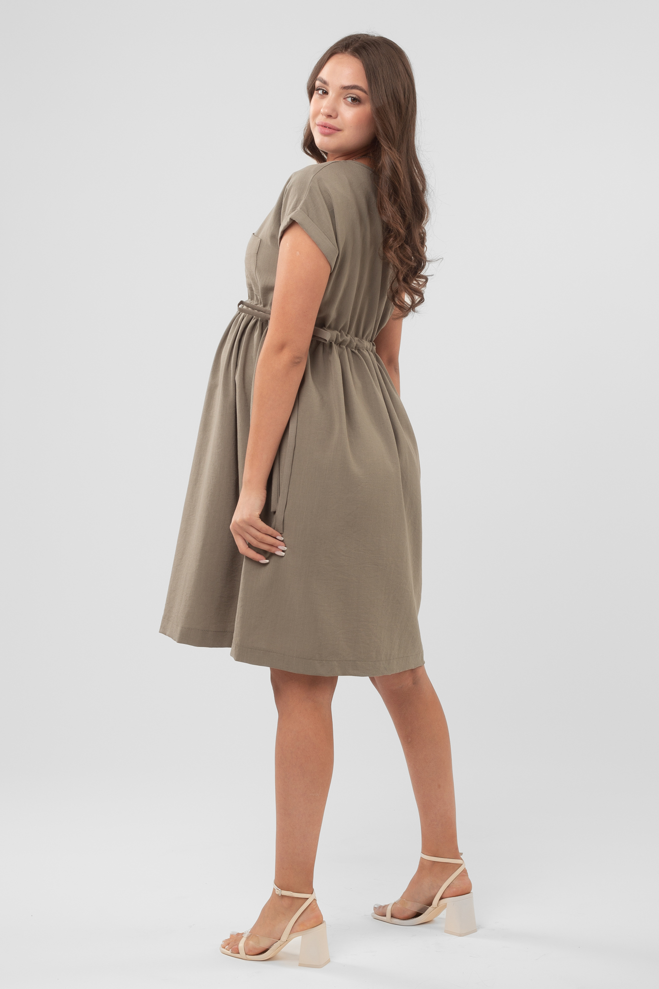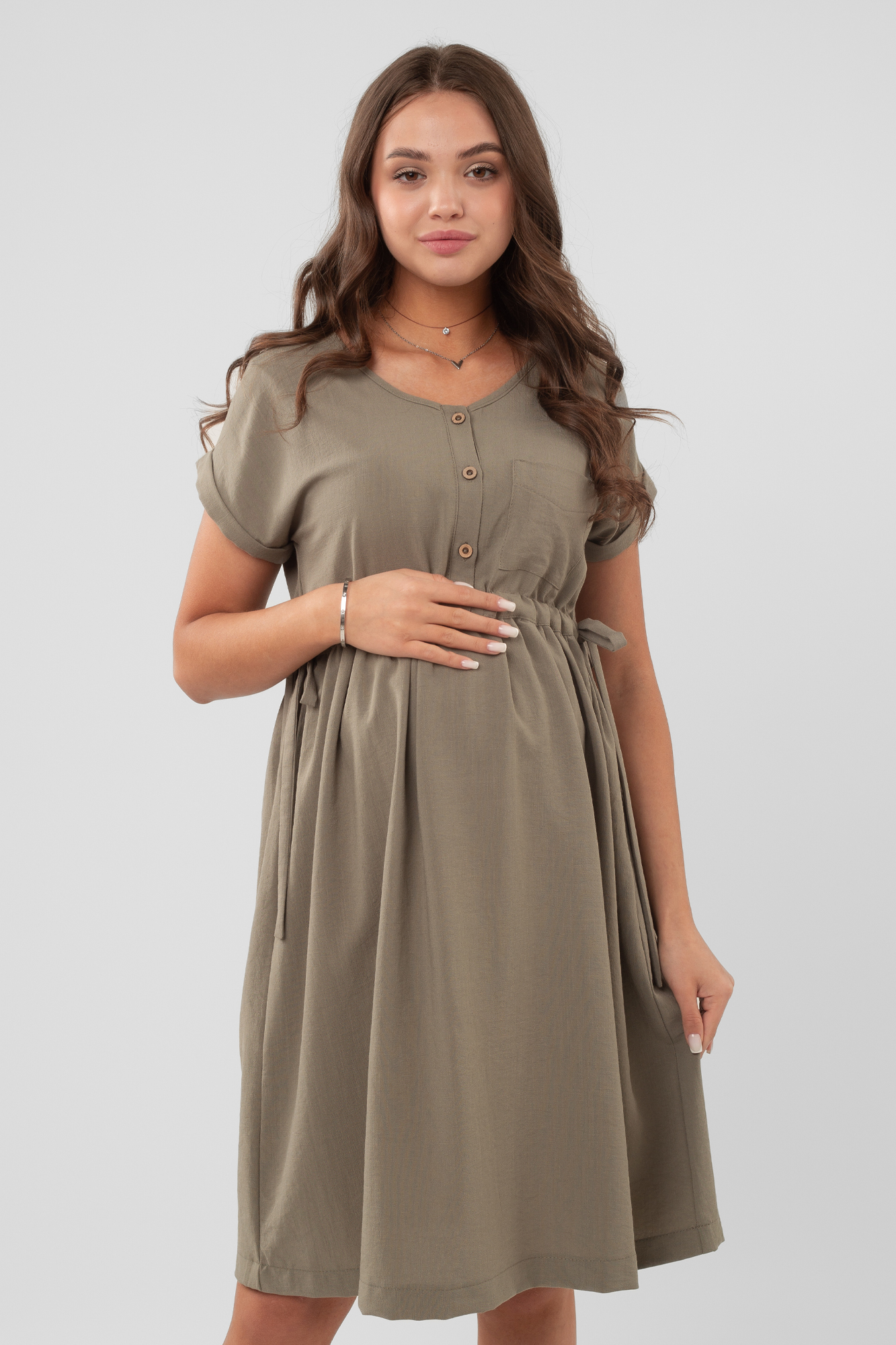Легкое платье-рубашка для будущих мам. V-образный вырез горловины, короткий рукав, планка на пуговицах по переду, накладной карман на груди. Платье свободного кроя обеспечивает комфорт и предоставляет возможность носить его на всем протяжении беременности и после родов. Кулиски по бокам изделия позволят регулировать ширину платья под вашу фигуру, создавая приталенный силуэт.