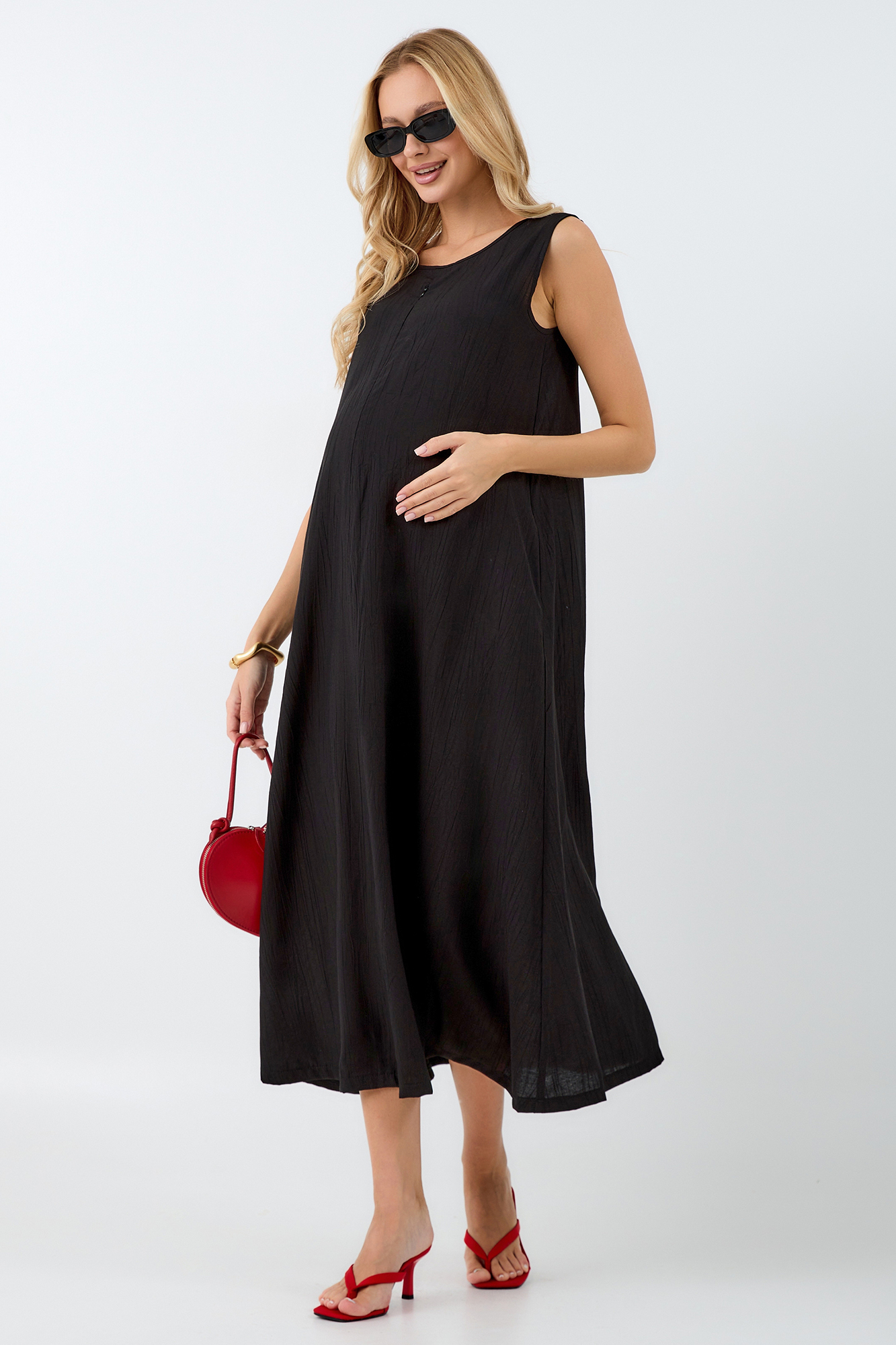 Платье для беременных, выполненное из высококачественной премиальной вискозы с эффектом жатки, подарит вам комфорт и безупречный внешний вид на протяжении всей беременности и после. Длинное платье макси с округлым вырезом горловины и без рукавов идеально подходит для теплых летних дней, а приталенный силуэт, подчеркиваемый резинкой под грудью и по спинке, выгодно акцентирует фигуру.