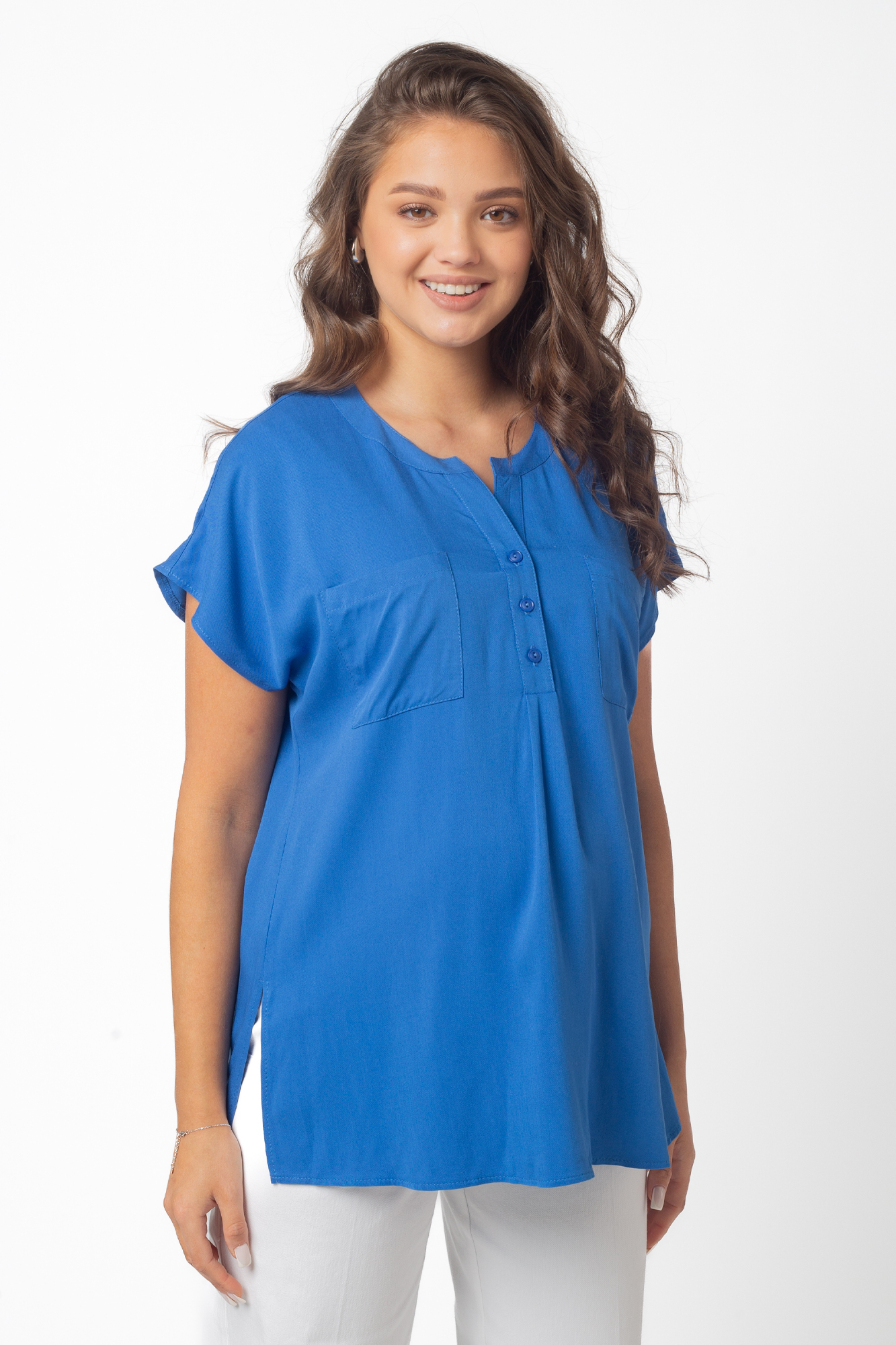 Легкая блузка для беременных выполнена из высококачественной шелковистой вискозы. Натуральный материал подарит приятные тактильные ощущения и обеспечит комфорт будущей маме и малышу. Свободный крой позволяет носить изделие на всем протяжении беременности, а после родов скроет временные несовершенства фигуры. Блузка подойдет для работы в офисе и просто на каждый день.