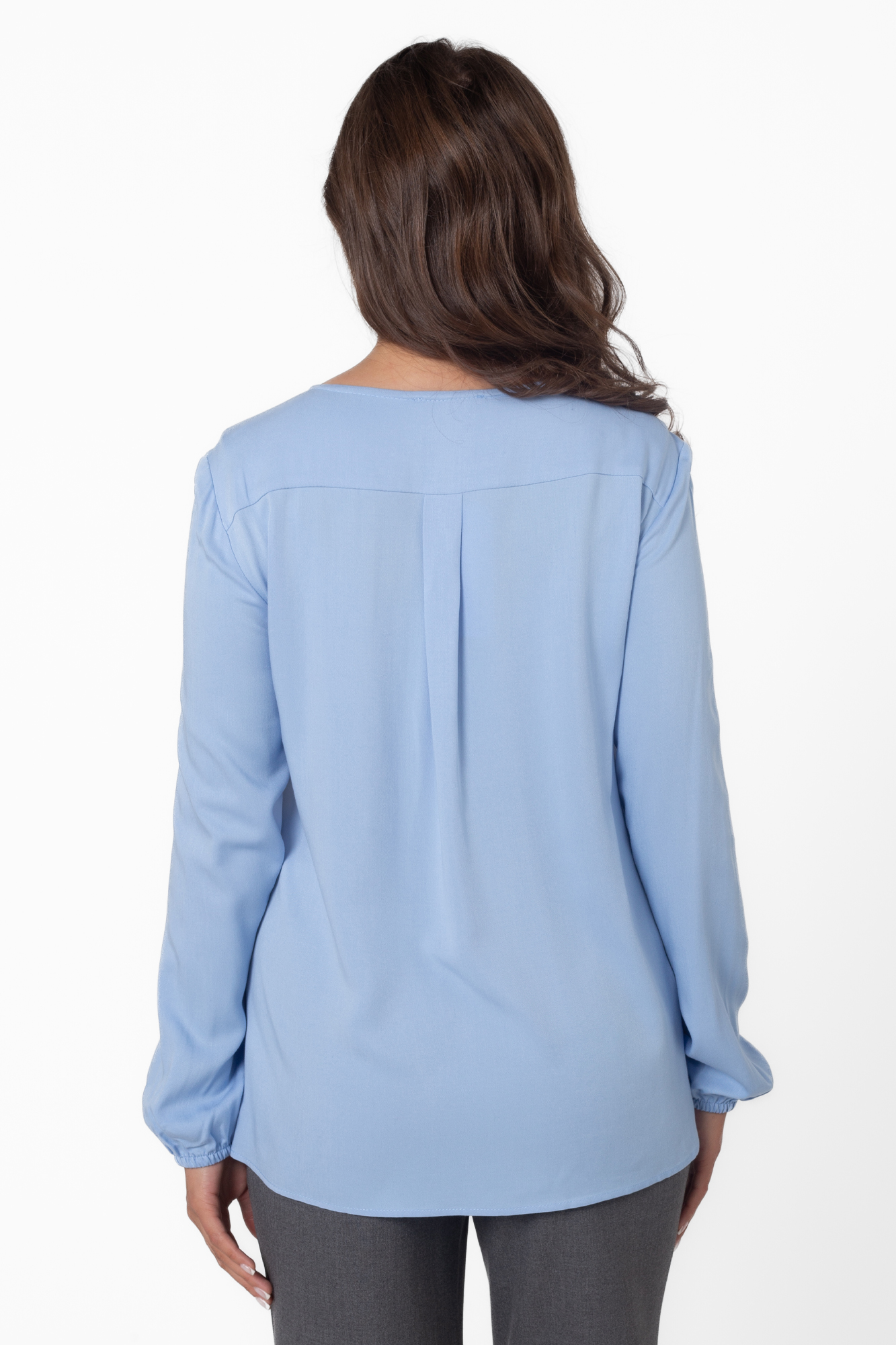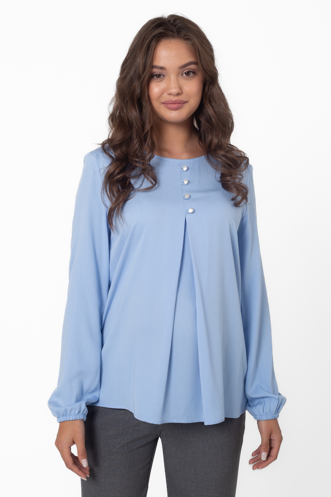 Классическая женская блузка для беременных выполнена из шелковистой вискозы. Легкая струящаяся ткань приятна к телу, не мнется и не вытягивается. Крой модели прямой, свободный, со встречной складной на животе и по спинке. Рубашка хорошо сидит по фигуре на любом месяце беременности и даже после родов. Рукава длинные, с манжетами, на груди декоративная застежка с жемчужными пуговицами, вырез горловины круглый. Стильная блуза гармонично сочетается с деловыми брюками и юбками, casualджинсами, разной обувью, дополняется аксессуарами. Такая рубашка подойдет для офисного делового образа, выхода в свет или как модный look будущей мамы на каждый день.