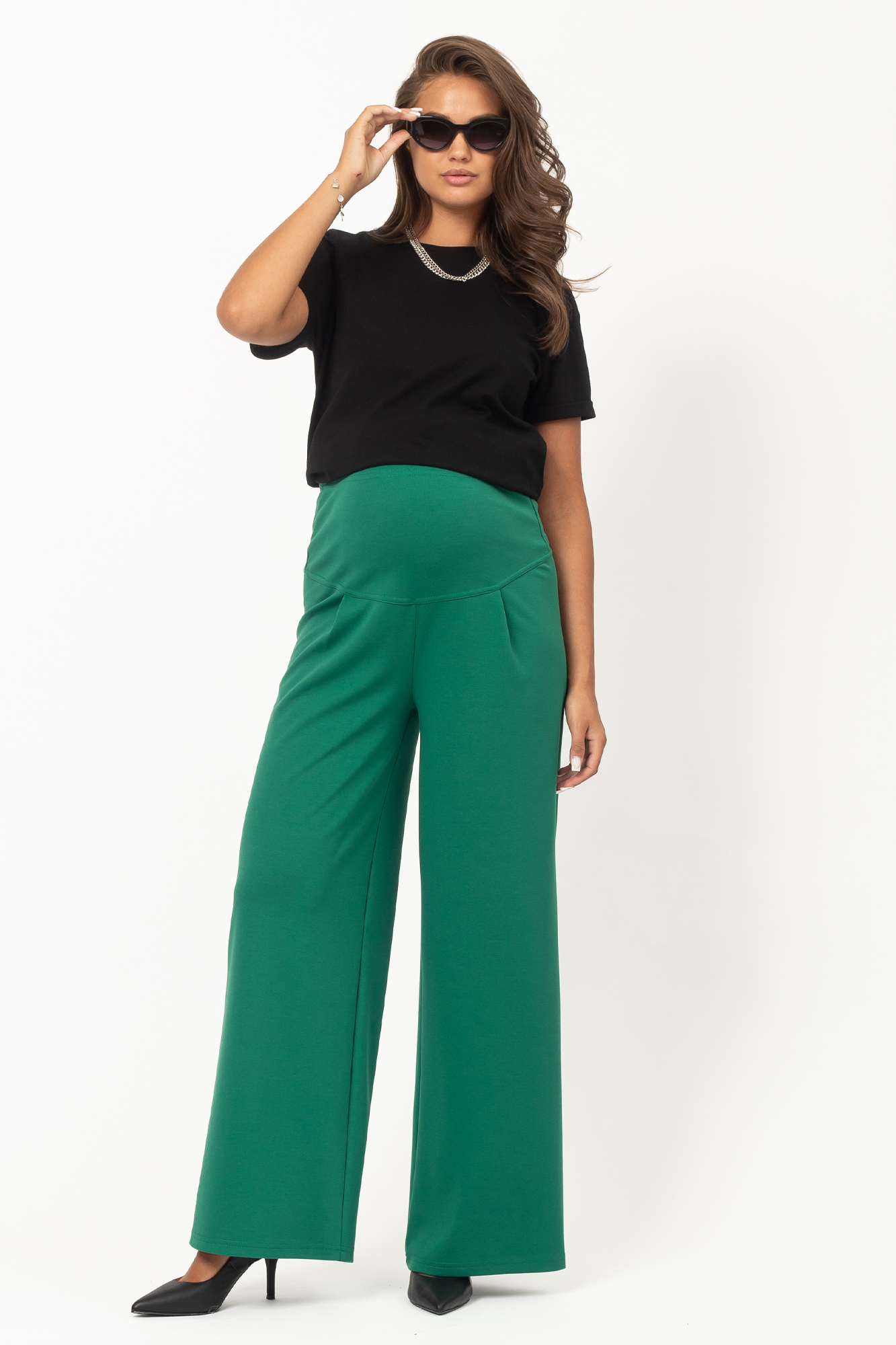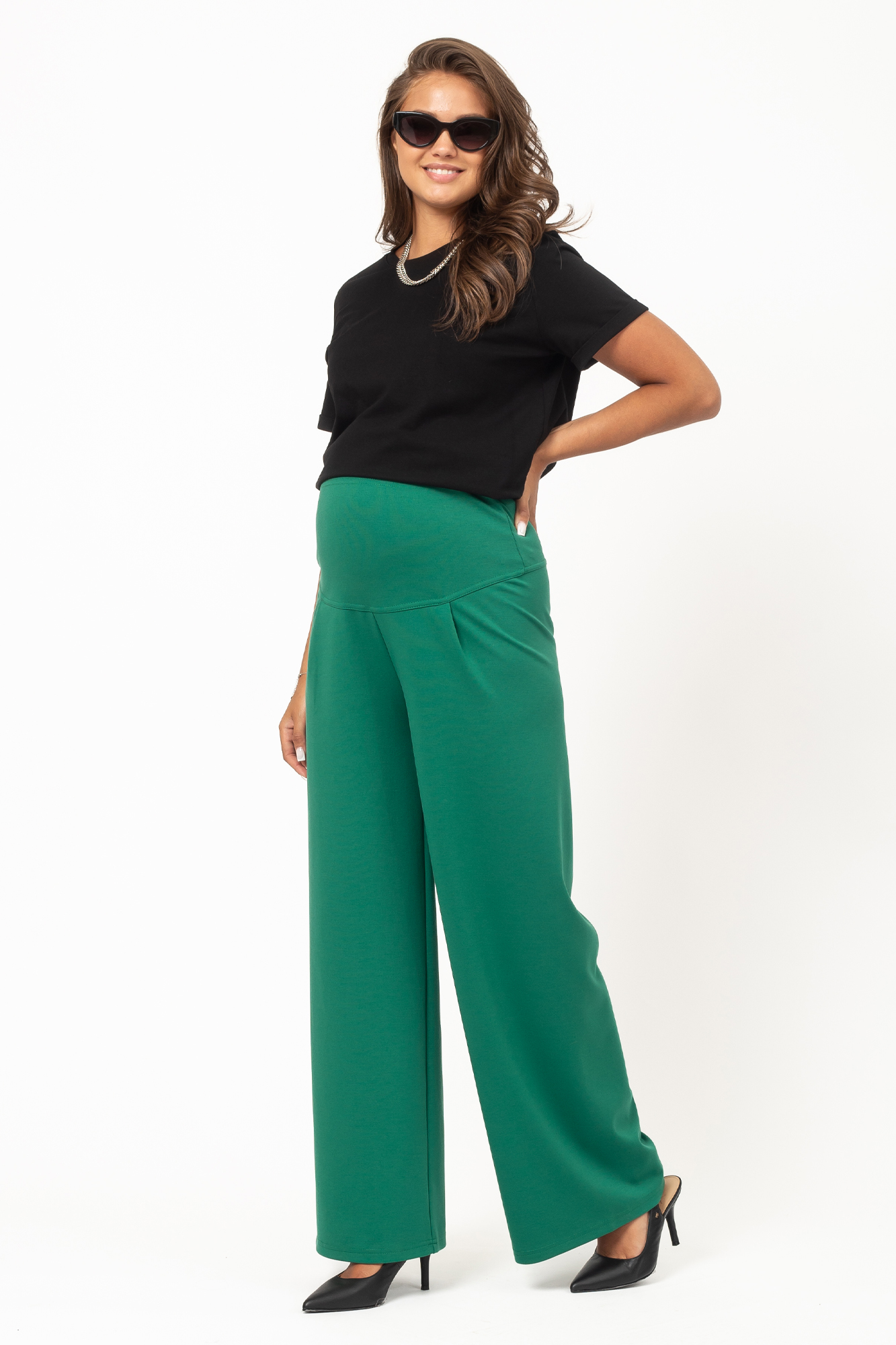 Широкие брюки для беременных сшиты из премиального трикотажа джерси. В его составе вискоза и полиэстер, которые придают ткани высокую износостойкость, устойчивость к появлению катышек и усадке. Классические брюки свободного кроя с высокой посадкой; высокий эластичный пояс оснащен регулировкой объема на резинке, поэтому модель можно носить на любом месяце беременности. Брюки идеально подходят для офиса, отлично сочетаются с деловой женской одеждой. Также они станут эффектным повседневным решением, а при грамотном подборе аксессуаров - стильным вариантом для праздника. Будущая мама может выбрать такие брюки для ношения прохладным летом, весной и осенью. Универсальная однотонная расцветка позволяет удачно комбинировать брюки с разными вещами.