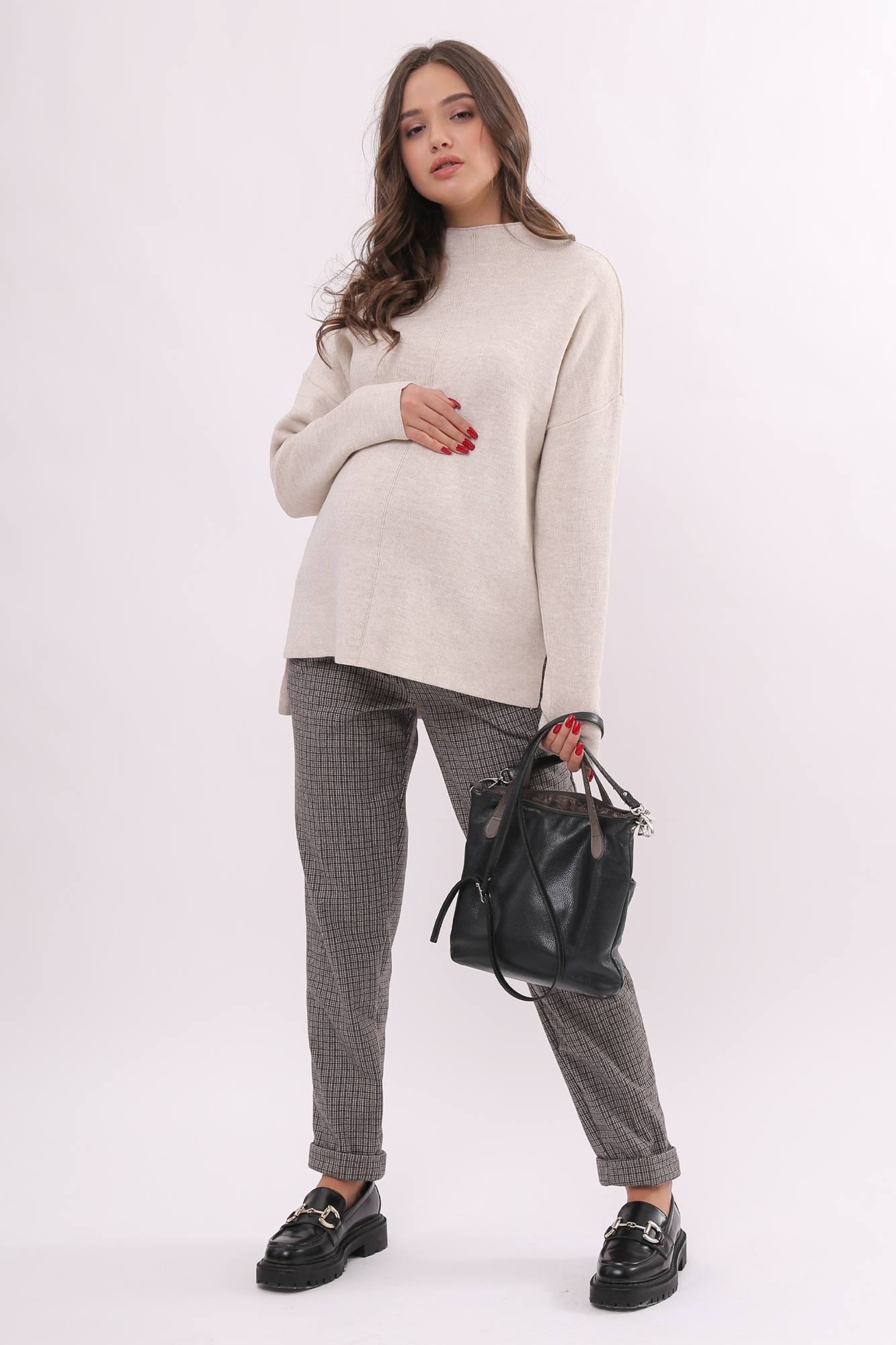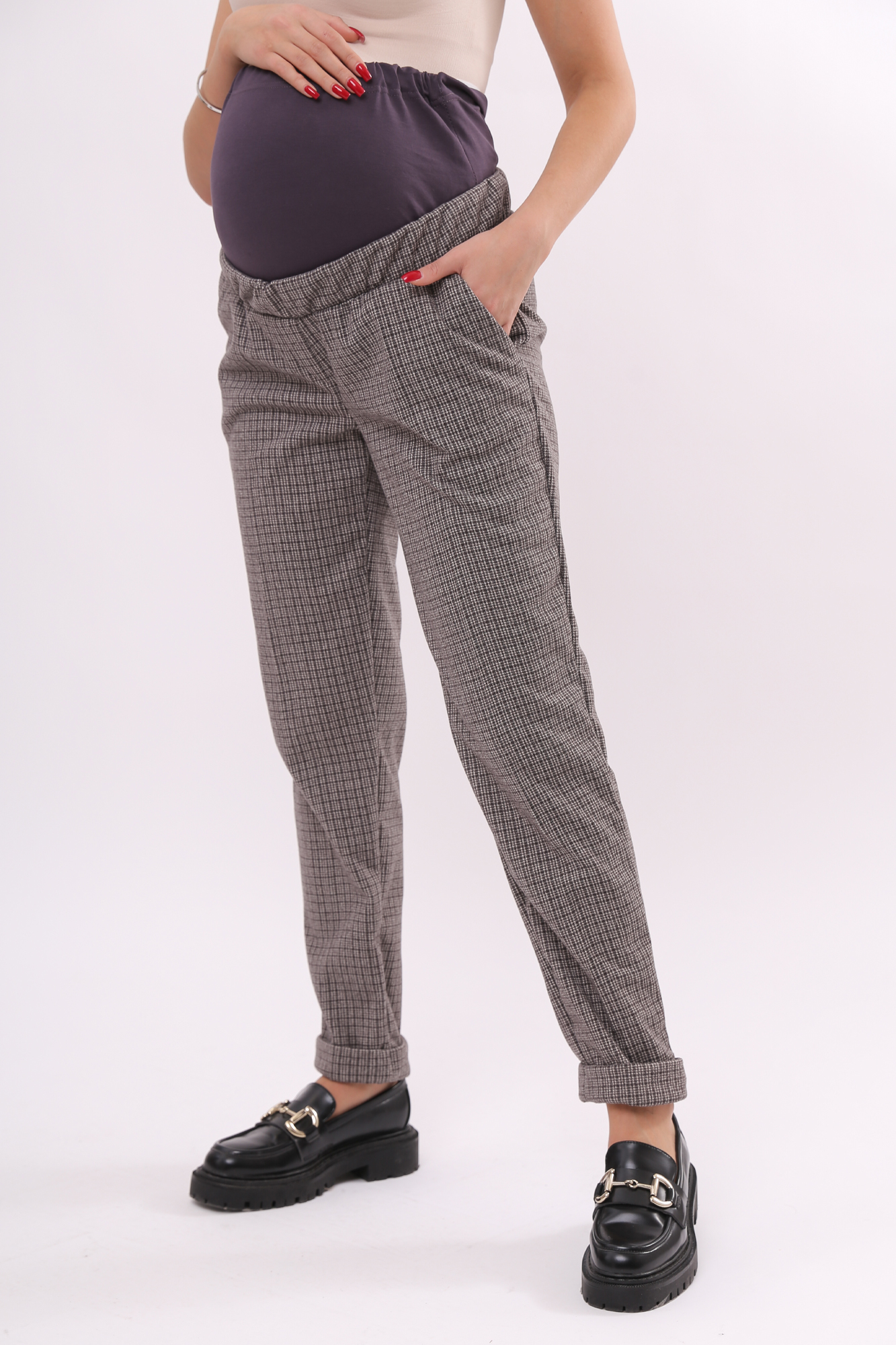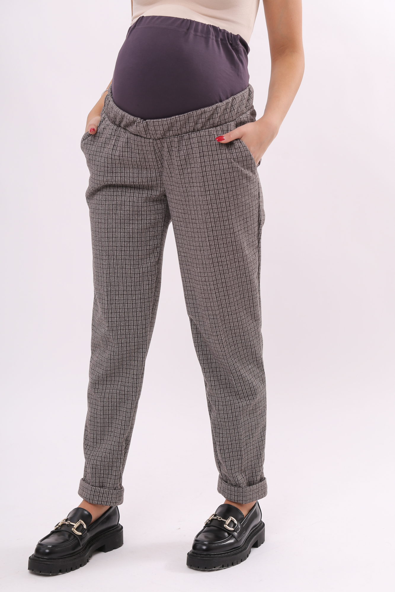 Плотные классические брюки для беременных. Детали: высокий эластичный бандаж, скошенные боковые карманы. Объем регулируется с помощью перфорированной резинки, перестегивающейся на пуговицу, продетой в пояс изделия. В зависимости от подобранных дополнений они могут стать частью и офисного костюма, и одежды для непринуждённого отдыха, и наряда для торжественного события.