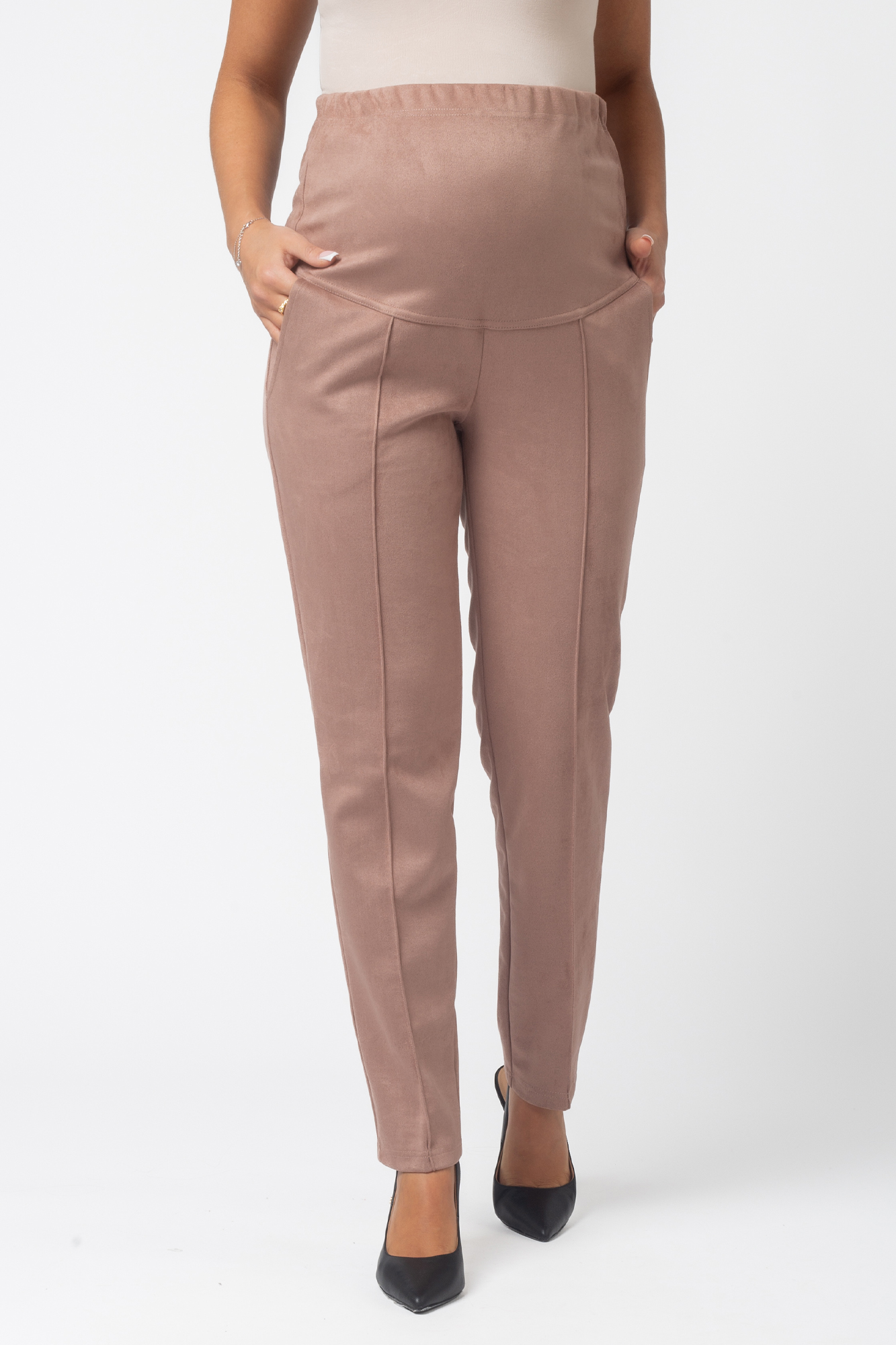 Зауженные брюки для беременных - стильная модель для повседневного гардероба будущей мамы. Сшиты из премиальной искусственной замши. Женские брюки с высокой посадкой оснащены поясом, выполняющим функцию бандажа. Пояс можно регулировать по мере роста животика с помощью скрытой резинки на пуговице. Крой брюк зауженный, спереди - эффектные отстроченные стрелки. Штаны подойдут беременным женщинам на любом сроке - для ношения в офис и на каждый день. Они легко сочетаются с другими вещами женщины: футболками и рубашками, толстовками и жакетами. Модель предлагается в трех базовых однотонных расцветках.
