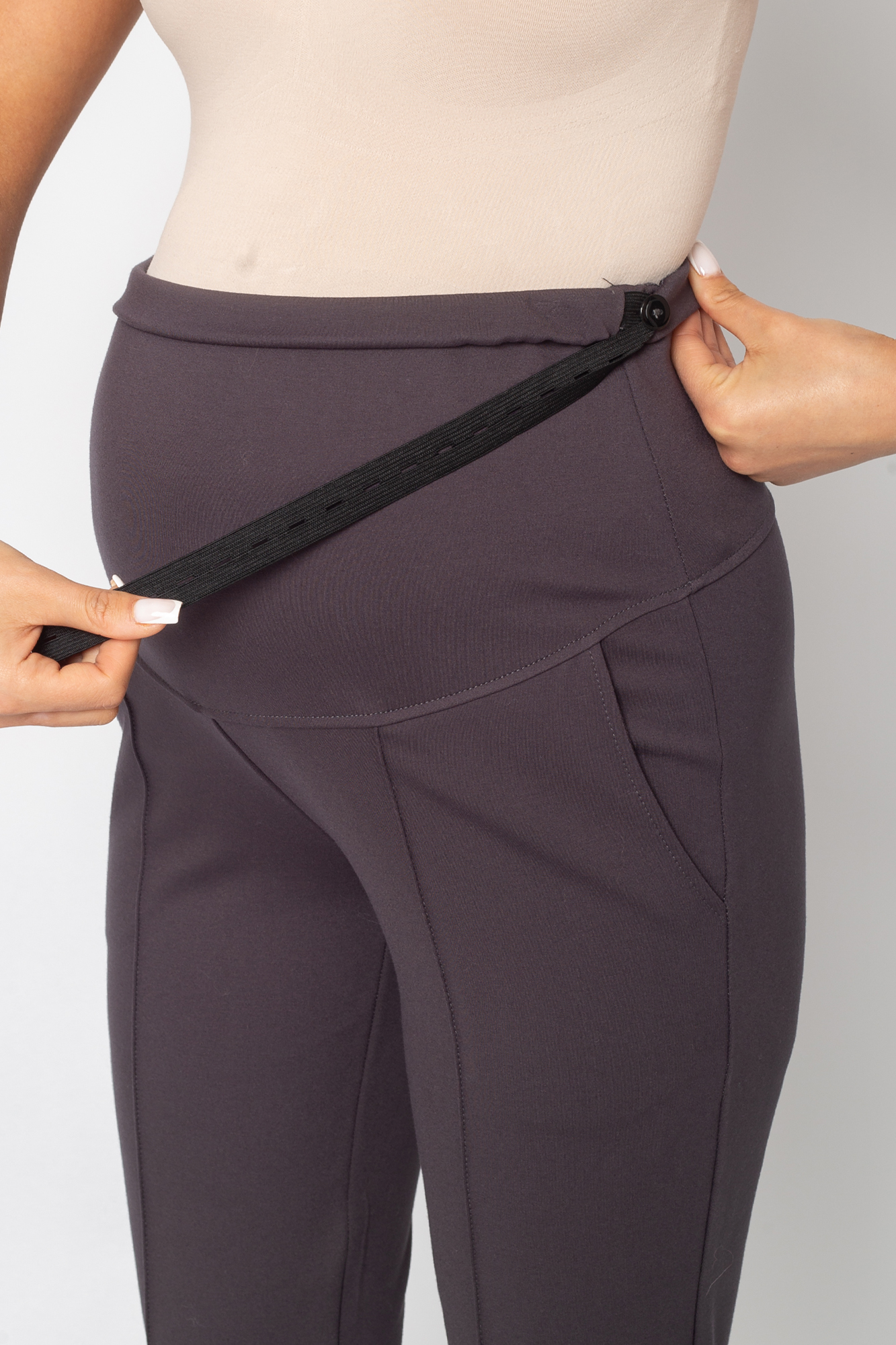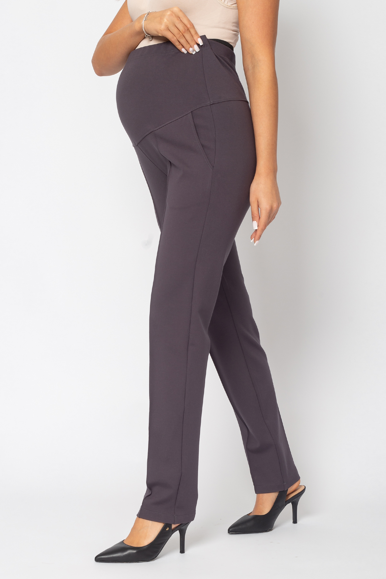Зауженные брюки для беременных выполнены из плотного джерси. Детали: высокий эластичный бандаж, скошенные боковые карманы, отстроченные стрелки. Объем регулируется с помощью перфорированной резинки, перестегивающейся на пуговицу, продетой в верхнюю часть изделия. Эластичность ткани и регулировка объема обеспечивают идеальную посадку на всем протяжении бременности. В зависимости от подобранных дополнений они могут стать частью и офисного костюма, и одежды для непринуждённого отдыха, и наряда для торжественного события.