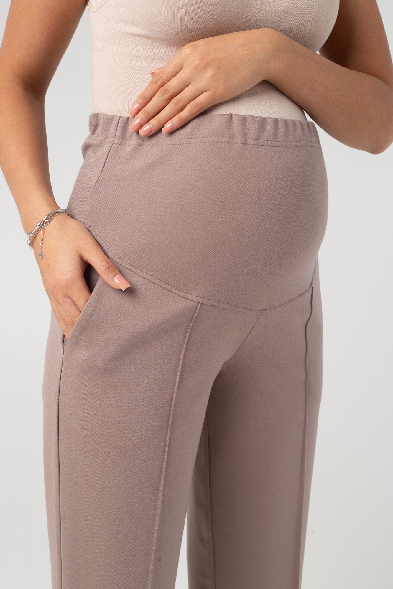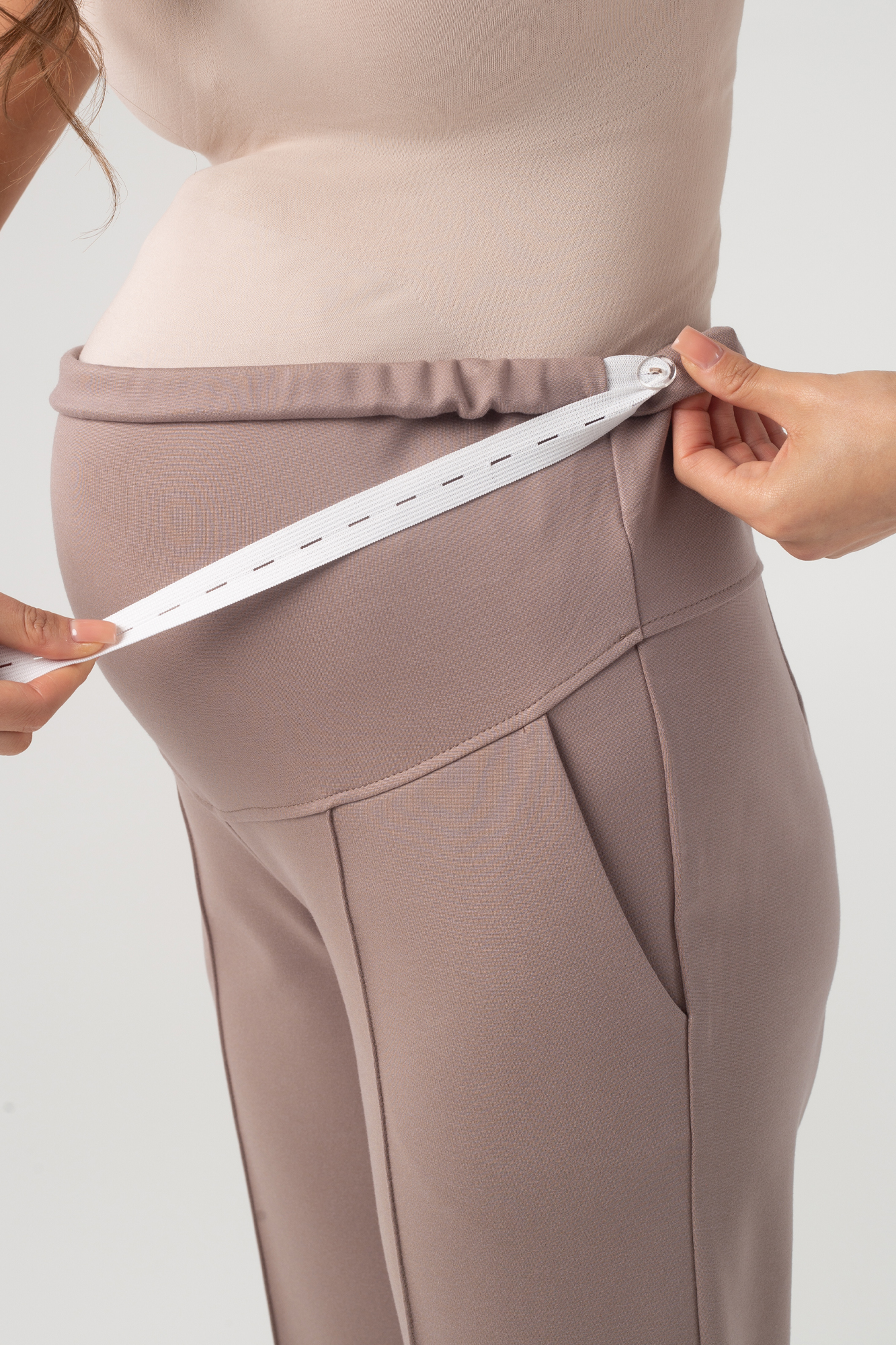 Прямые брюки для беременных выполнены из плотного джерси. Детали: высокий эластичный бандаж, скошенные боковые карманы, отстроченные стрелки. Объем регулируется с помощью перфорированной резинки, перестегивающейся на пуговицу, продетой в верхнюю часть изделия. Эластичность ткани и регулировка объема обеспечивают идеальную посадку на всем протяжении бременности. В зависимости от подобранных дополнений они могут стать частью и офисного костюма, и одежды для непринуждённого отдыха, и наряда для торжественного события.