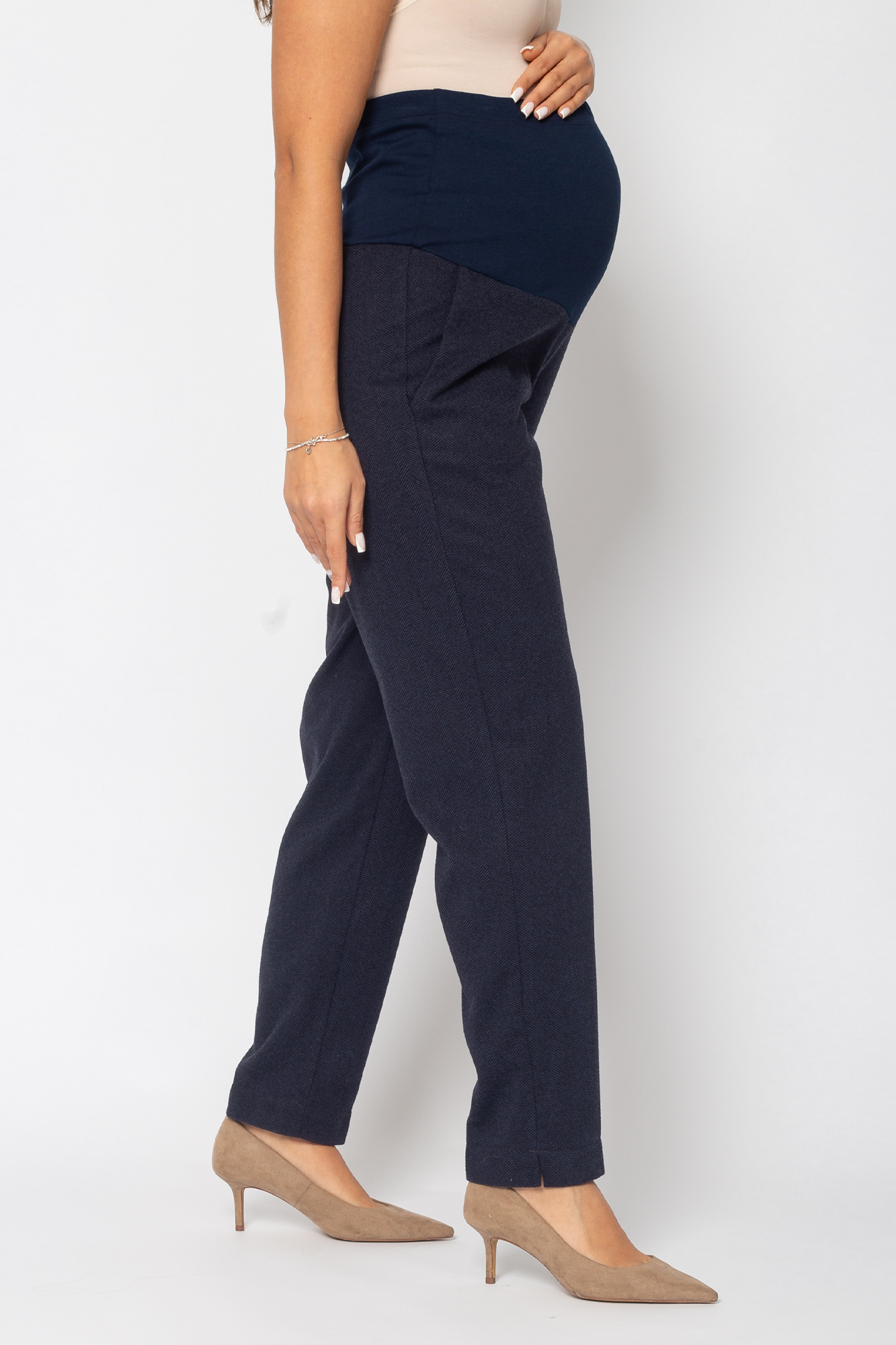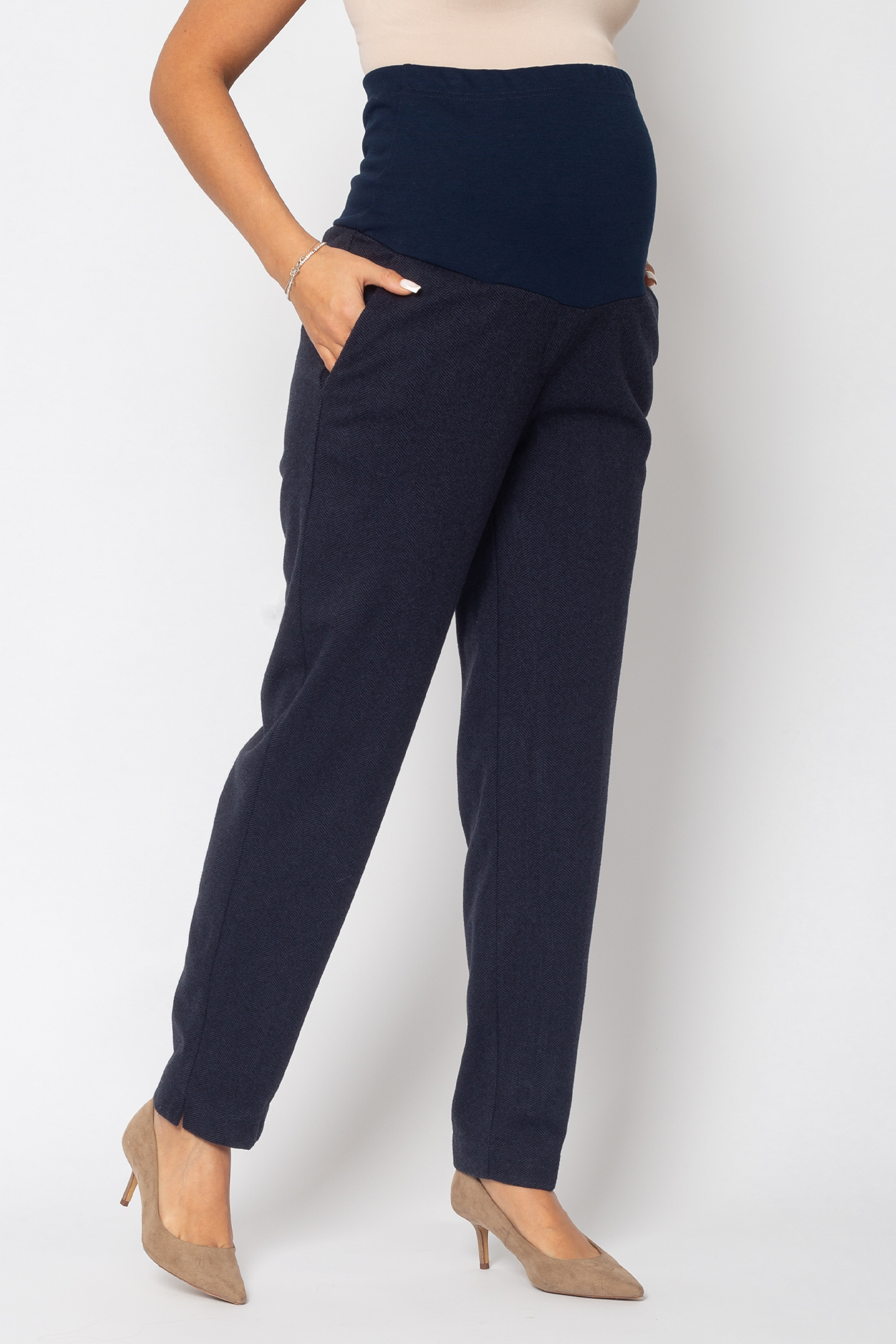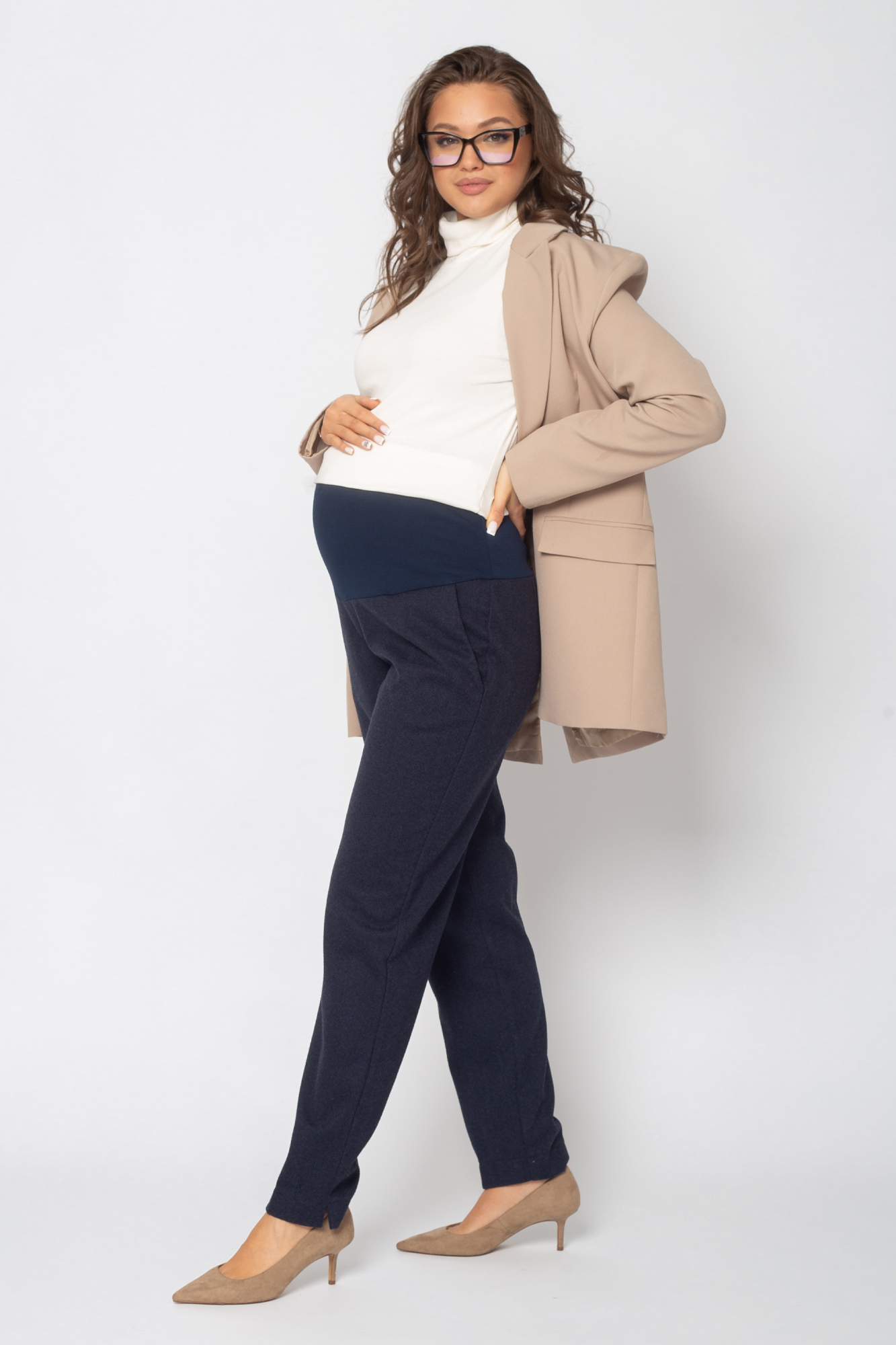 Стильные брюки для беременных - отличный вариант для офисного образа или просто на каждый день. Брюки выполнены из теплого премиального габардина на основе вискозы с добавлением лайкры. Свободный крой брюк-бананов подарит максимум комфорта в носке. Офисная модель с высоким эластичным бандажом подойдет для любого месяца беременности.