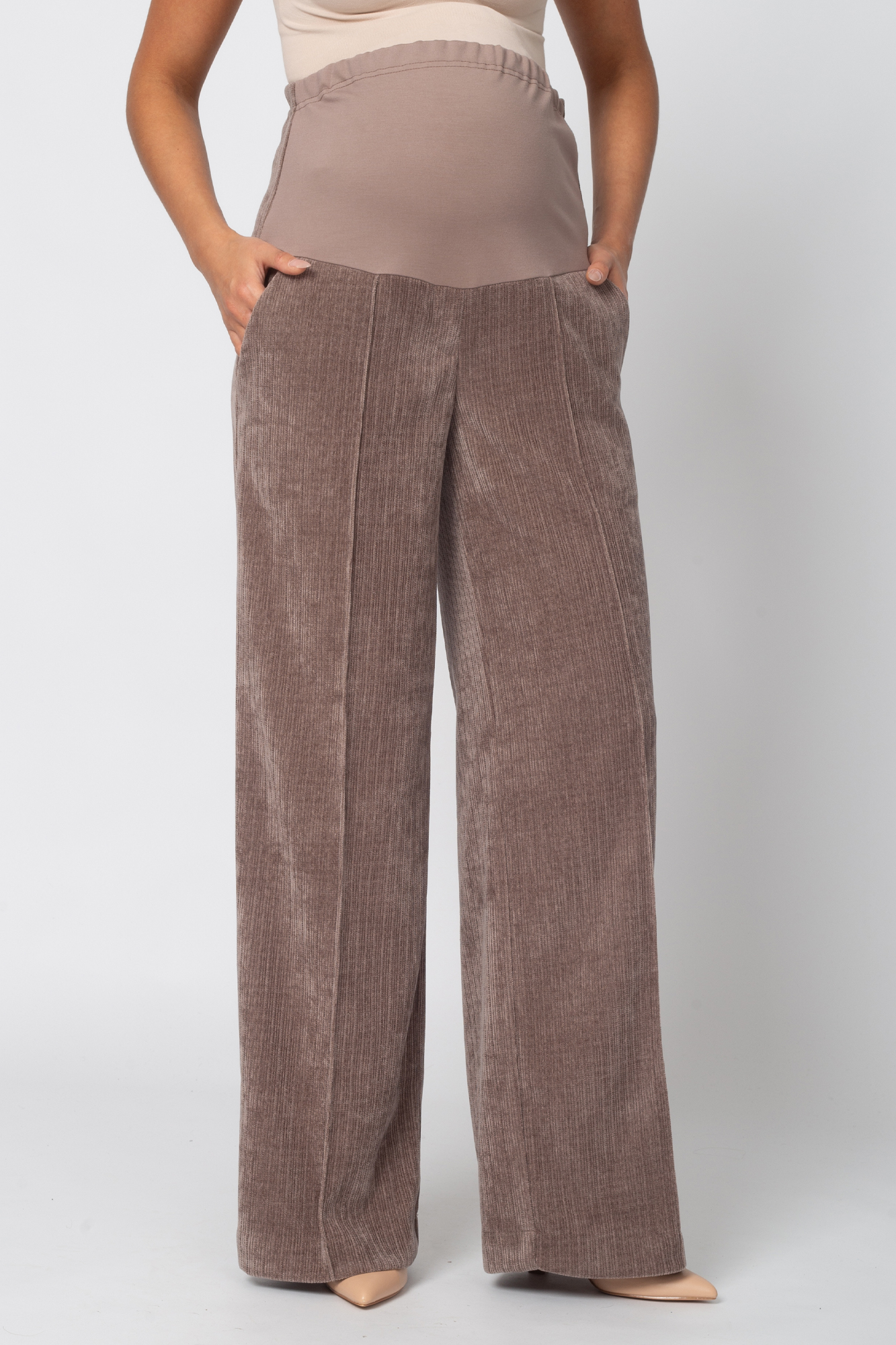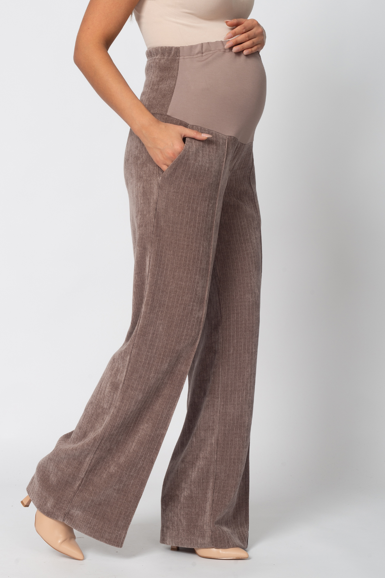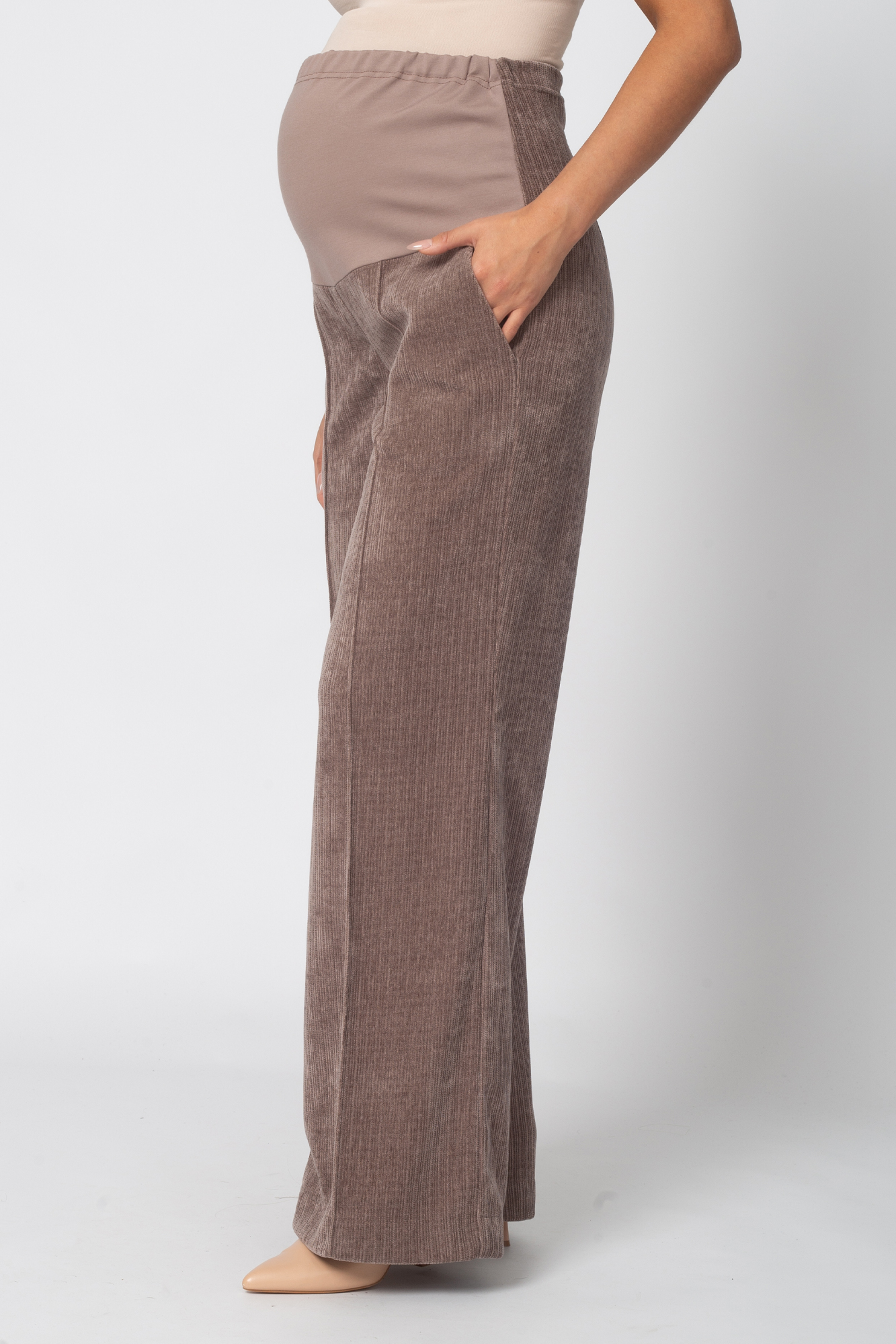 Вельветовые брюки для беременных сшиты из премиального трикотажа джерси-вельвет с выразительной текстурой в рубчик. В составе ткани — вискоза и полиэстер, которые обеспечивают высокую износостойкость, устойчивость к появлению катышек и усадке, а также приятные тактильные ощущения и комфорт в носке.Брюки выполнены в формате классики: прямой силуэт, высокая посадка, элегантная линия брючин. Высокий эластичный пояс с регулировкой объема на резинке обеспечивает идеальную посадку на любом сроке беременности и позволяет носить брюки в течение всей осени, а также в другие сезоны — модель всесезонная и отлично подойдёт на любую погоду.