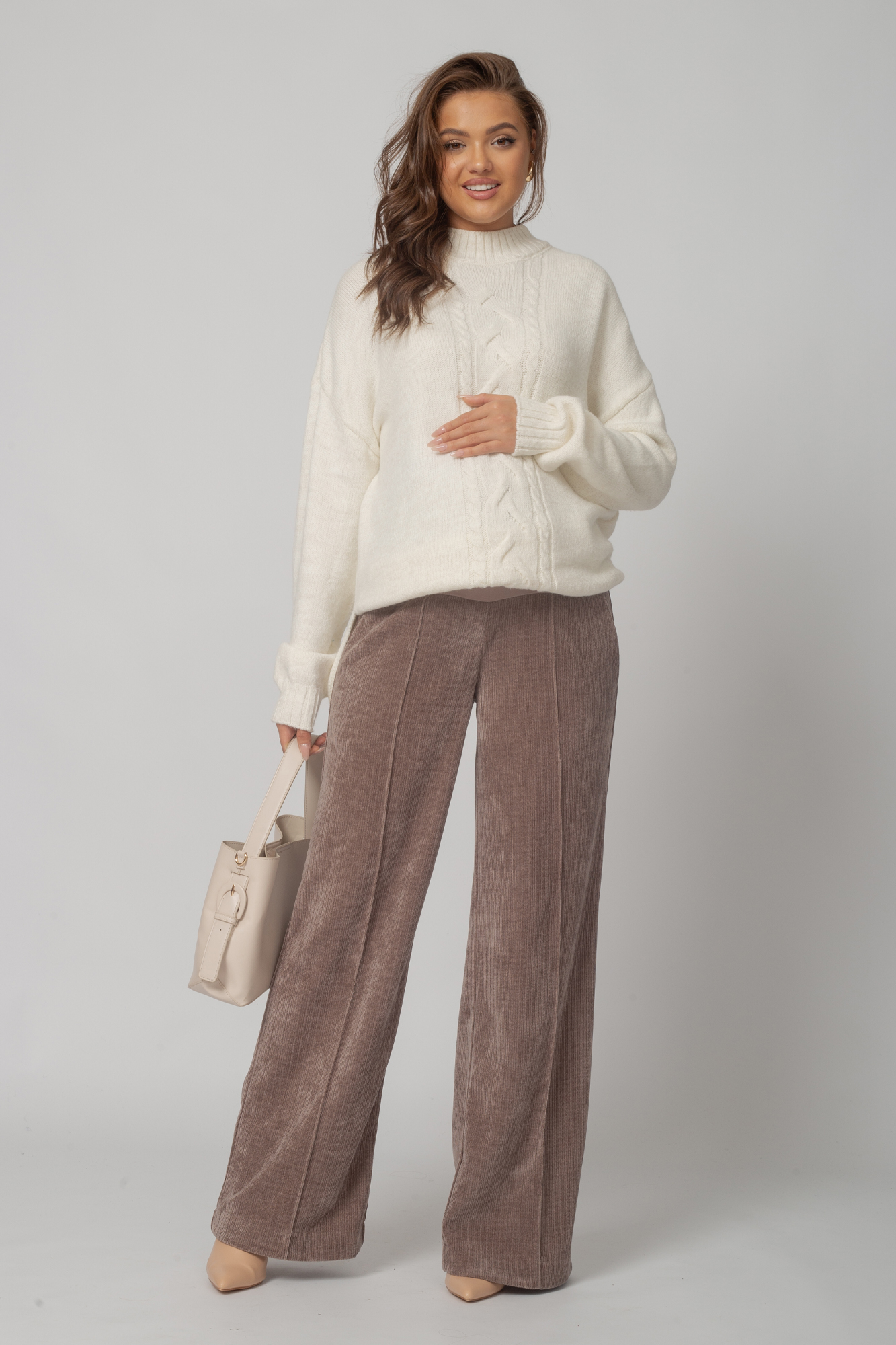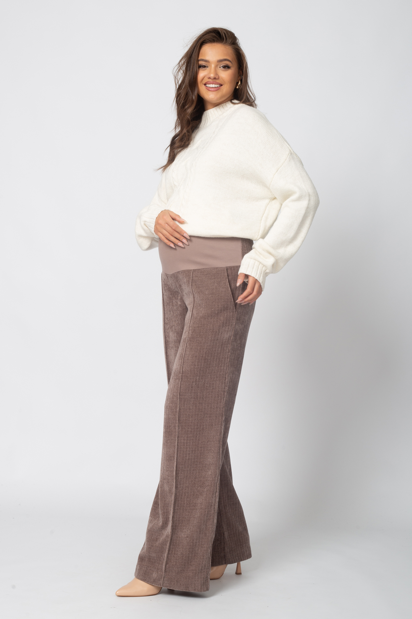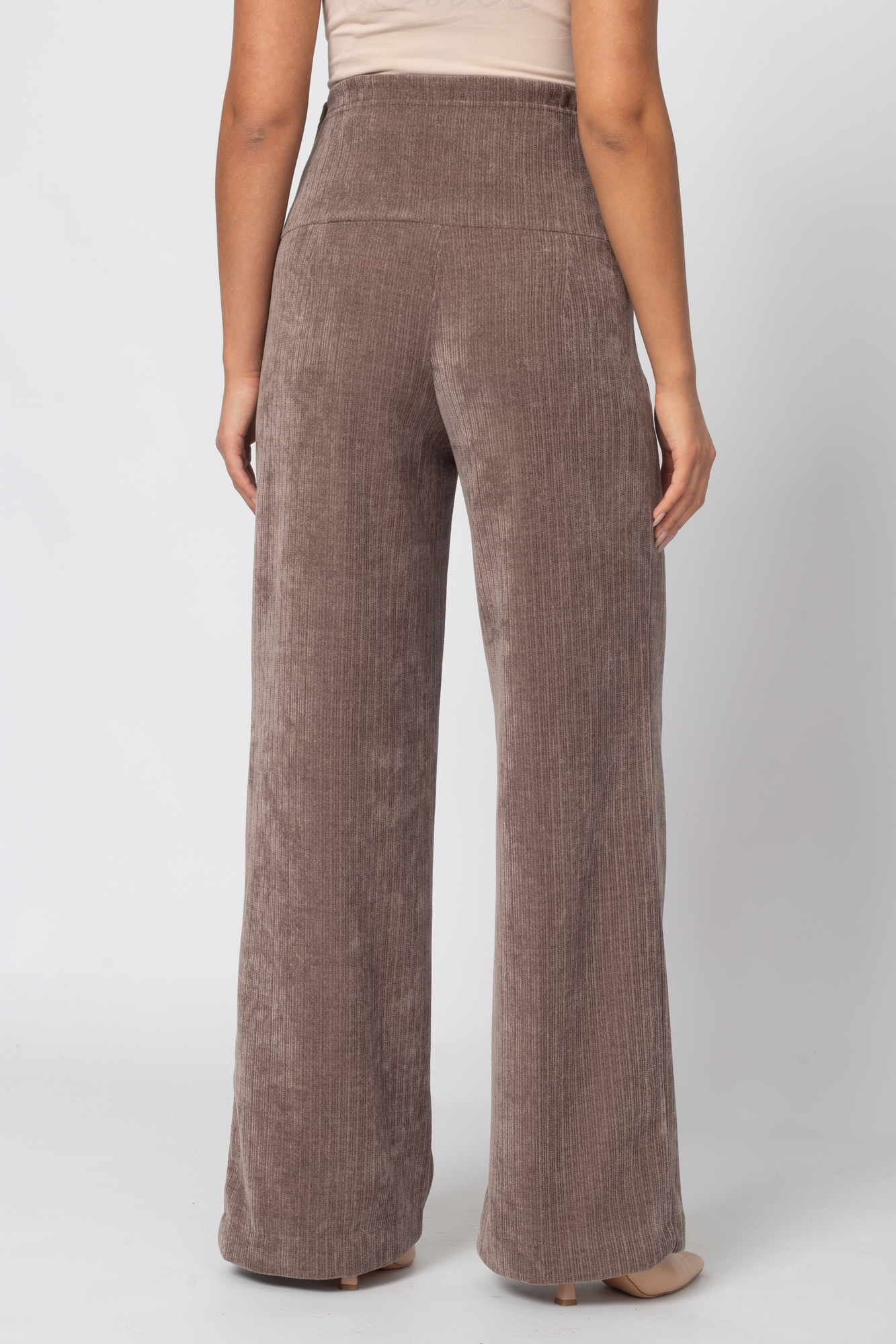 Вельветовые брюки для беременных сшиты из премиального трикотажа джерси-вельвет с выразительной текстурой в рубчик. В составе ткани — вискоза и полиэстер, которые обеспечивают высокую износостойкость, устойчивость к появлению катышек и усадке, а также приятные тактильные ощущения и комфорт в носке.Брюки выполнены в формате классики: прямой силуэт, высокая посадка, элегантная линия брючин. Высокий эластичный пояс с регулировкой объема на резинке обеспечивает идеальную посадку на любом сроке беременности и позволяет носить брюки в течение всей осени, а также в другие сезоны — модель всесезонная и отлично подойдёт на любую погоду.