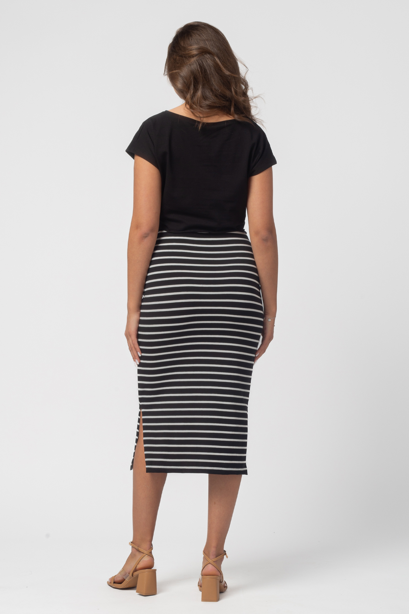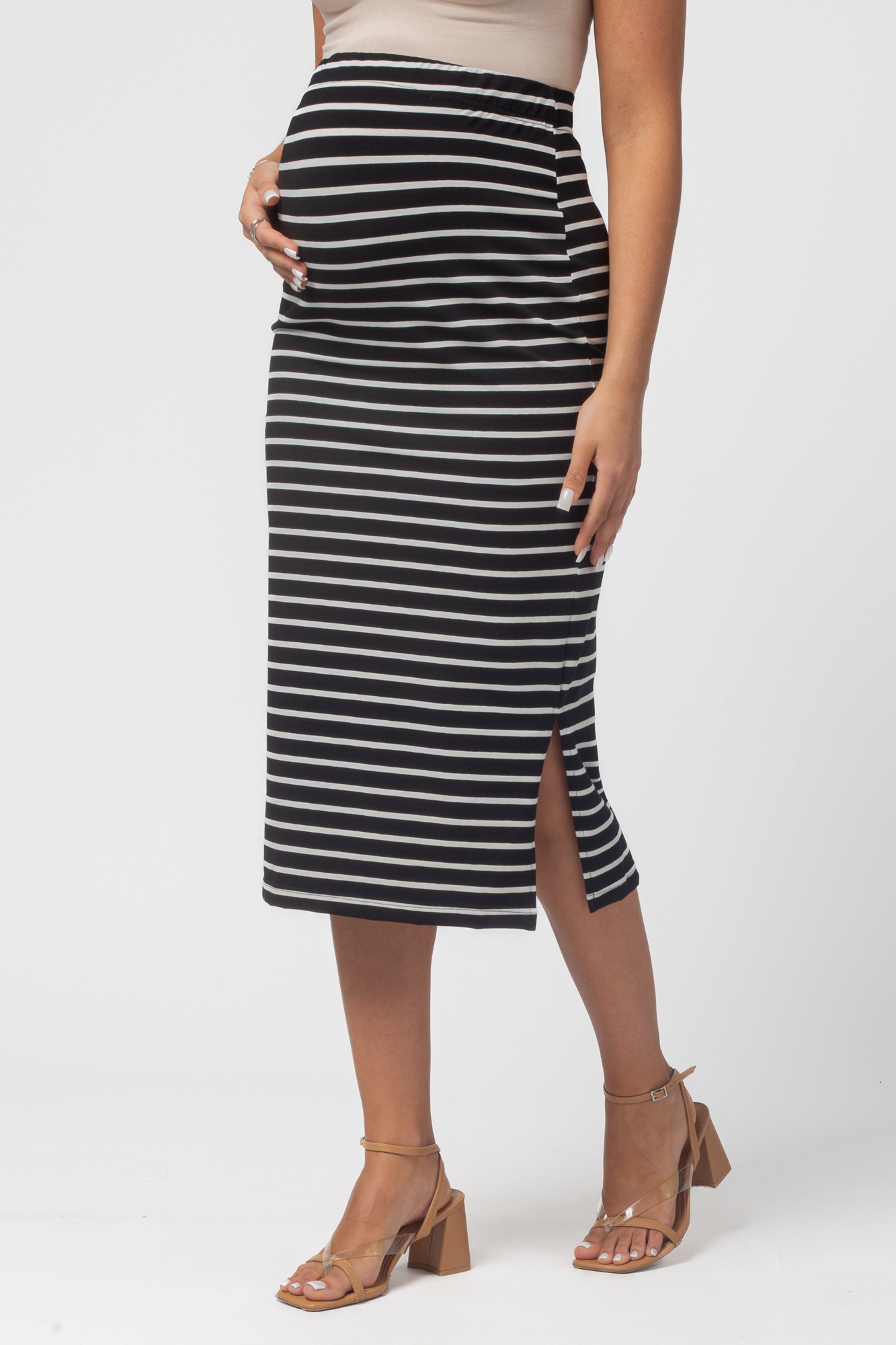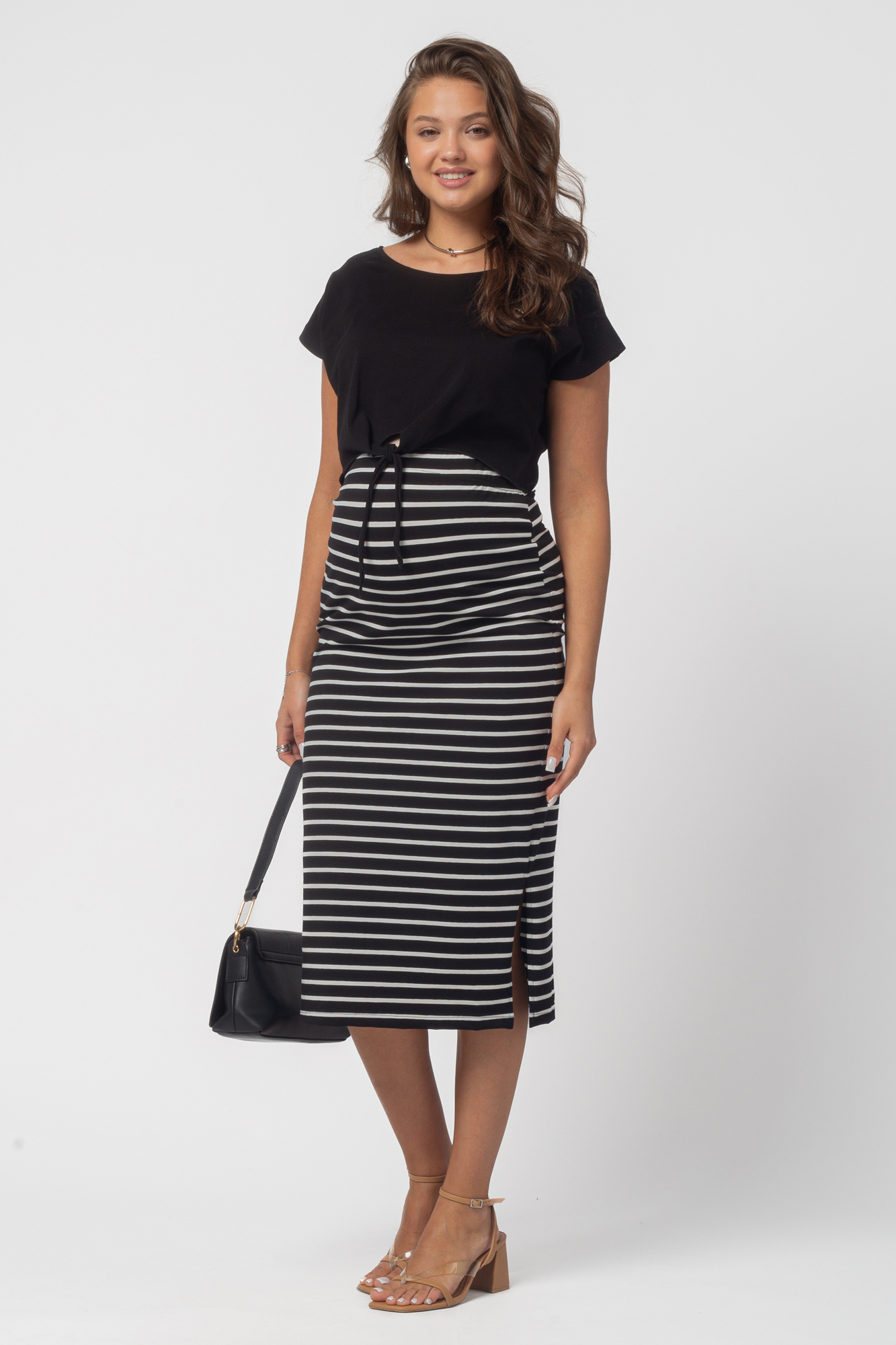 Стильный комплект для беременных состоит из футболки и трикотажной юбки. Футболка-топ с завязками выполнена из хлопка с добавлением эластана. С ним не нарушается кожное дыхание, легко происходит впитывание и испарение влаги. В такой одежде вы будете чувствовать себя комфортно и легко. Особый крой позволяет носить изделие на всем протяжении беременности. Эластичная юбка с завышенной талией мягко облегает и не сдавливает живот. Разрезы по бокам изделия обеспечат свободу движений. Футболку и юбку можно носить как вместе, так и сочетать с другими элементами гардероба.