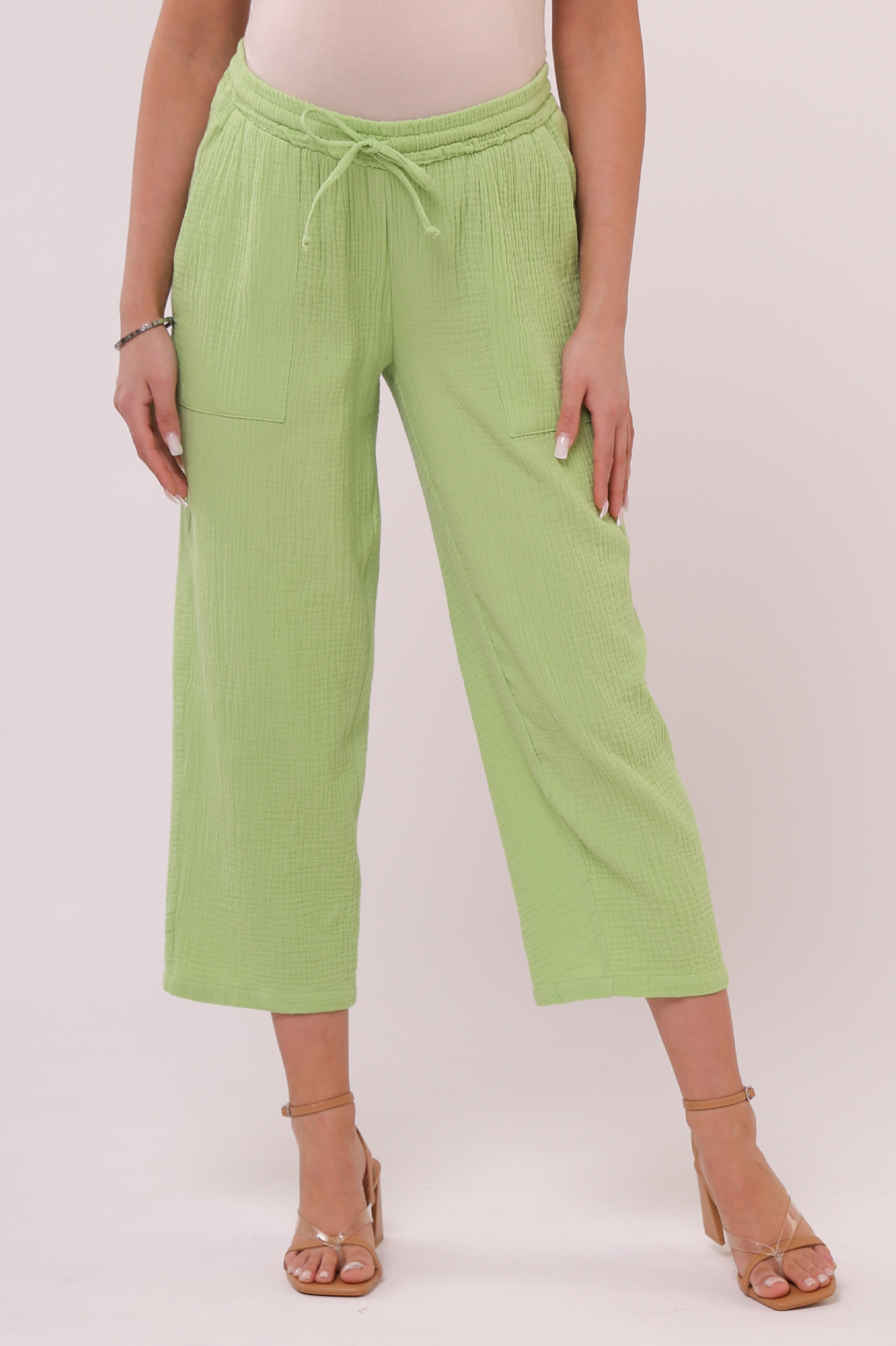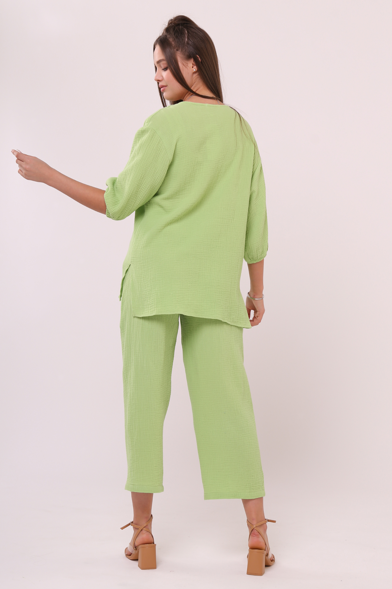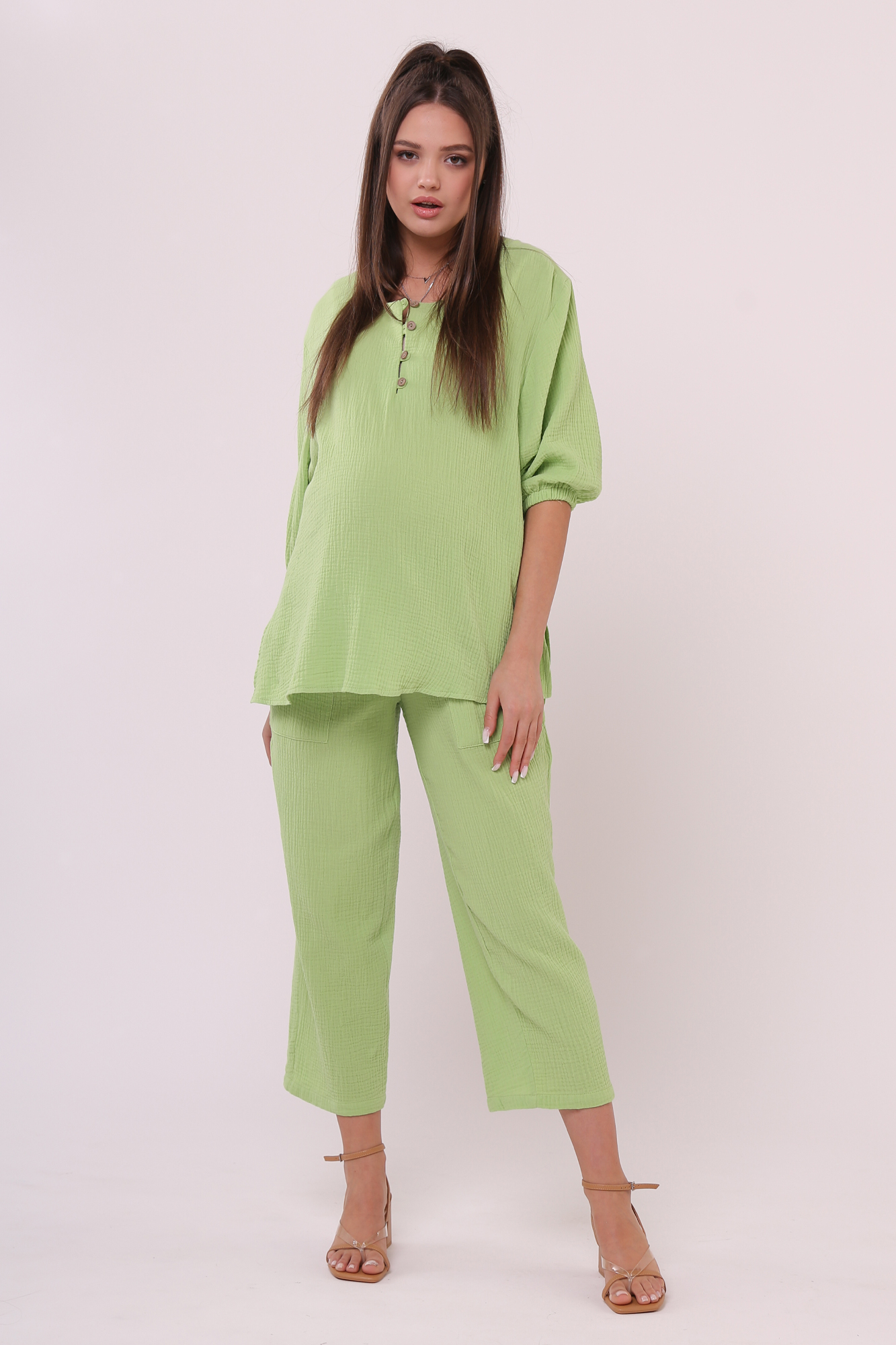 Стильный костюм для беременных из хлопокового муслина идеально подойдет на теплую весну и лето. Фактурная тканьна основе хлопка дышит, не раздражает кожу, легко впитывает влагу. В комплект входит две вещи: блузка с рукавом 3/4 на резинке и брюки кюлоты. Кофта с удлиненной спинкой, небольшими разрезами по бокам, круглой горловиной, украшена пугов. Штаны свободного кроя и укороченной длины оснащены низким поясом с мягкой резинкой и шнуровкой для регулировки объема. Легкий костюм можно носить на любом месяце беременности и после рождения малыша. Летний костюм с широкими укороченными брюками подойдет для повседневной носки, станет удобным нарядом для офиса, встречи с друзьями или на выписку. Костюм в духе oversize выполнен в стандартной размерной линейке и представлен в двух пастельных однотонных расцветках.