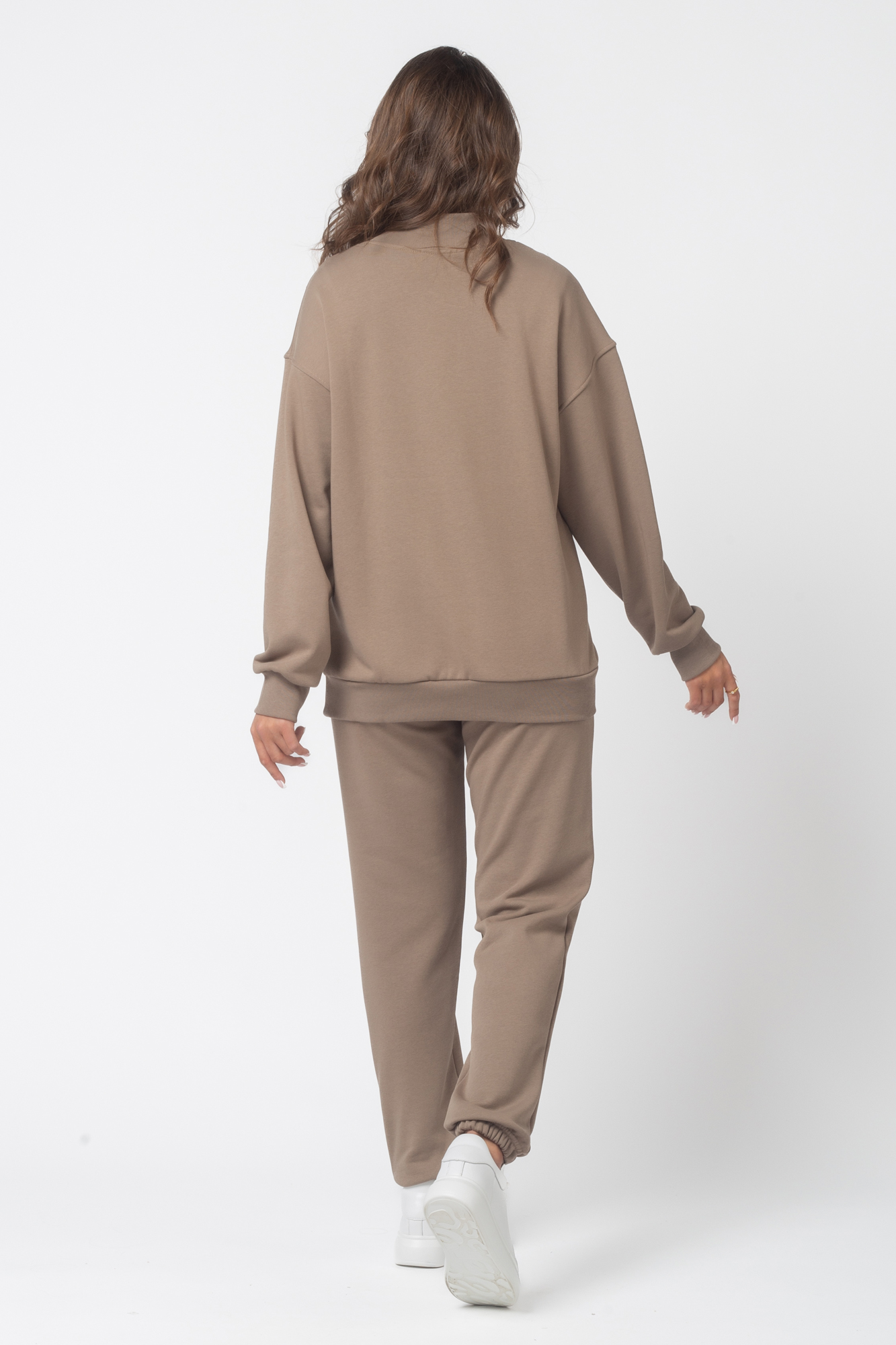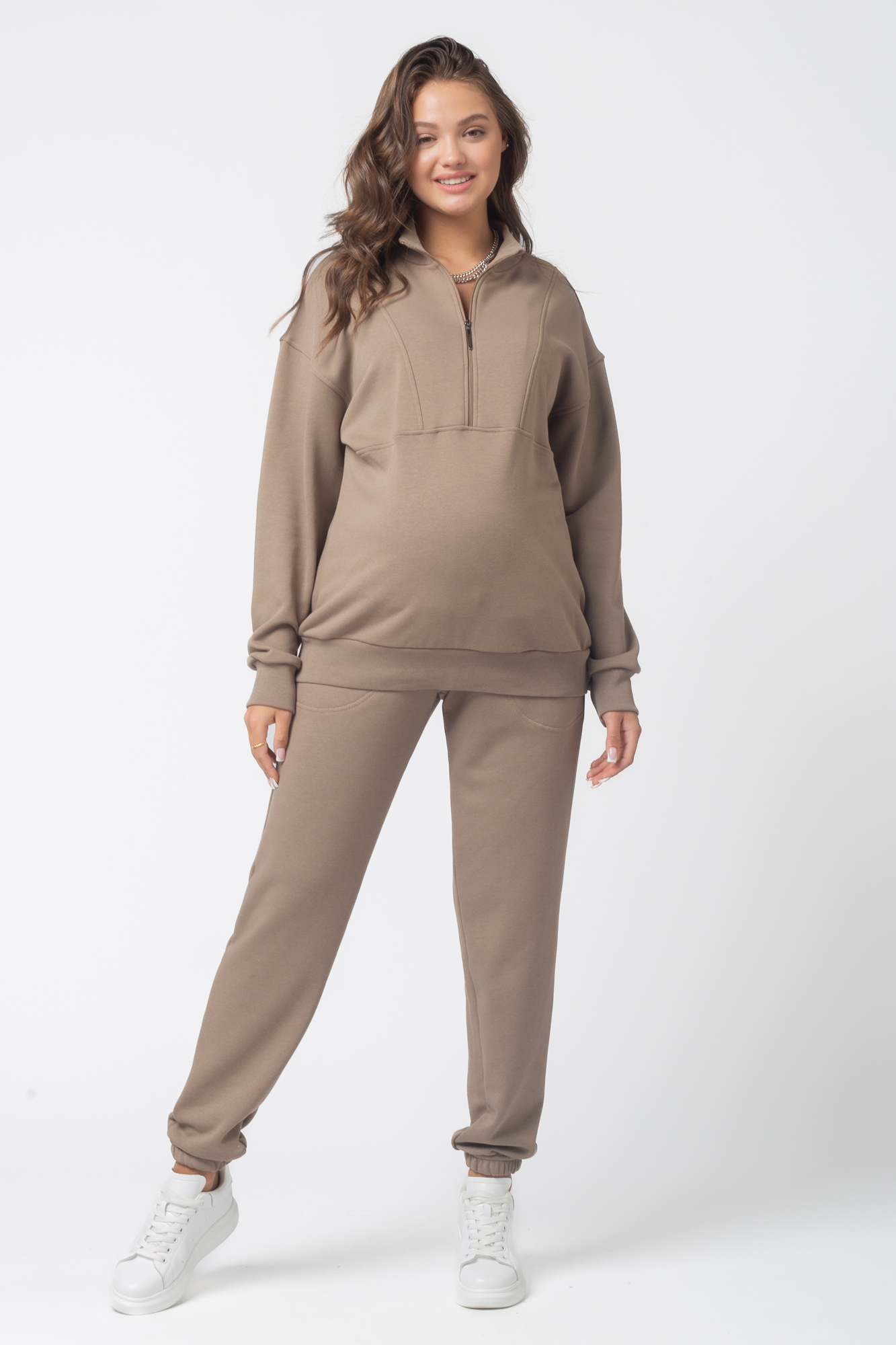 Cтильный костюм для беременных выполнен из трехниточного футера премиум-класса. Мягкий и дышащий материал поддерживает нормальную терморегуляцию и впитывает влагу. Комплект состоит из двух вещей: брюк и свитшота. Брюки джоггеры оснащены высокой эластичной вставкой для живота с возможностью регулировки объема (за счет резинки на пуговице), украшены функциональными боковыми карманами. Свитшот свободного кроя с воротником. Для комфортного кормления предусмотрена вертикальная молния. Костюм подходит для ношения на любом месяце беременности и после родов. Модель из хлопкового трикотажа - идеальный вариант повседневного образа для будущей мамы на весну и прохладное лето. Универсальный и нарядный комплект подойдет для прогулок, выписки из роддома, занятий спортом, путешествий и просто на каждый день.