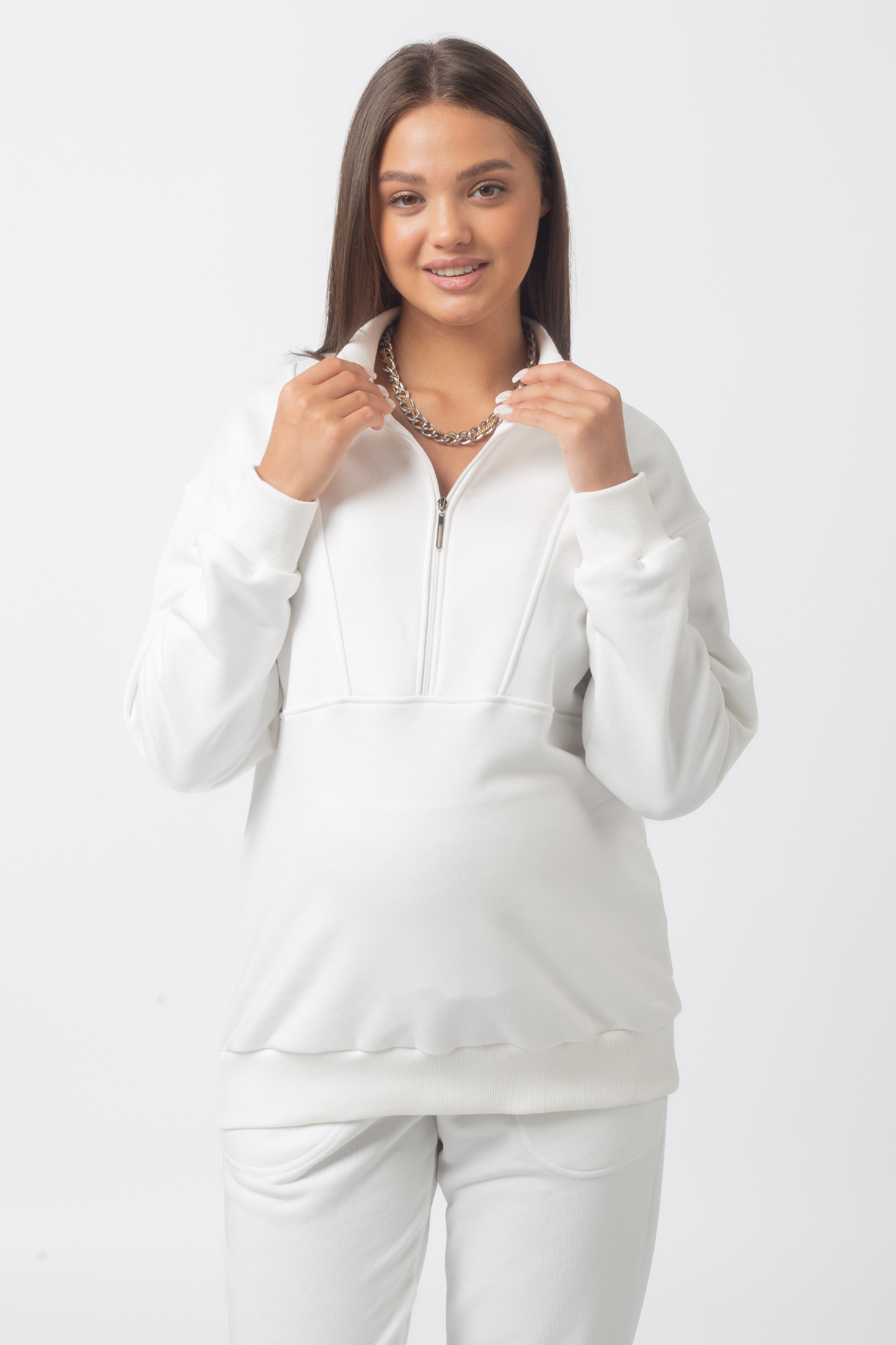 Cтильный костюм для беременных выполнен из трехниточного футера премиум-класса. Мягкий и дышащий материал поддерживает нормальную терморегуляцию и впитывает влагу. Комплект состоит из двух вещей: брюк и свитшота. Брюки джоггеры оснащены высокой эластичной вставкой для живота с возможностью регулировки объема (за счет резинки на пуговице), украшены функциональными боковыми карманами. Свитшот свободного кроя с воротником. Для комфортного кормления предусмотрена вертикальная молния. Костюм подходит для ношения на любом месяце беременности и после родов. Модель из хлопкового трикотажа - идеальный вариант повседневного образа для будущей мамы на весну и прохладное лето. Универсальный и нарядный комплект подойдет для прогулок, выписки из роддома, занятий спортом, путешествий и просто на каждый день.