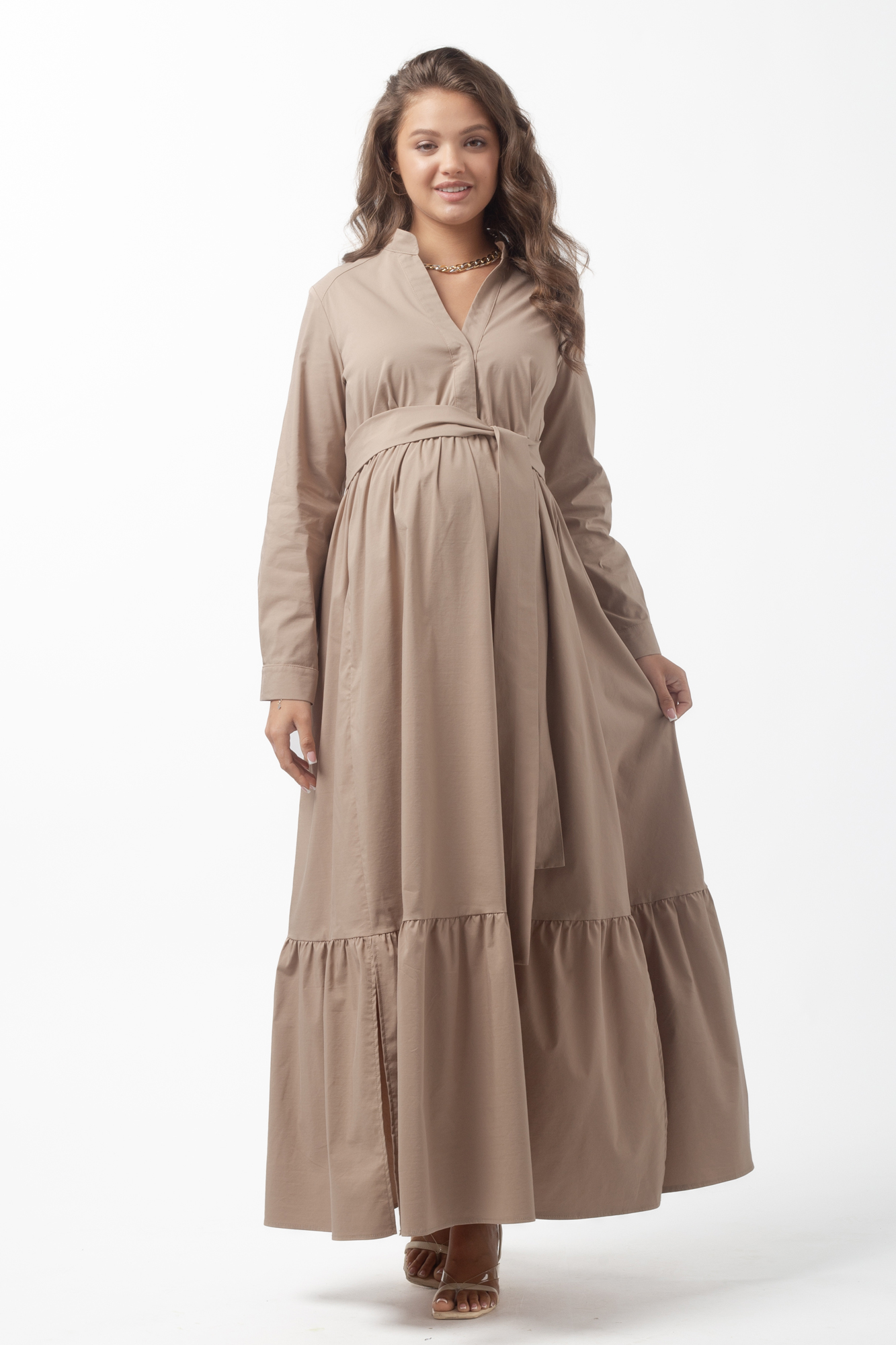 Стильное длинное платье для беременных. Отложной воротник, широкий волан по низу изделия. Платье для будущих мам подходит на любой срок беременности и идеально сидит на фигуре. Длина макси делает его комфортным и отлично подчеркнет Вашу женственность. Базовый крой дает возможность стилизовать его от спортивного платья до вечернего и нарядного, подчеркнув образ аксессуарами; носить его как повседневное, а также в офис, в театр, на прогулки. Легкое платье отлично впишется в летний пляжный гардероб, пригодится на море и создаст незабываемое отпускное настроение.