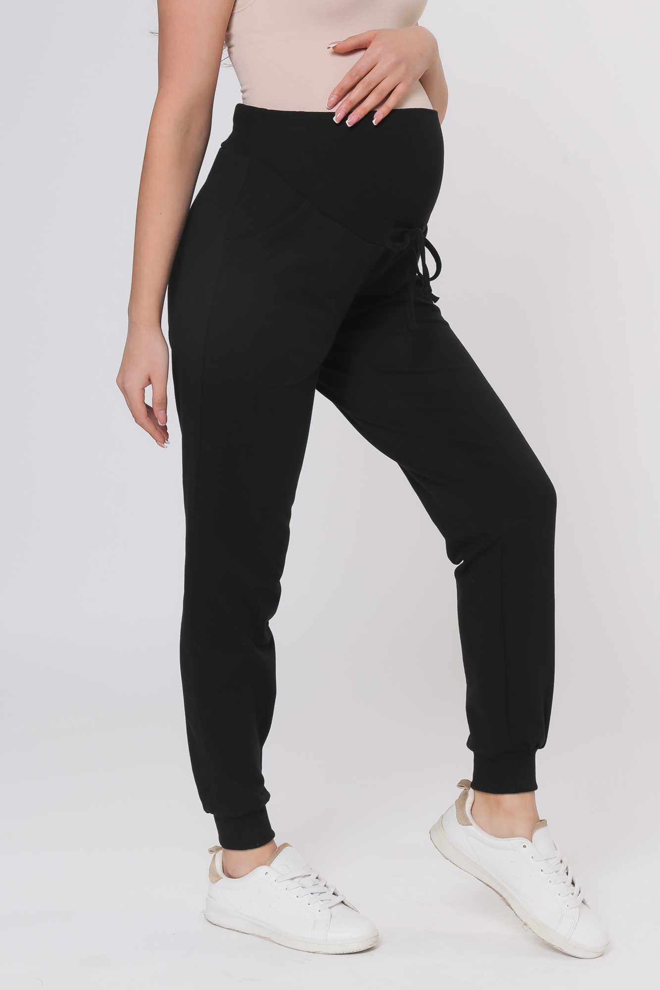 Спортивные брюки для беременных из двухниточного футера (пенье). Высокий эластичный бандаж мягко и деликатно поддерживает растущий животик. Объем регулируется шнурками в поясе и перфорированной резинкой, перестегивающейся на пуговицу, что позволяет носить брюки от начала до конца беременности и после родов. Длина регулируется подворотом брючины и подходит на любой рост. Невероятно комфортная модель для прогулок, занятий спортом и просто на каждый день.
