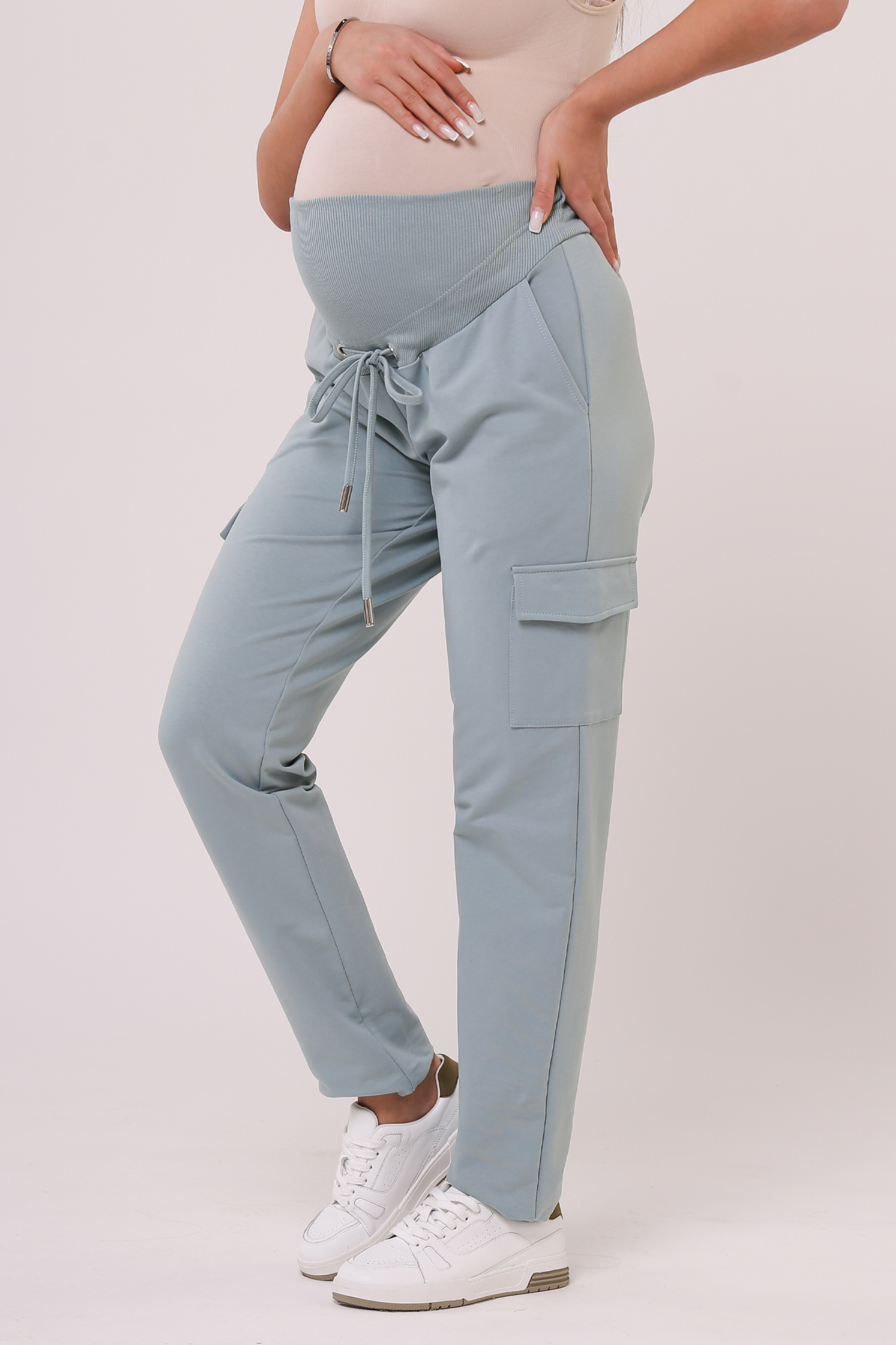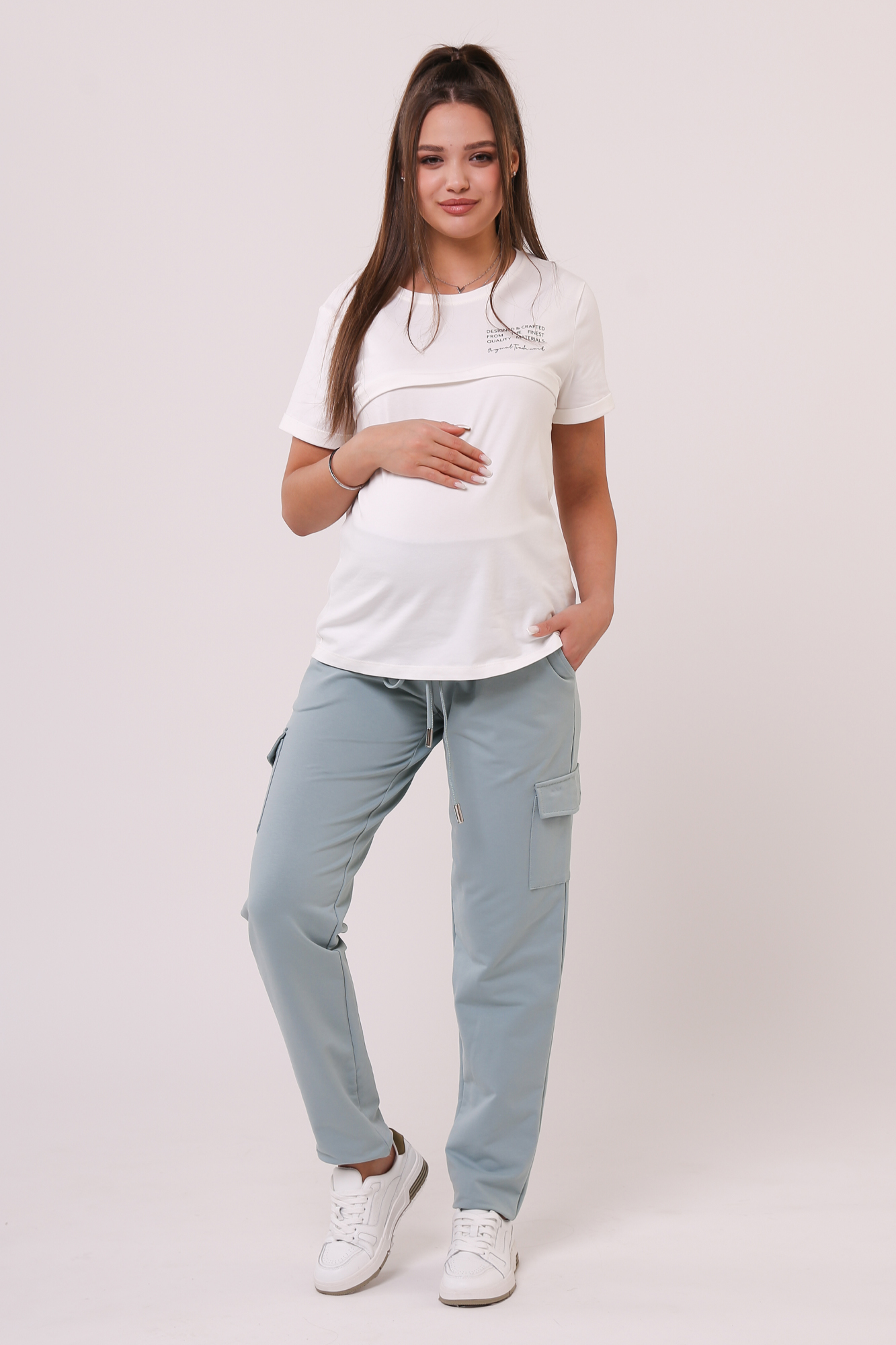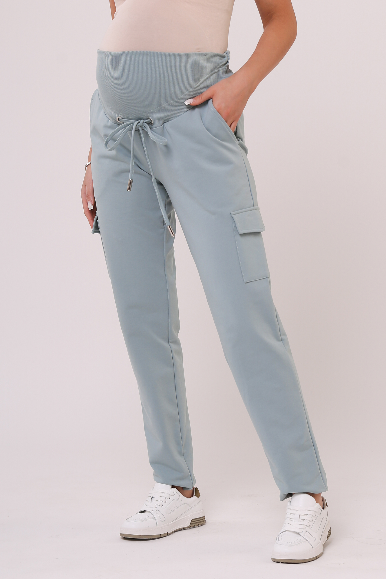 Зауженные спортивные брюки из высококачественного двухниточного футера для беременных. Высокий эластичный бандаж мягко и деликатно поддерживает растущий животик. Объем регулируется шнурками в поясе и перфорированной резинкой, перестегивающейся на пуговицу, что позволяет носить брюки от начала до конца беременности и после родов. Невероятно комфортная модель для прогулок, занятий спортом и просто на каждый день.