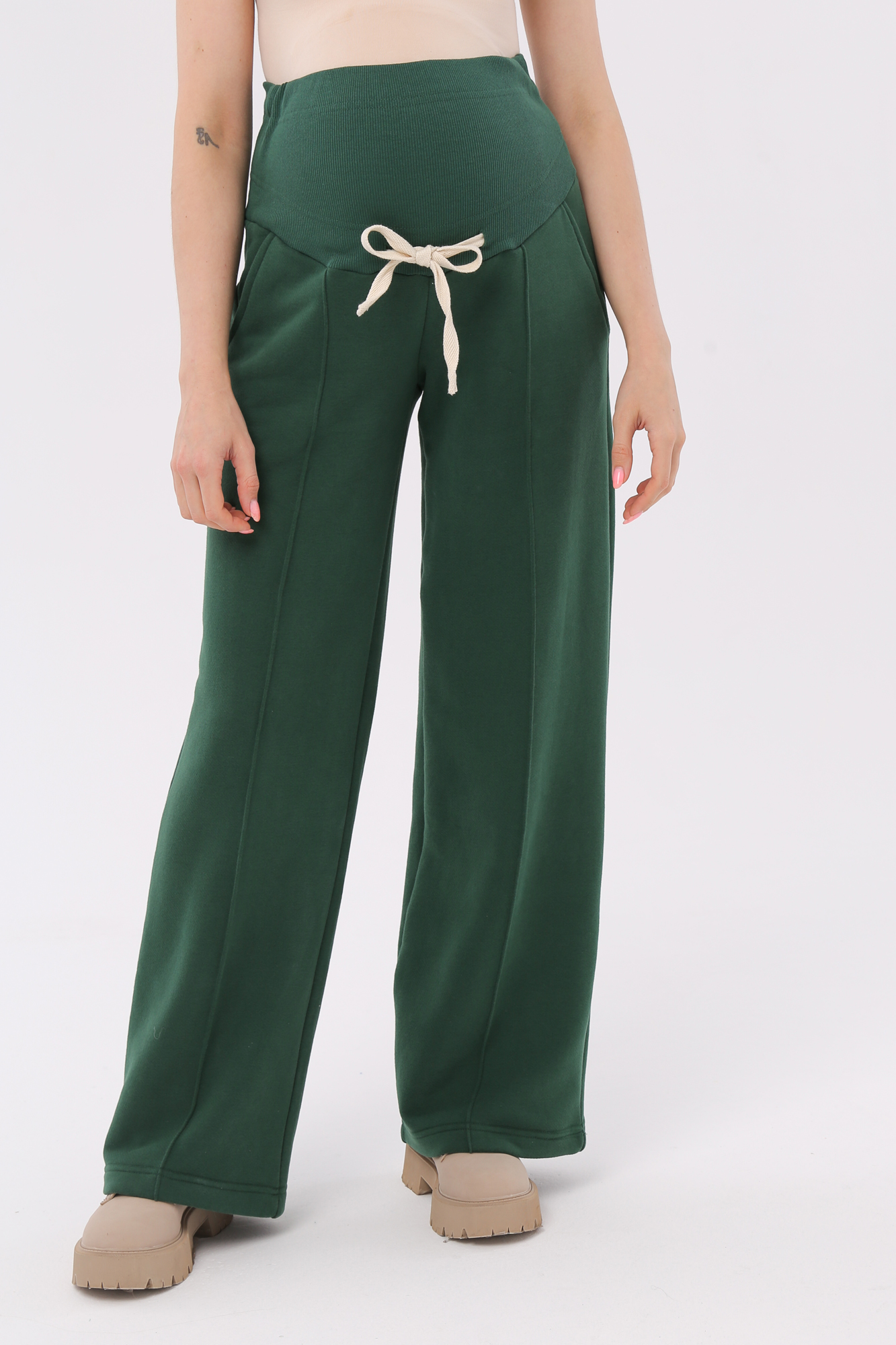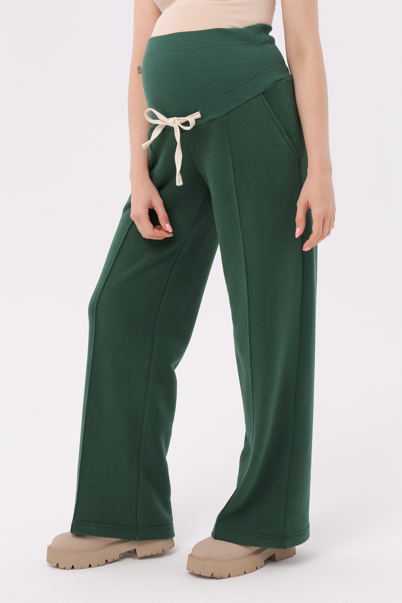 Стильные повседневные брюки для беременных из футера велюра c начесом. Высокий эластичный бандаж мягко и деликатно поддерживает растущий животик. Объем регулируется шнурками в поясе и перфорированной резинкой, перестегивающейся на пуговицу, что позволяет носить брюки от начала до конца беременности и после родов. Невероятно комфортная модель для прогулок, занятий спортом и просто на каждый день.