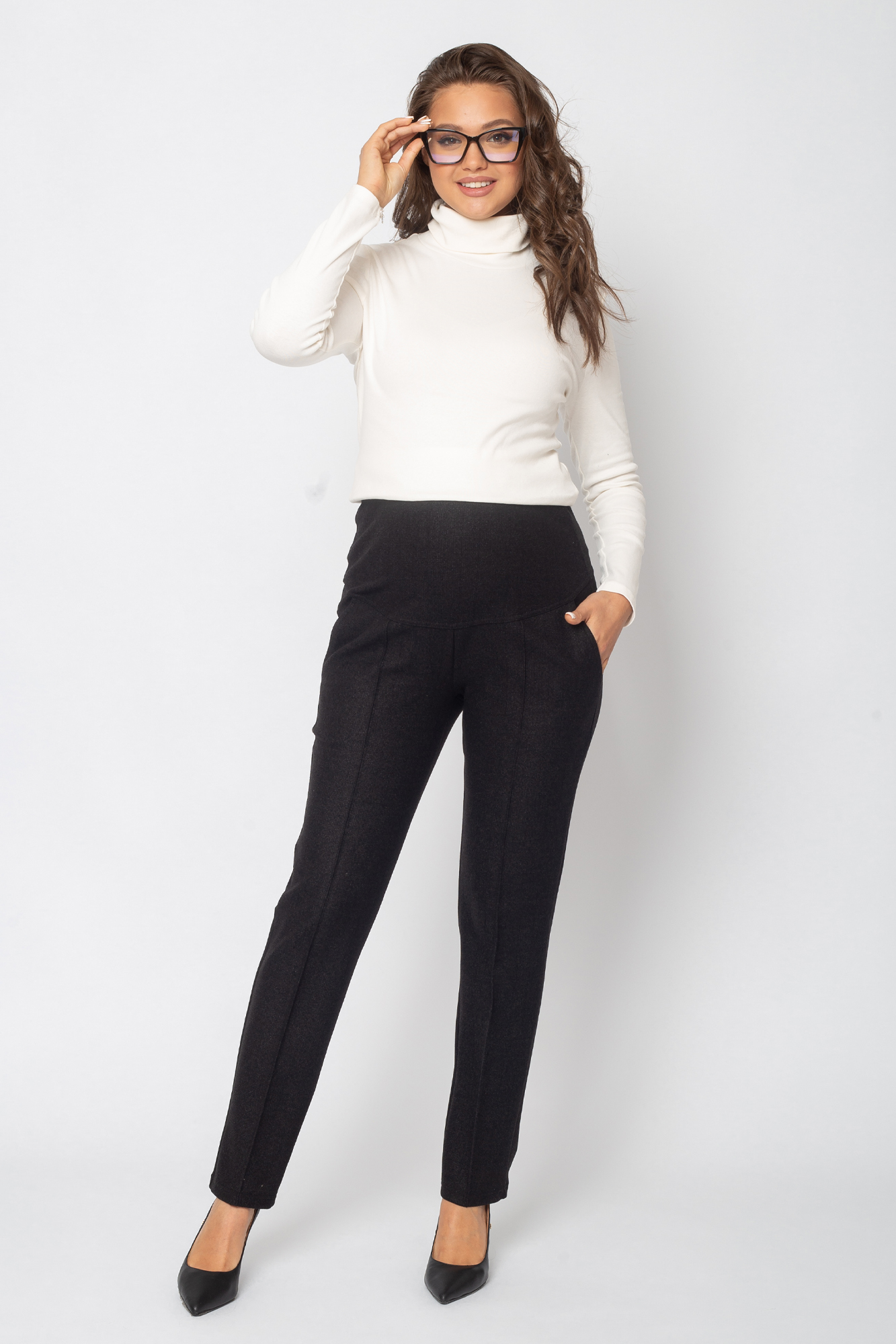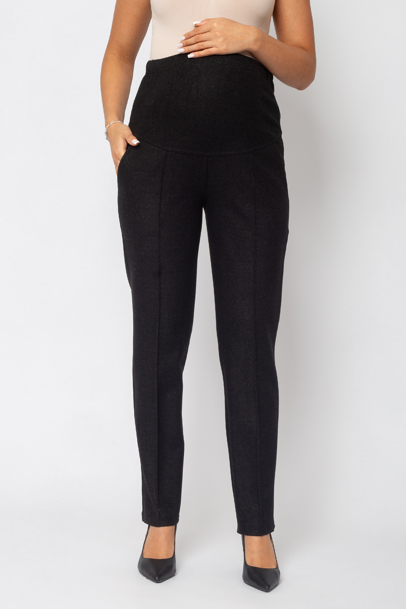 Зауженные брюки для беременных сшиты из теплого трикотажа джерси с начесом. Состав: 65% Вискоза 30% Полиэстер 5% Лайкра. Стильная трикотажная модель для повседневного гардероба будущей мамы. Женские зимние брюки с завышенной талией оснащены поясом, выполняющим функцию бандажа. Пояс можно регулировать по мере роста животика с помощью скрытой резинки на пуговице. Такие штаны подойдут на любой срок беременности, а также и после нее. Крой брюк зауженный, спереди - отстроченные стрелки, высокая посадка. Предусмотрены карманы. Классические брюки отлично подходят для повседневных прогулок холодной осенью или зимой. В них будет комфортно в любую погоду или для офиса. Модель подойдет в качестве одежды женщинам больших размеров.
