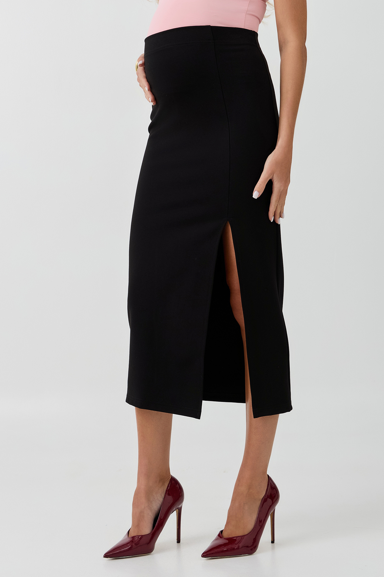 Юбка для беременных выполнена из трикотажной ткани джерси. Ткань приятна на ощупь и не вызывает дискомфорта, что особенно важно для чувствительной кожи во время беременности. Особый крой позволяет носить изделие на протяжении всей беременности. Эластичная юбка карандаш с завышенной талией мягко облегает и не сдавливает живот. Разрез сбоку изделия обеспечит свободу движений.