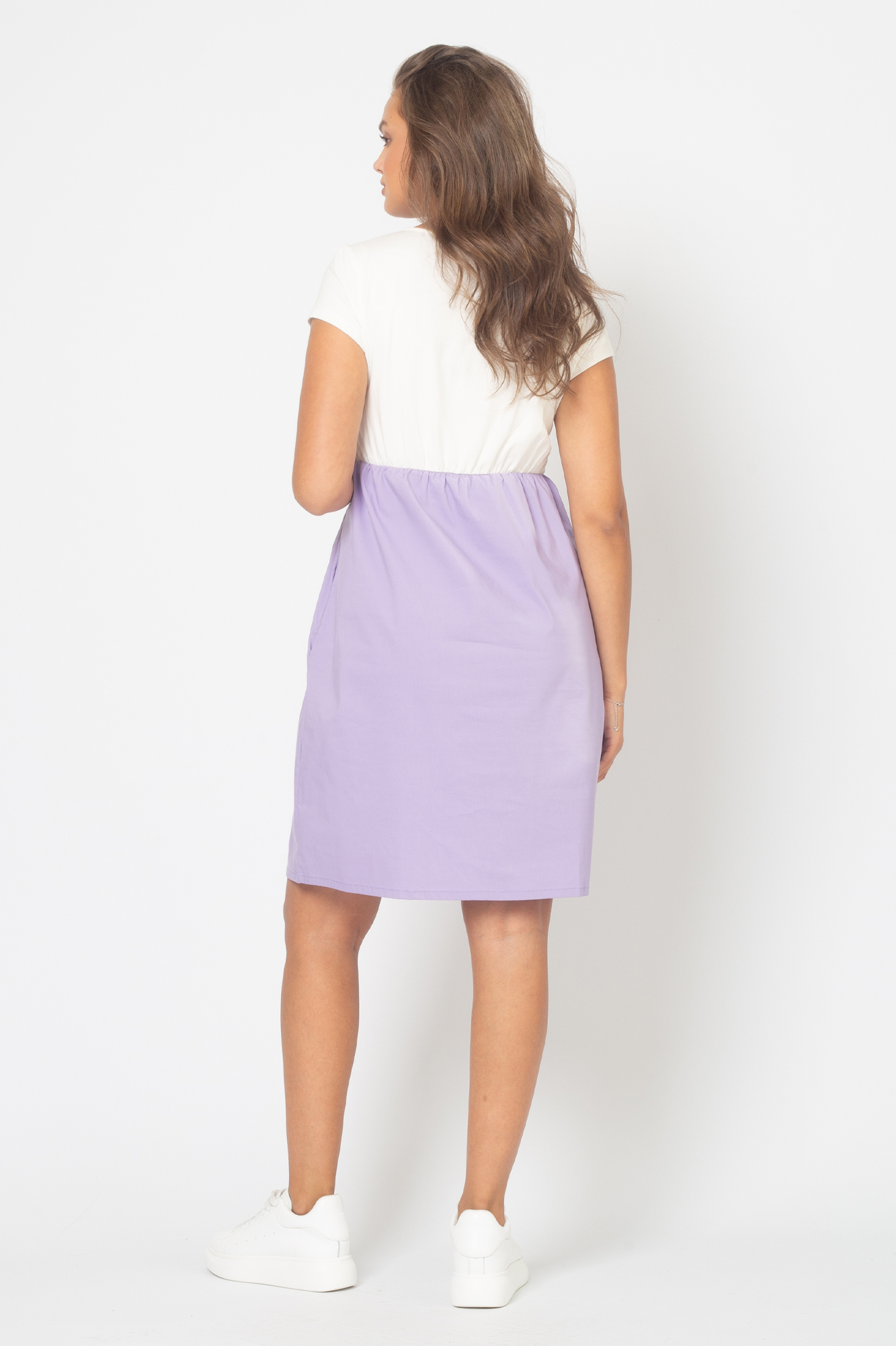 Летнее платье в стиле casual из комбинированных тканей для беременных и кормящих. Верхняя часть изделия выполнена из высококачественной кулирной глади пенье, нижняя - из хлопка. С ним не нарушается кожное дыхание, легко происходит впитывание и испарение влаги. В такой одежде вы будете чувствовать себя комфортно и легко. Детали: округлый вырез горловины, короткий рукав, практичная длина. Платье идеально подчеркивает округлившийся животик, но при этом не сковывает движений. Благодаря встречным потайным молниям под грудью Вам удастся покормить малыша с комфортом в любой ситуации. Платье прекрасно сидит на любом сроке беременности, а после родов скроет временные несовершенства фигуры.