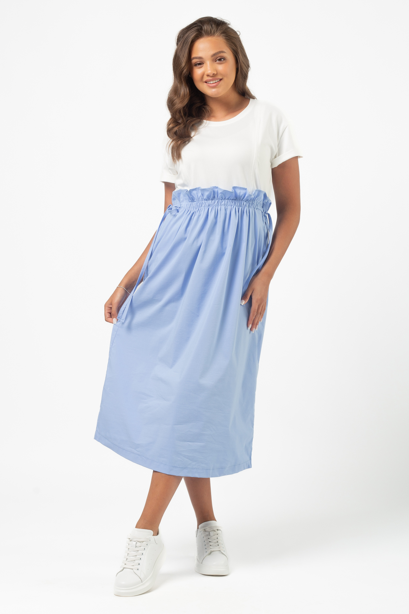 Летнее платье в стиле casual из комбинированных тканей для беременных и кормящих. В такой одежде вы будете чувствовать себя комфортно и легко. Детали: округлый вырез горловины, короткий рукав, практичная длина. Благодаря встречным потайным молниям под грудью Вам удастся покормить малыша с комфортом в любой ситуации. Платье прекрасно сидит на любом сроке беременности, а после родов скроет временные несовершенства фигуры.