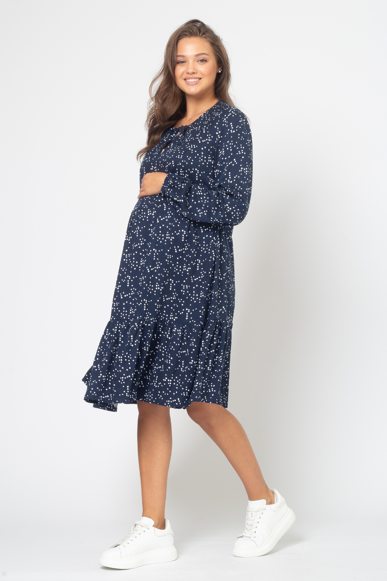 Женственное платье для беременных и кормящих мам выполнено из приятной к телу и хорошо дышащей вискозы создаст комфорт как для мамы, так и для малыша. Платье женское повседневное для работы в офисе, деловых встреча, романтических свиданий и просто на каждый день. Незаметные потайные молнии обеспечат легкий доступ к груди и удобное кормление малыша, а также позволят носить платье с секретом для кормления даже после завершения грудного вскармливания. На модели длинный воздушный рукав на резинке, округлый вырез горловины с завязками. Свободный силуэт оверсайз позволяет носить его на любом сроке беременности, а после рождения малыша скроет временные несовершенства фигуры. Платье трапеция для беременных и кормящих мам на праздник и выписку из роддома. Нарядное праздничное платье вечернее летящего силуэта будущим мамам.