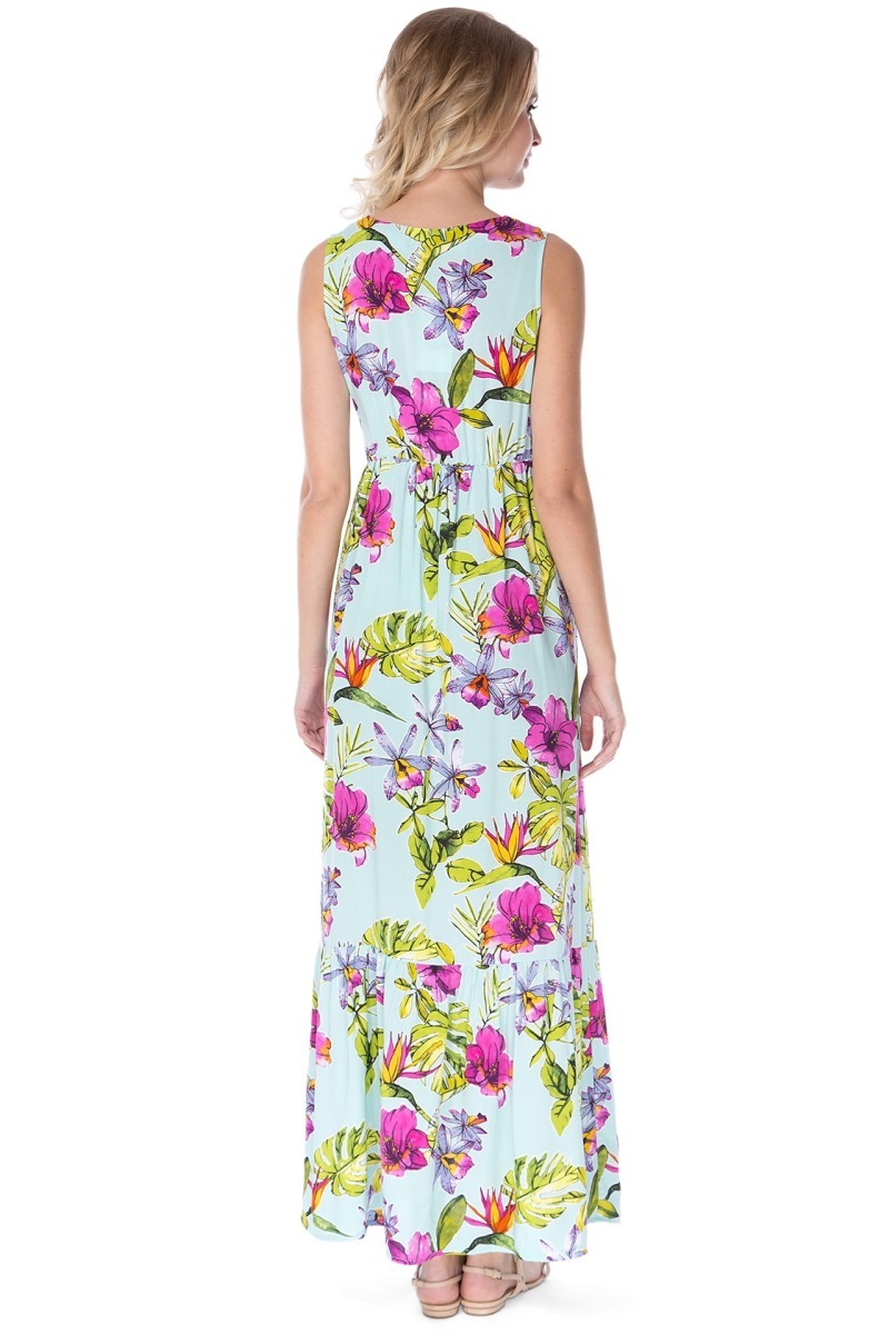 Очаровательное платье макси-длины с цветочным рисунком сшито из приятной к телу плательной ткани – штапеля. Высокая кокетка позволит носить платье на любом сроке беременности.