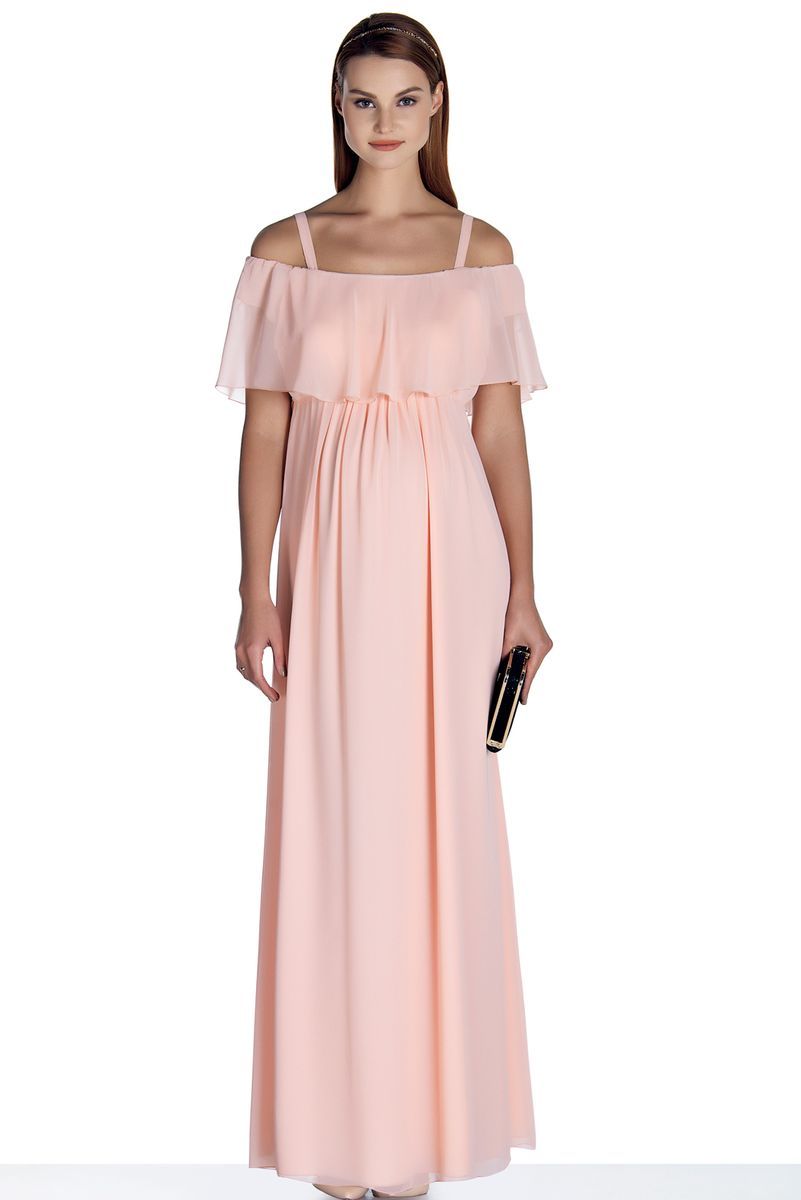 Олицетворение весеннего и летнего тепла вобрало в себя это вечернее платье.Воздушный широкий волан по верху лифа придает образу романтический вид.Завышенная линия талии и легкая струящаяся ткань поможет скрыть округлившийся животик на небольшом сроке.Подходит для выписки из роддома.