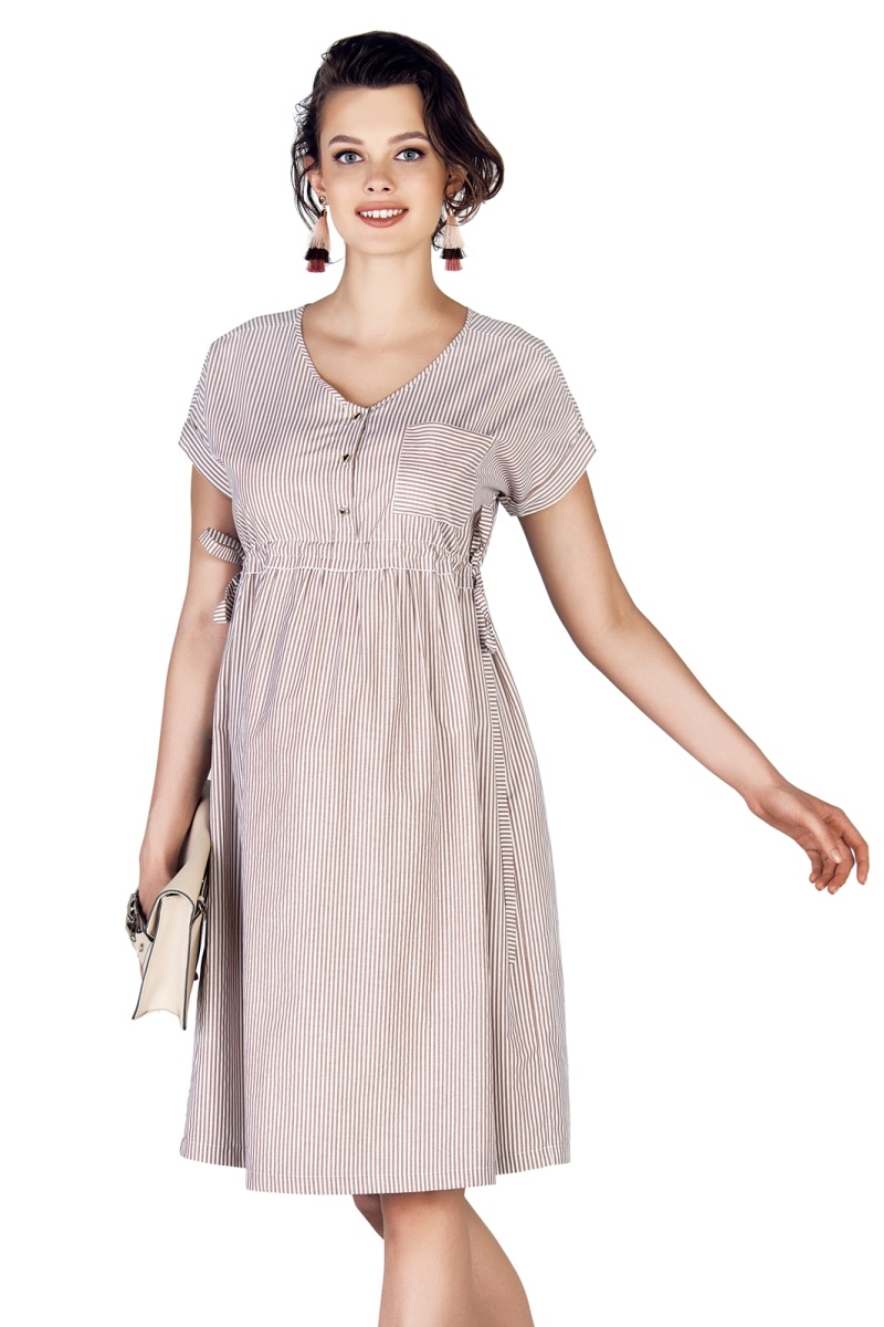 Легкое платье-рубашка для будущих мам. V-образный вырез горловины, короткий рукав, планка на пуговицах по переду, накладной карман на груди. Платье свободного кроя обеспечивает комфорт и предоставляет возможность носить его на всем протяжении беременности и после родов. Кулиски по бокам изделия позволят регулировать ширину платья под вашу фигуру, создавая приталенный силуэт.