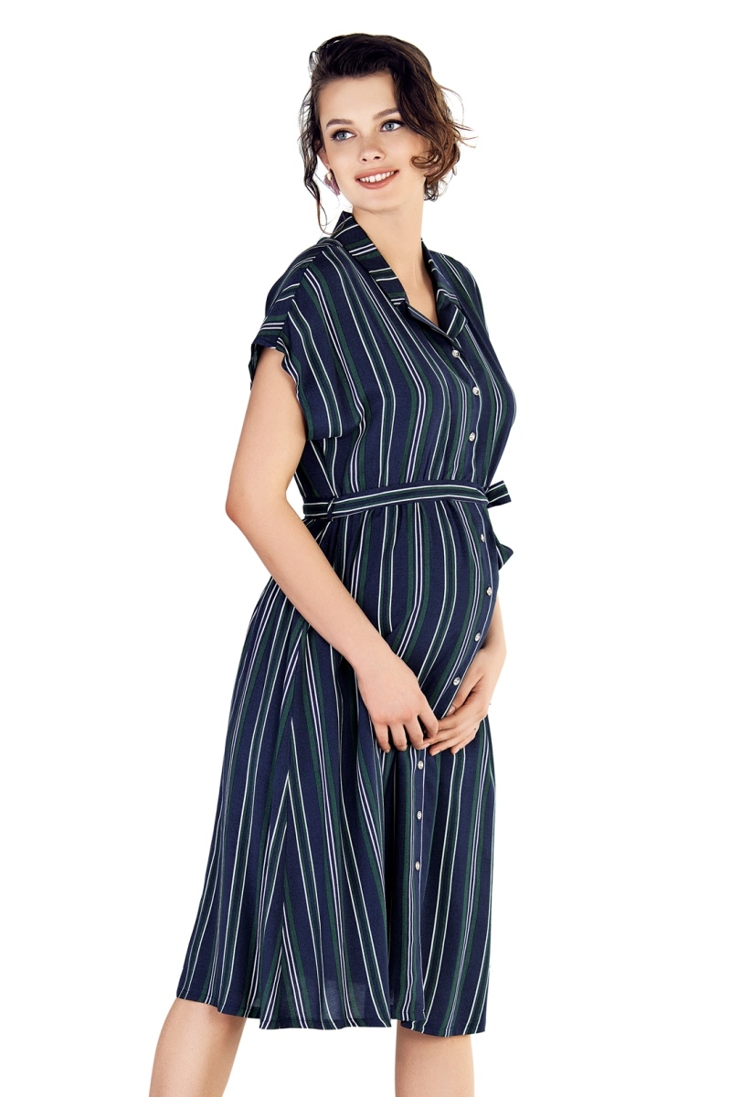 Легкое платье-рубашка для будущих мам. V-образный вырез горловины, короткий рукав, планка на пуговицах по переду. Платье свободного кроя обеспечивает комфорт и предоставляет возможность носить его на всем протяжении беременности и после родов. Поясок из той же ткани создаст приталенный силуэт.