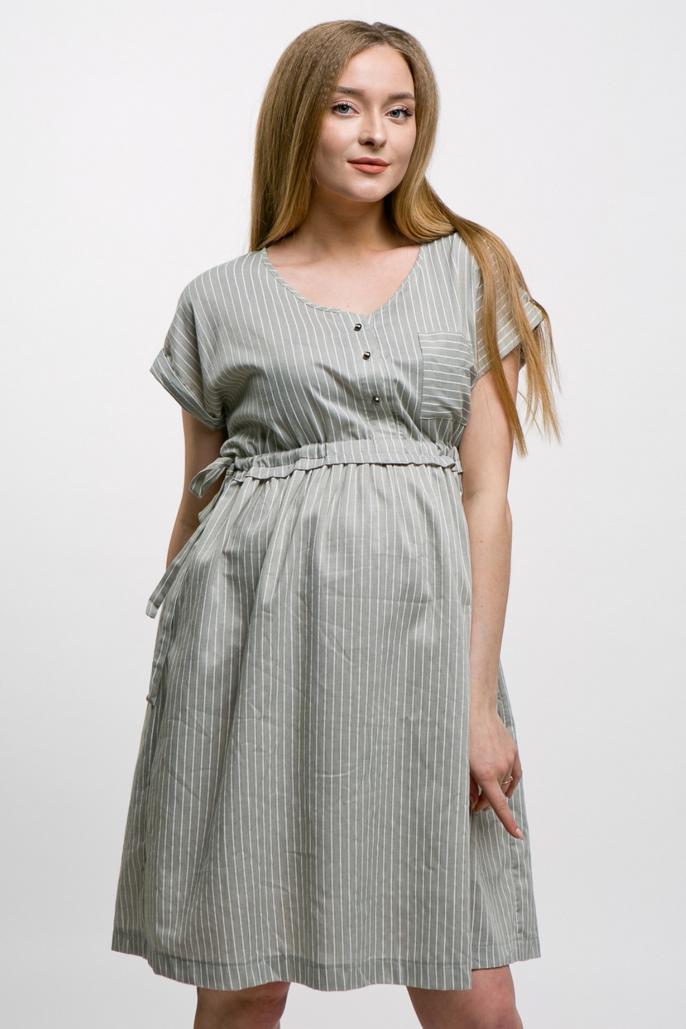 Легкое платье-рубашка для будущих мам. V-образный вырез горловины, короткий рукав, планка на пуговицах по переду, накладной карман на груди. Платье свободного кроя обеспечивает комфорт и предоставляет возможность носить его на всем протяжении беременности и после родов. Кулиски по бокам изделия позволят регулировать ширину платья под вашу фигуру, создавая приталенный силуэт.