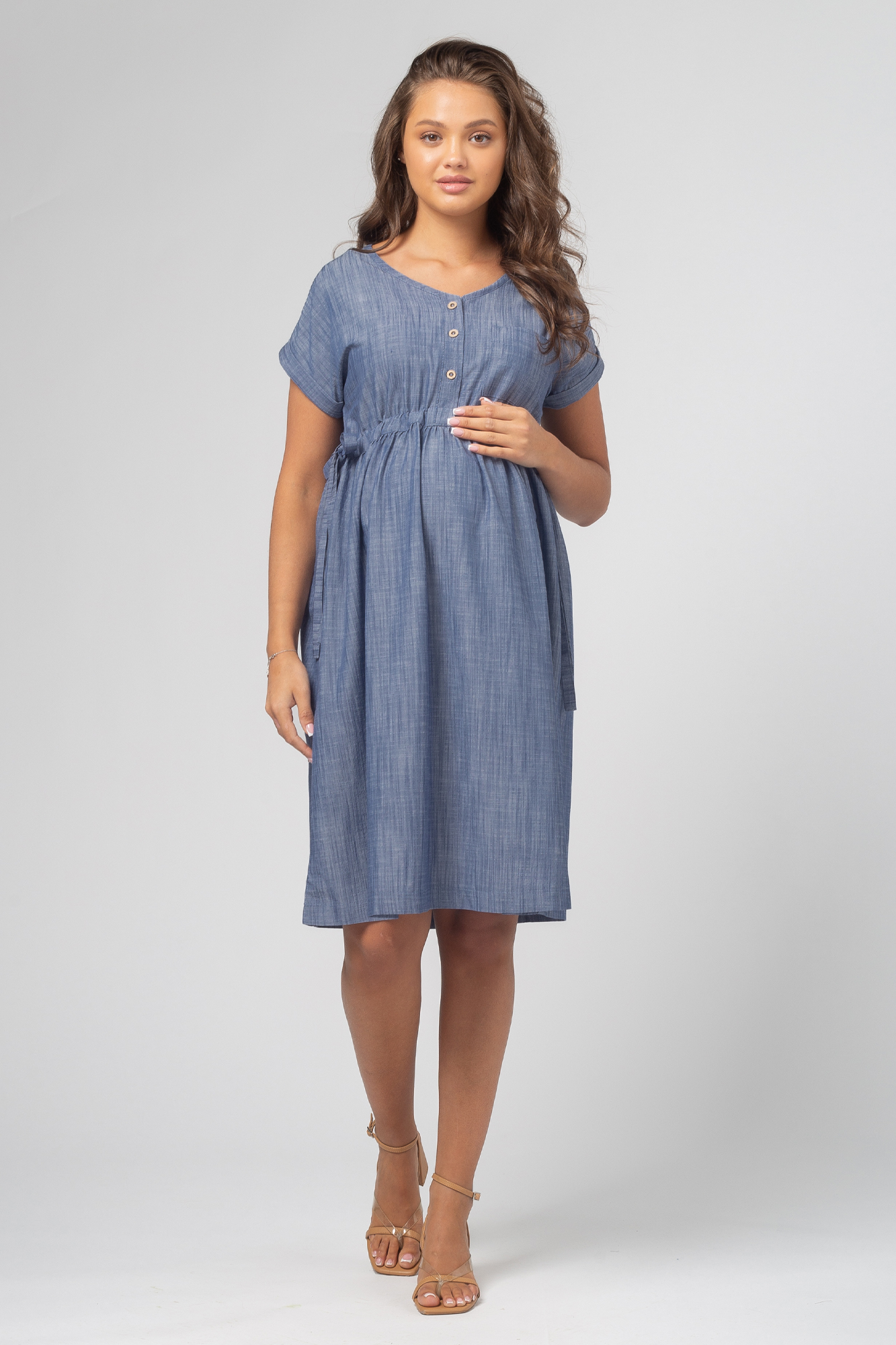 Легкое платье-рубашка для будущих мам. V-образный вырез горловины, короткий рукав, планка на пуговицах по переду, накладной карман на груди. Платье свободного кроя обеспечивает комфорт и предоставляет возможность носить его на всем протяжении беременности и после родов. Кулиски по бокам изделия позволят регулировать ширину платья под вашу фигуру, создавая приталенный силуэт.