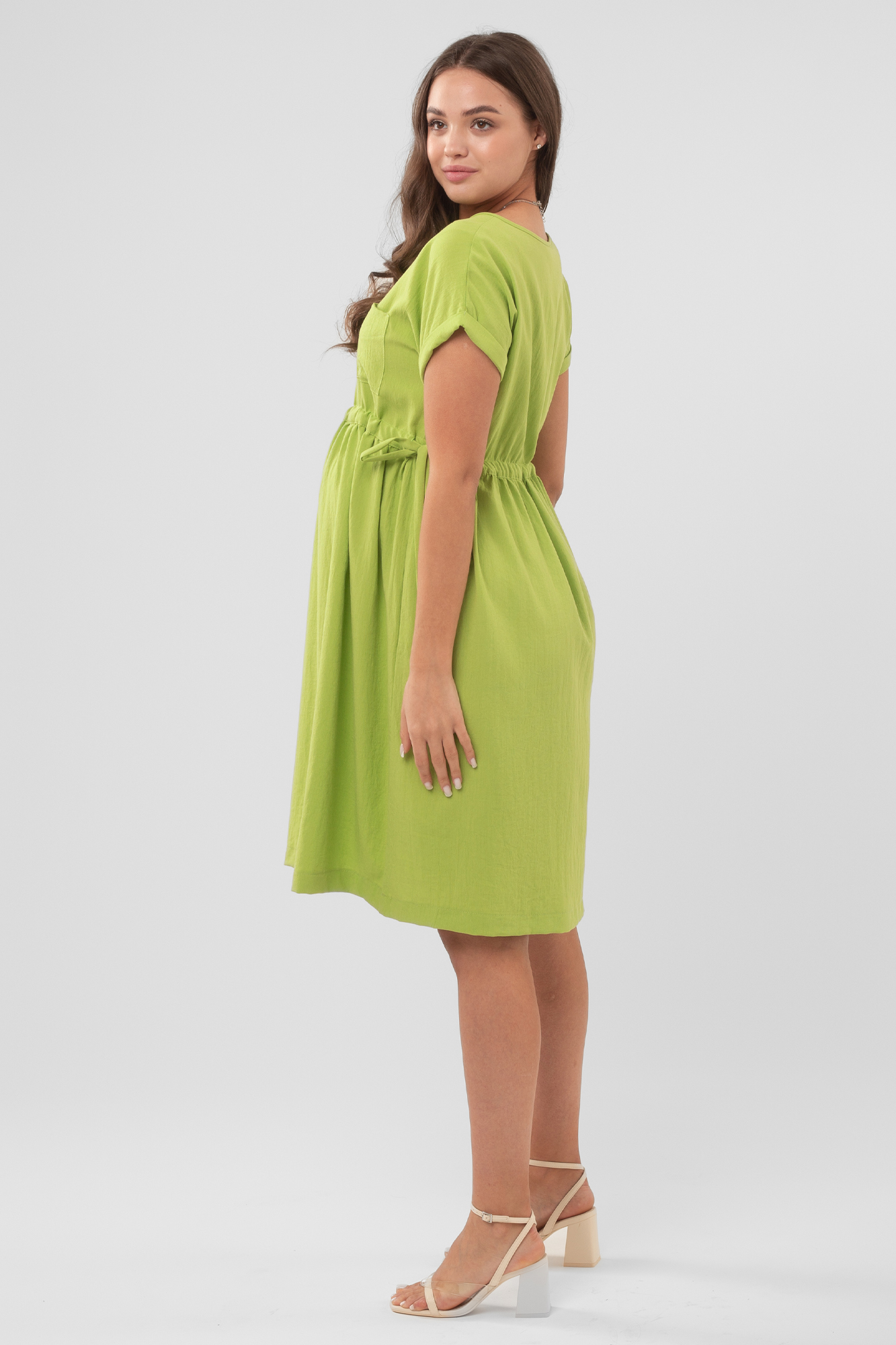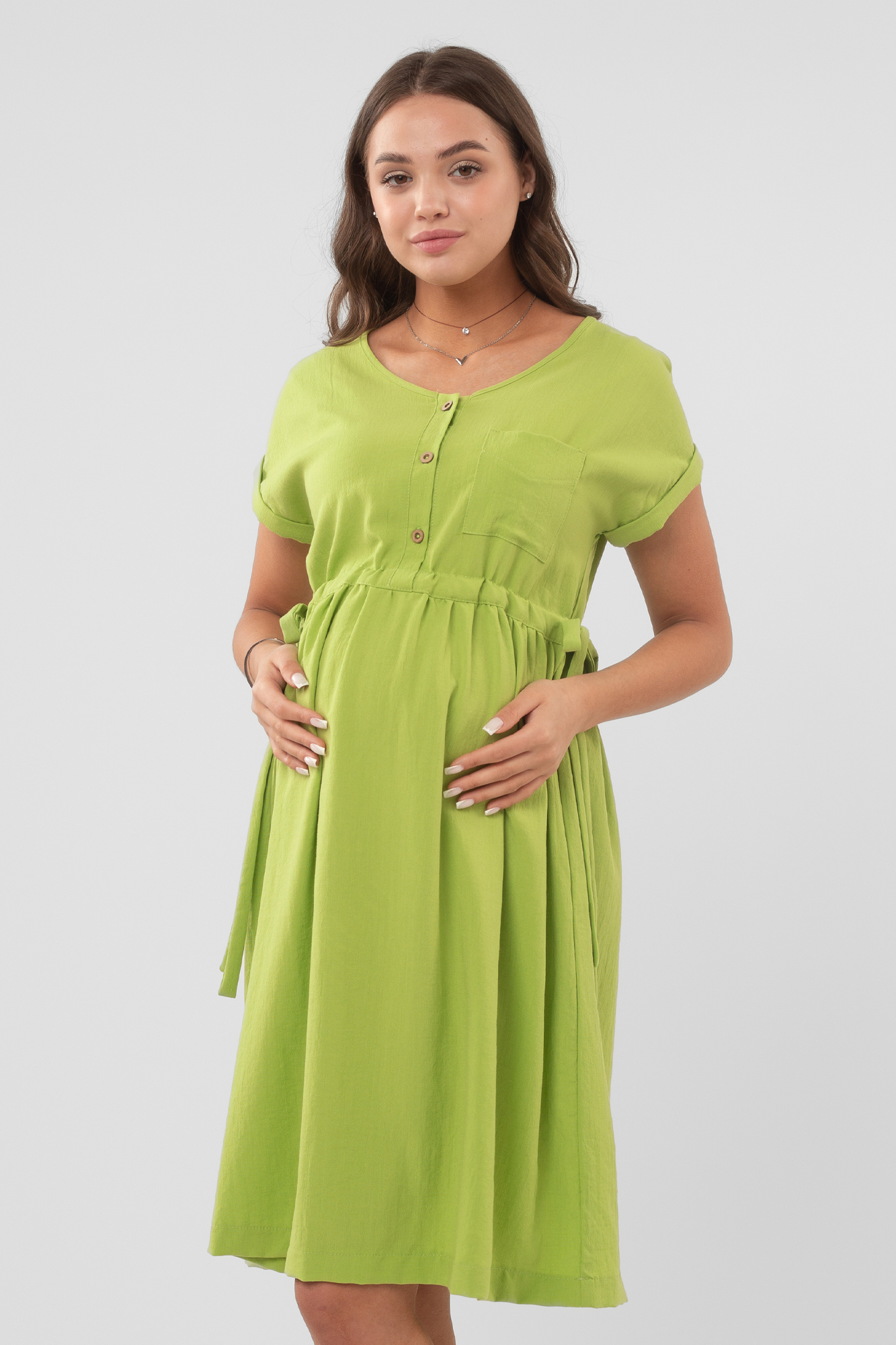 Легкое платье-рубашка для будущих мам. V-образный вырез горловины, короткий рукав, планка на пуговицах по переду, накладной карман на груди. Платье свободного кроя обеспечивает комфорт и предоставляет возможность носить его на всем протяжении беременности и после родов. Кулиски по бокам изделия позволят регулировать ширину платья под вашу фигуру, создавая приталенный силуэт.