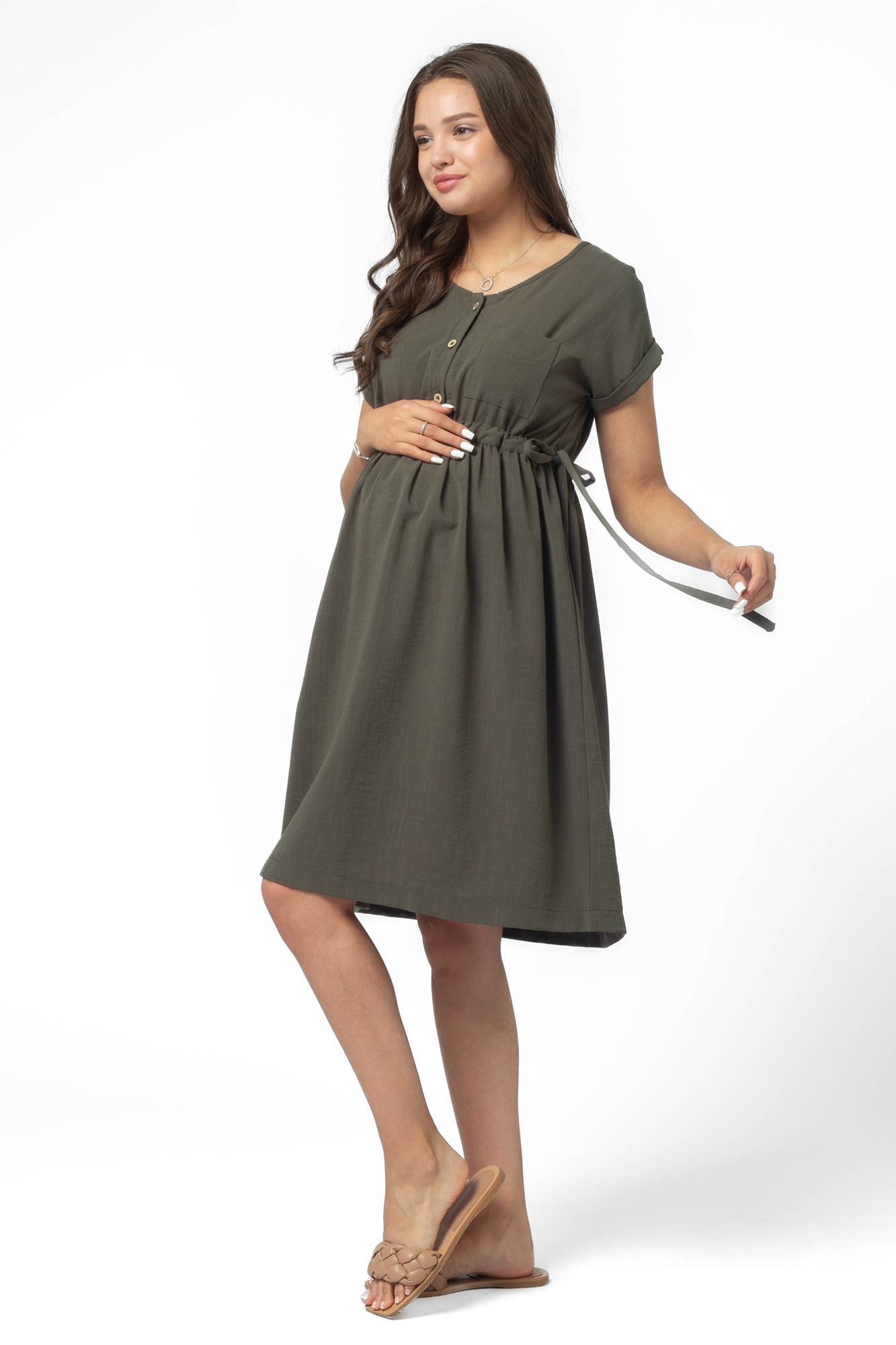 Легкое платье-рубашка для будущих мам. V-образный вырез горловины, короткий рукав, планка на пуговицах по переду, накладной карман на груди. Платье свободного кроя обеспечивает комфорт и предоставляет возможность носить его на всем протяжении беременности и после родов. Кулиски по бокам изделия позволят регулировать ширину платья под вашу фигуру, создавая приталенный силуэт.