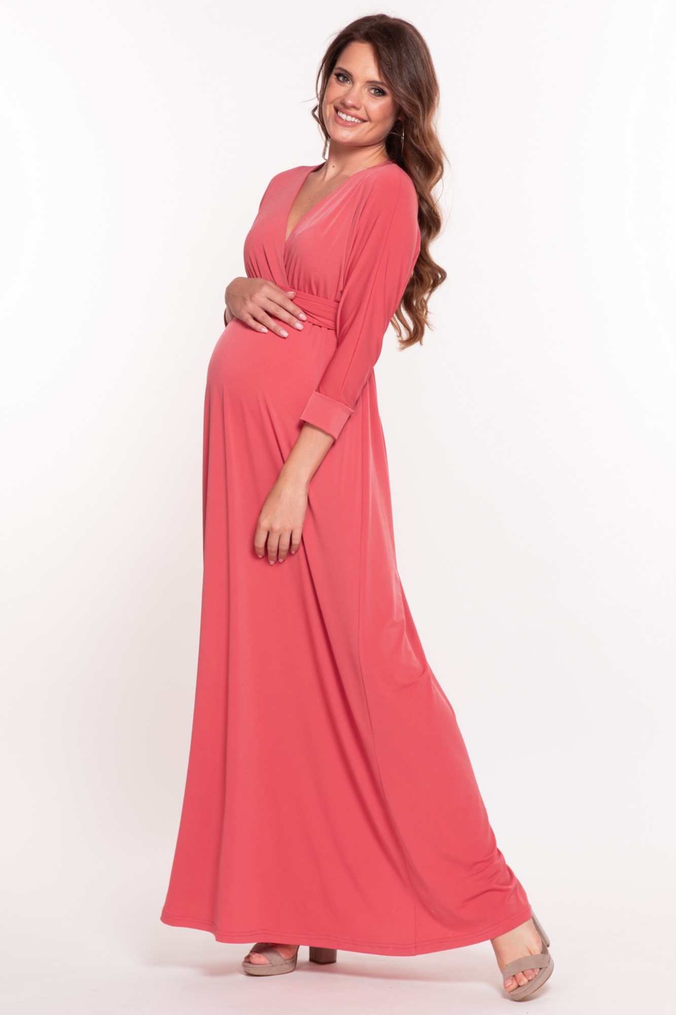 Женственное длинное платье для беременных. Модель с нежным декольте, рукавом ¾, поясом под грудью. Платье прекрасно сидит на любом сроке беременности и после рождения малыша. Специальный крой подчеркнет достоинства фигуры будущей мамы и подарит абсолютный комфорт.