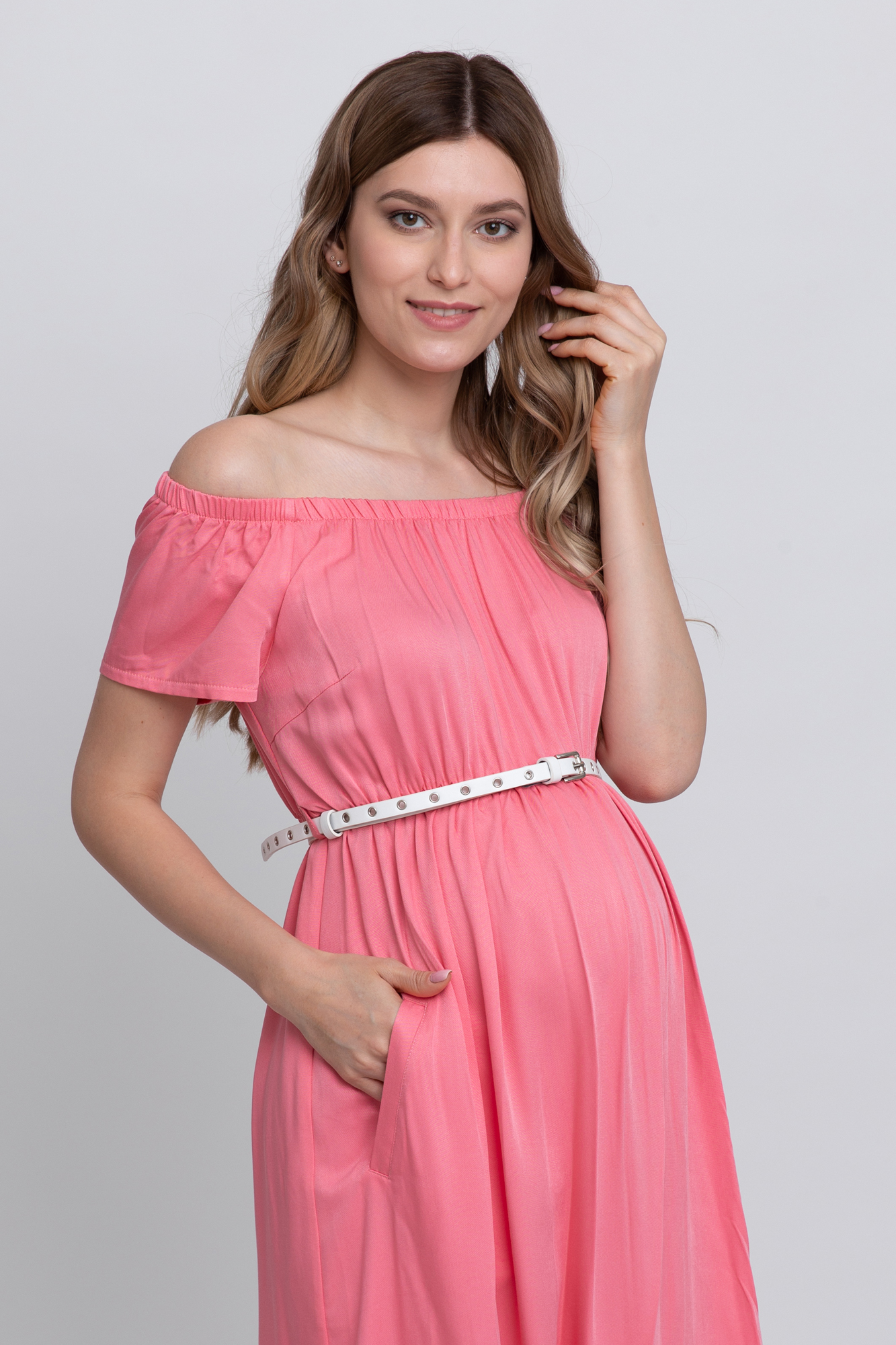 Платье из высококачественной шелковистой вискозы для будущих мам. Натуральный материал подарит приятные тактильные ощущения и обеспечит комфорт будущей маме и малышу. Модель с вырезом кармен, коротким рукавом, карманами по бокам изделия и тонким ремешком под груью. Свободный крой из-под груди позволяет носить платье на всем протяжении беременности, а после родов скроет временные несовершенства фигуры.