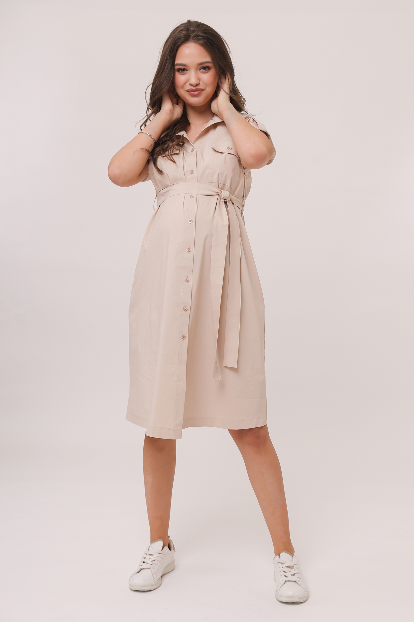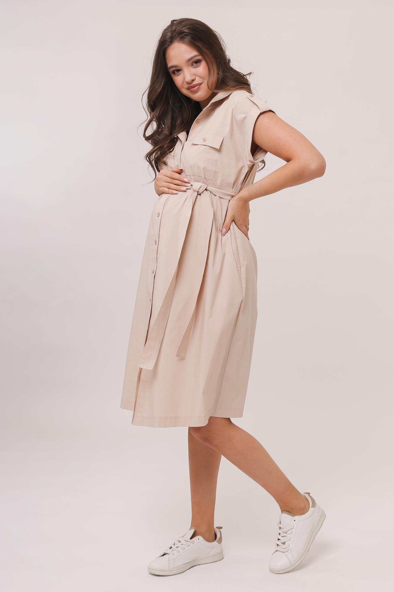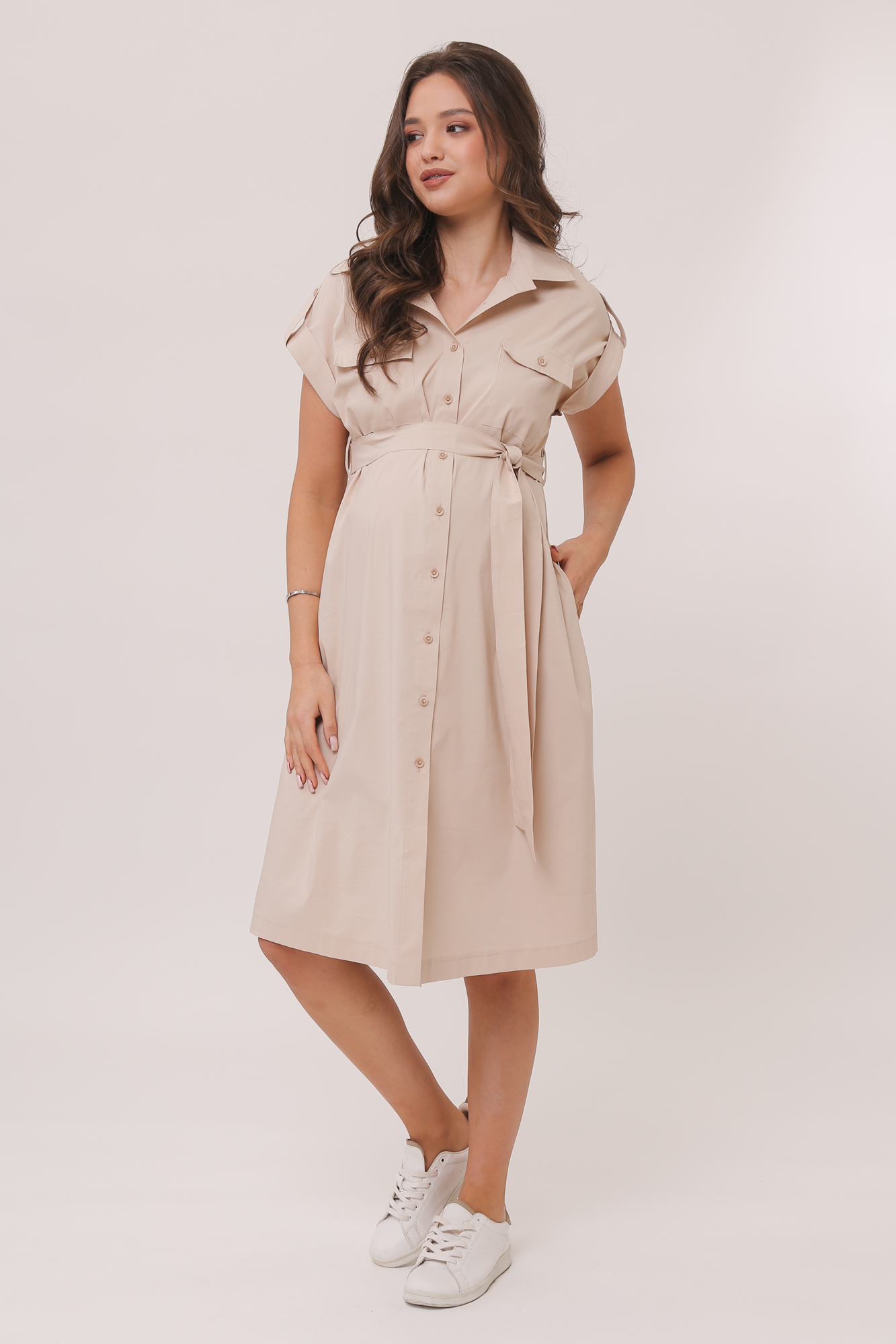 Летнее платье-рубашка для беременных. Модель выполнена из высококачественного дышащего хлопка с добавлением эластана. Натуральный материал подарит приятные тактильные ощущения и обеспечит комфорт будущей маме и малышу. Свободный крой позволяет носить изделие на всем протяжении беременности, а после родов скроет временные несовершенства фигуры. Детали: отложной воротник, спущенная линия плеча, хлястики на рукавах позволяют фиксировать отвороты, застежка на пуговицы, пояс, боковые и нагрудные карманы. Платье станет незаменимой частью Вашего гардероба!