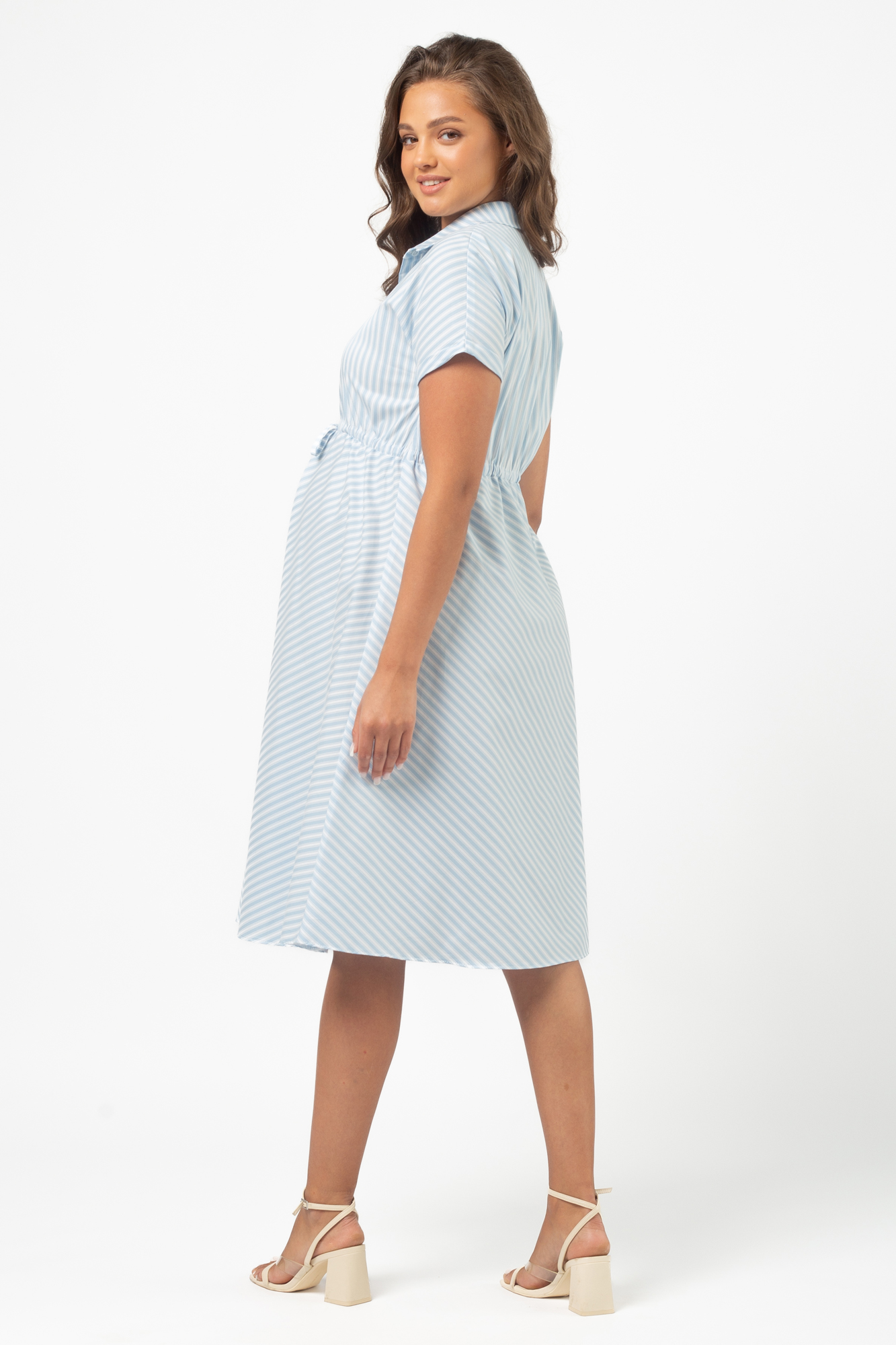 Легкое летнее платье-рубашка для беременных прекрасно подойдет для мероприятий и просто на каждый день. Модель имеет свободный, чуть приталенный крой и универсальную длину миди. Короткие рукава, воротник классический отложной, застежка на пуговице. Для удобства в платье добавлены завязки, которые можно затянуть и сделать фасон более приталенным или наоборот более свободным. В теплую погоду такую модель можно выбрать в качестве наряда на выписку.