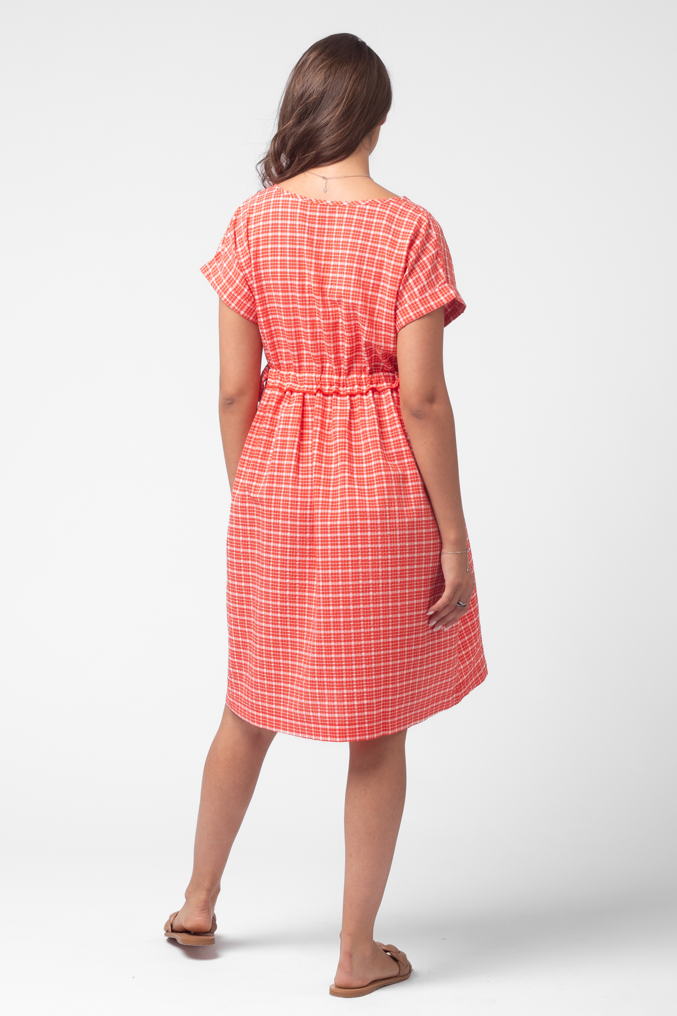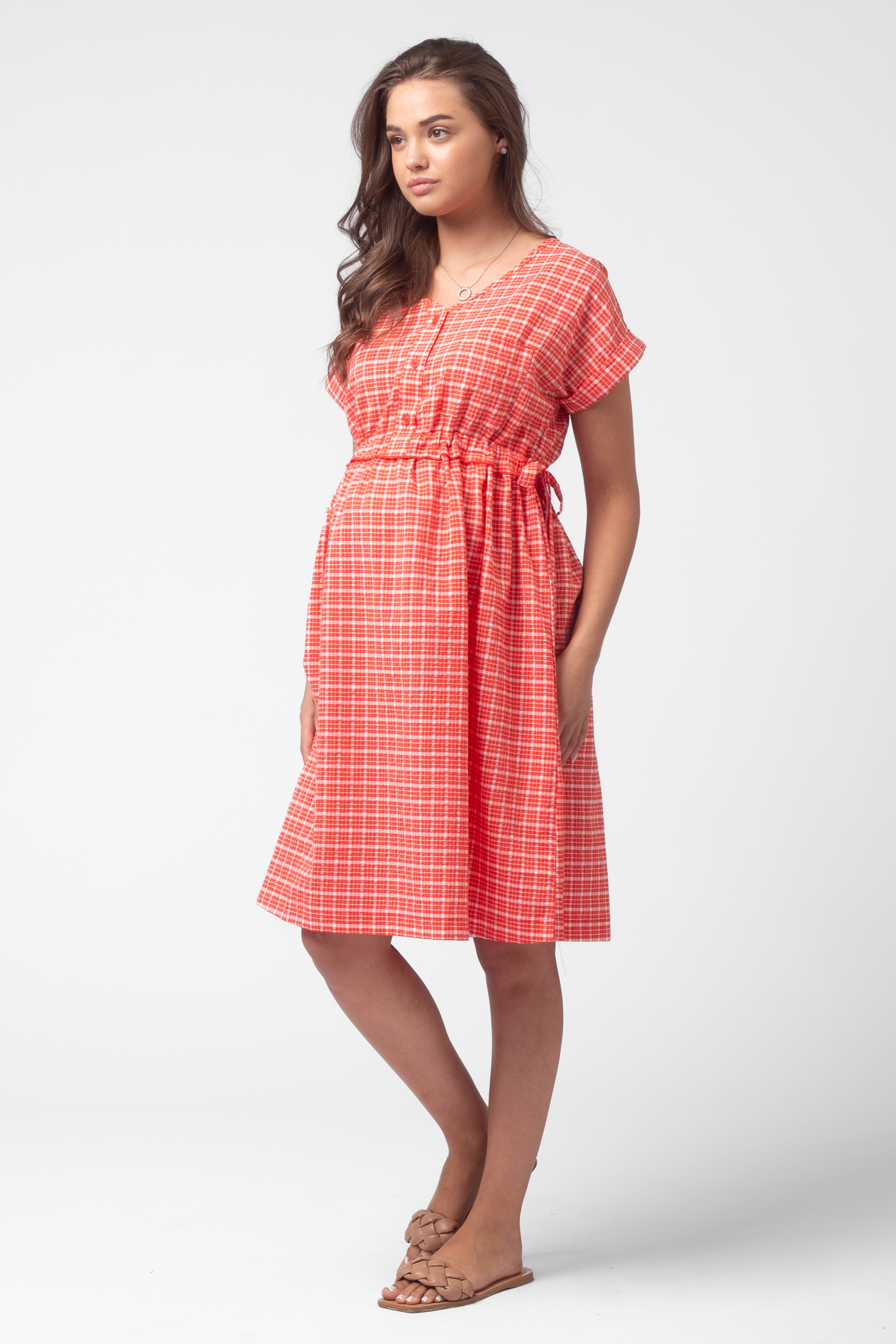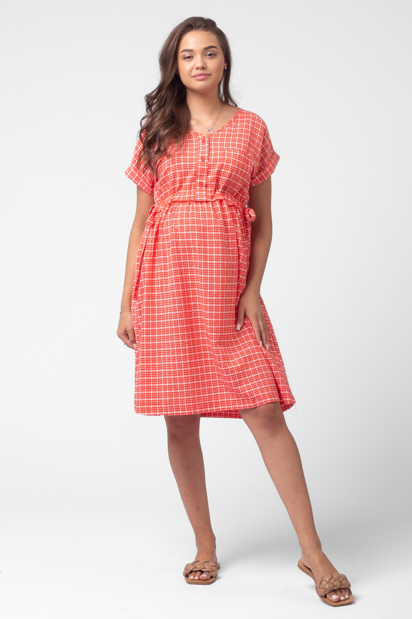 Летнее платье рубашка для беременных из высококачественной хлопковой ткани. Модель свободного кроя и универсальной длины миди. Рукав короткий, V-образный вырез, на груди застежка с пуговицами и один накладной карман. На завышенной талии по бокам добавлены кулиски для регулировки объема. Свободная юбка аккуратно подчеркивает фигуру, не стесняет движений и не мешает растущему животику, поэтому платье подходит для любого срока беременности. Модель хорошо сочетается с разными вещами, обувью и аксессуарами из женского гардероба: кардиганами и туфлями, джинсовками и кедами. Платье рубашку можно выбрать в качестве повседневного варианта, для офиса и деловых встреч, а также как наряд на выписку в летний сезон. Размерная линейка включает все стандартные размерные позиции.