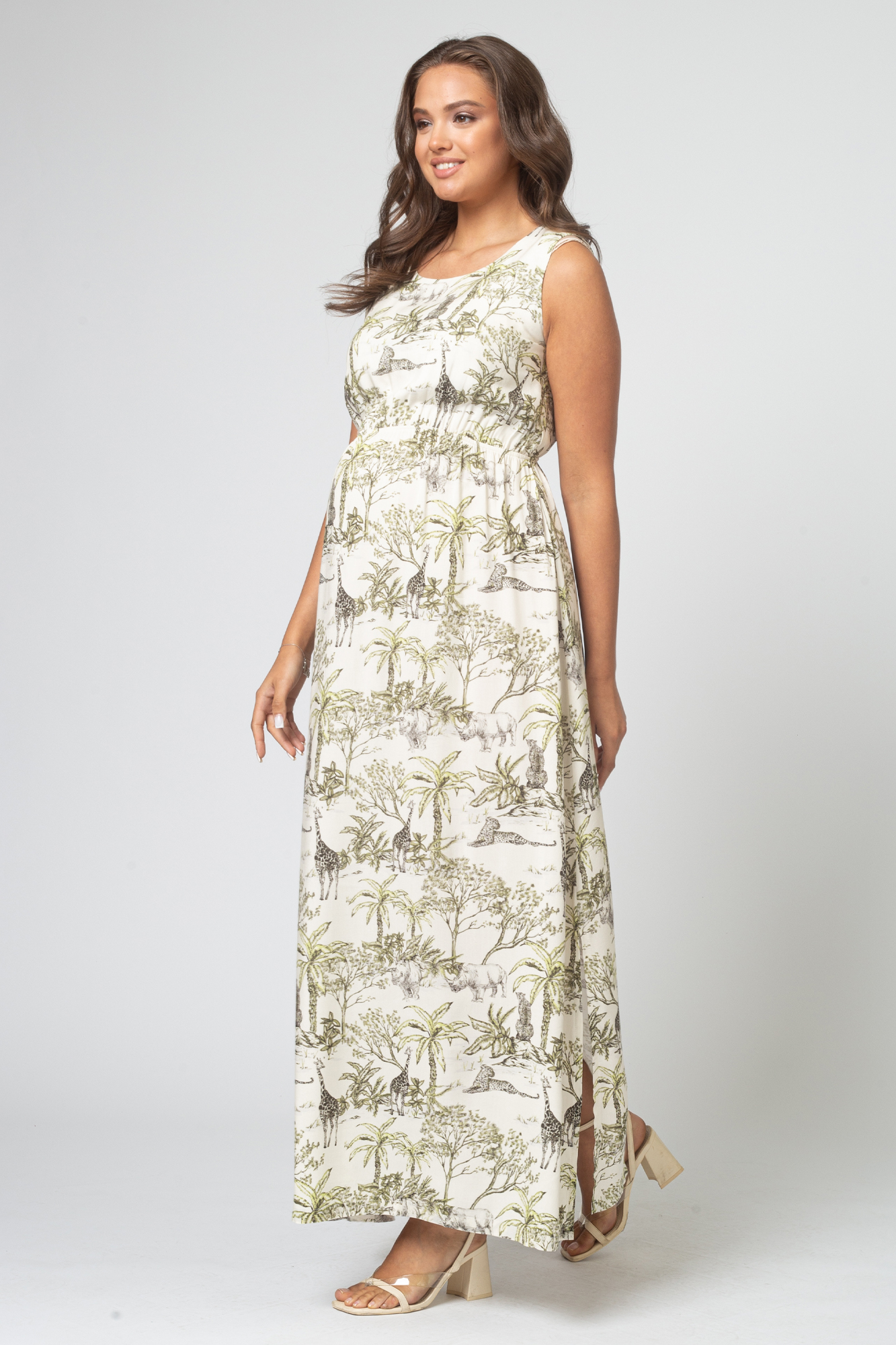 Длинное женственное платье для будущих мам. Округлый вырез горловины, без рукавов. Приталенный силуэт создает резинка под грудью и по спинке. Тонкий ремешок подчеркнет элегантность образа. Разрез сбоку обеспечит свободу движений. Платье можно носить на всем протяжении беременности и после нее. Подойдет так же для особых случаев.