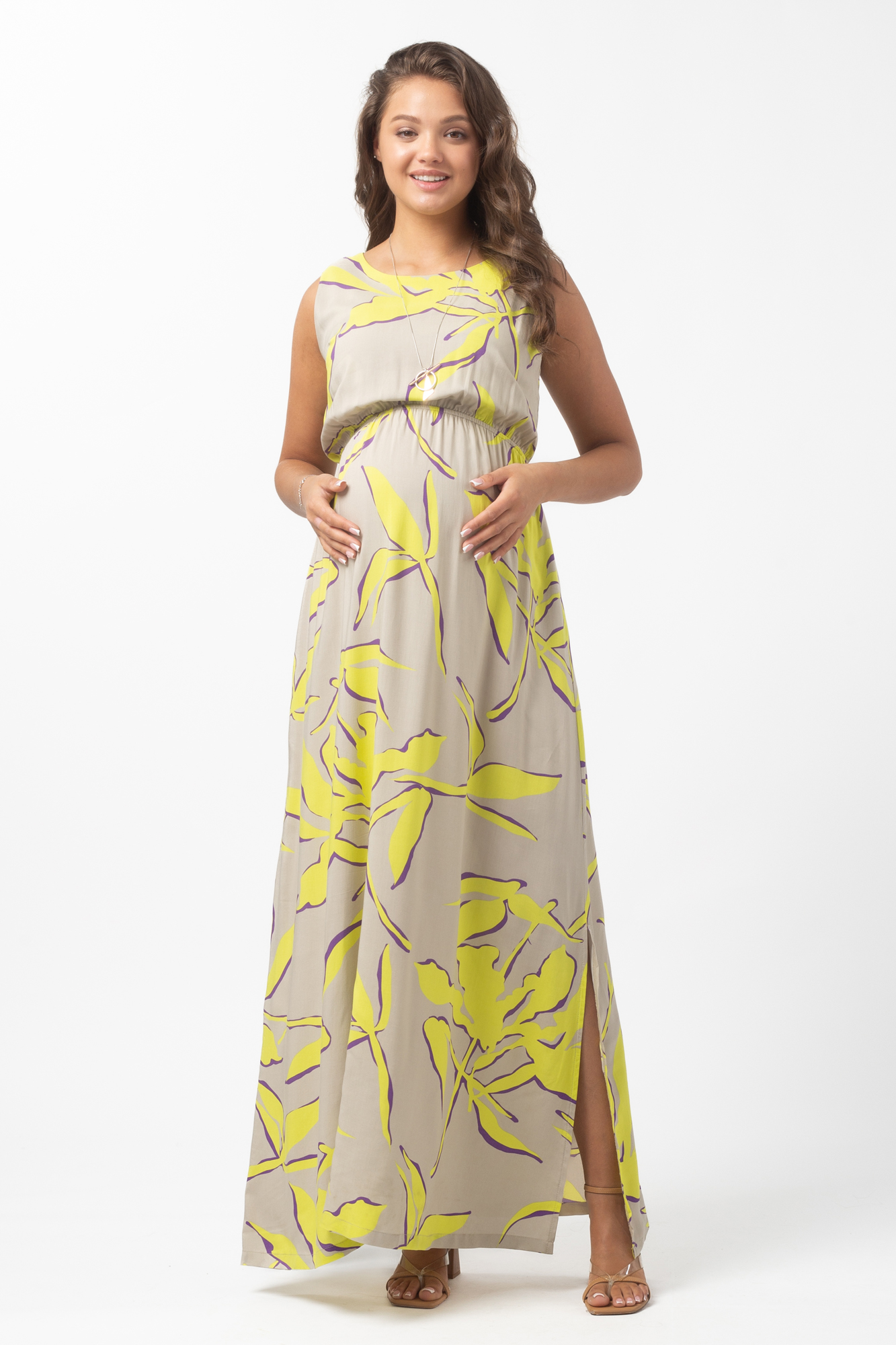 Длинное женственное платье для будущих мам. Округлый вырез горловины, без рукавов. Приталенный силуэт создает резинка под грудью и по спинке. Тонкий ремешок подчеркнет элегантность образа. Разрез сбоку обеспечит свободу движений. Платье можно носить на всем протяжении беременности и после нее. Подойдет так же для особых случаев.