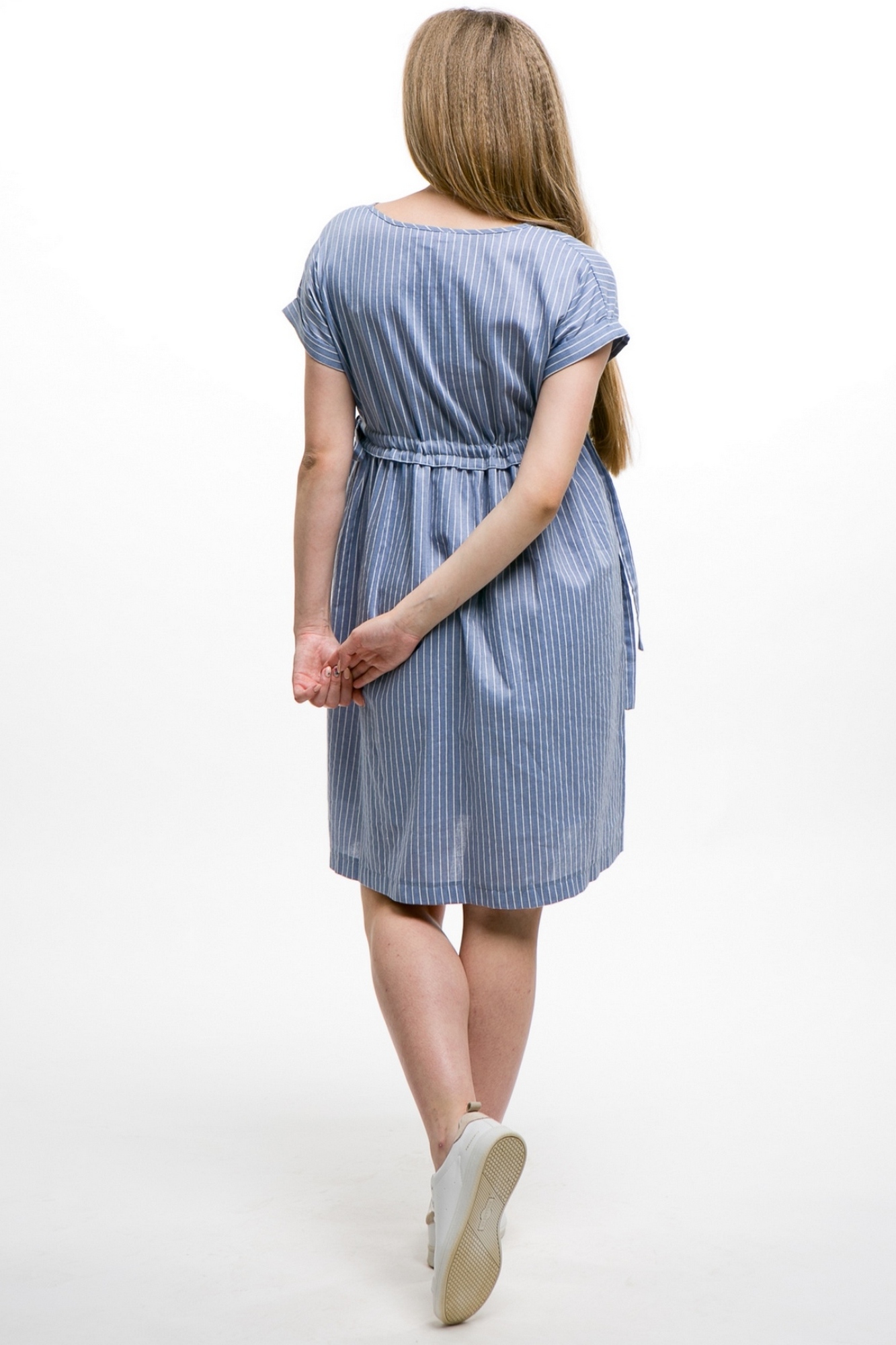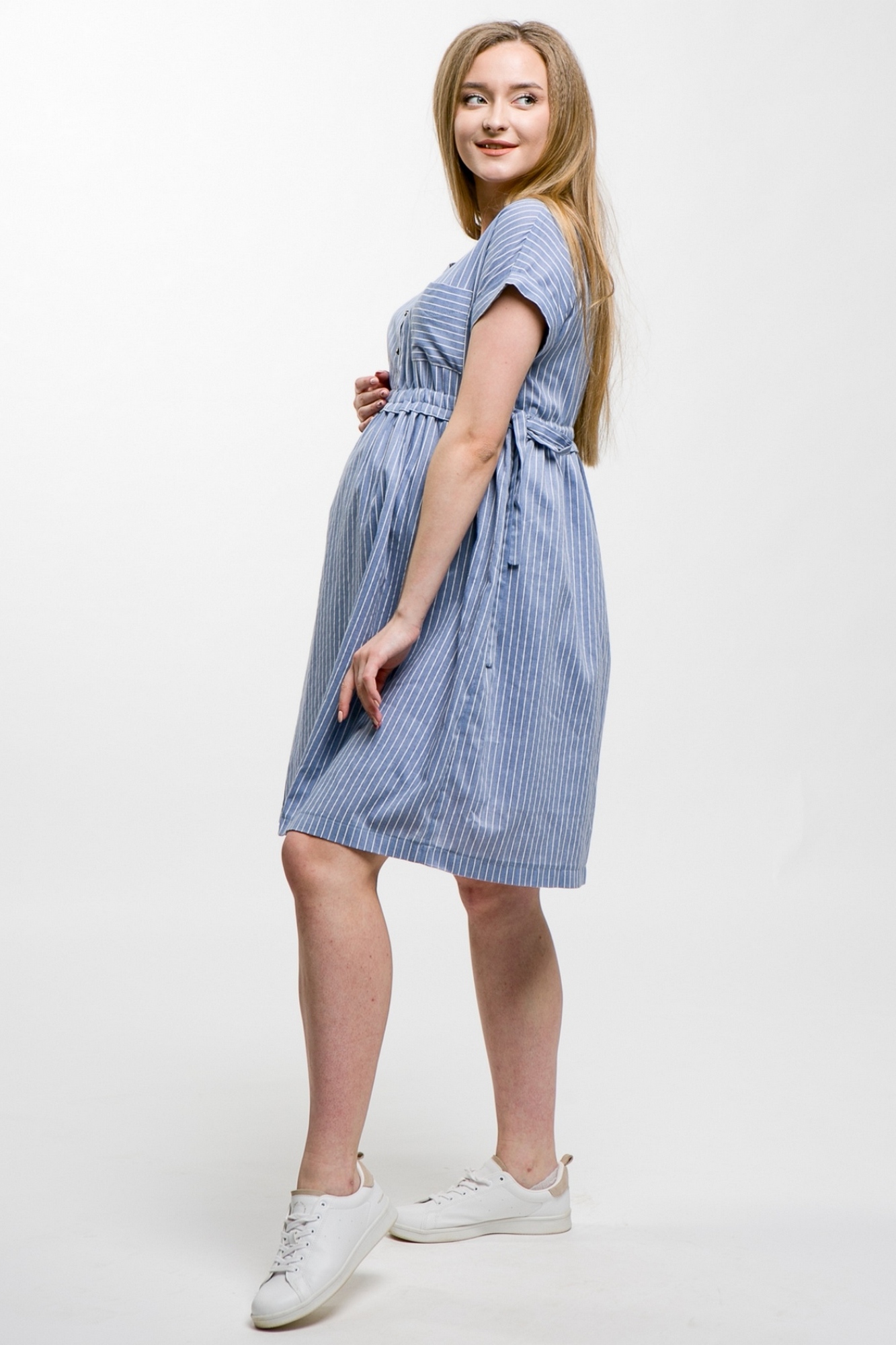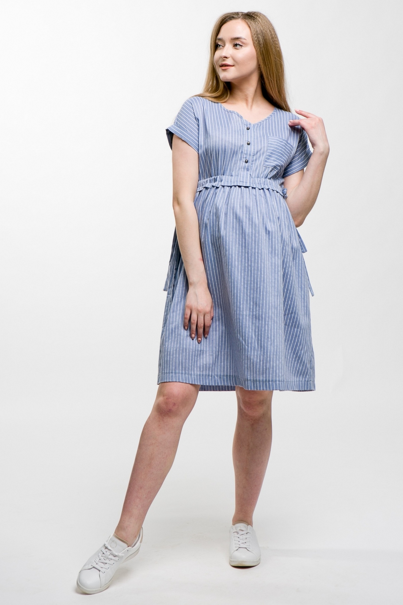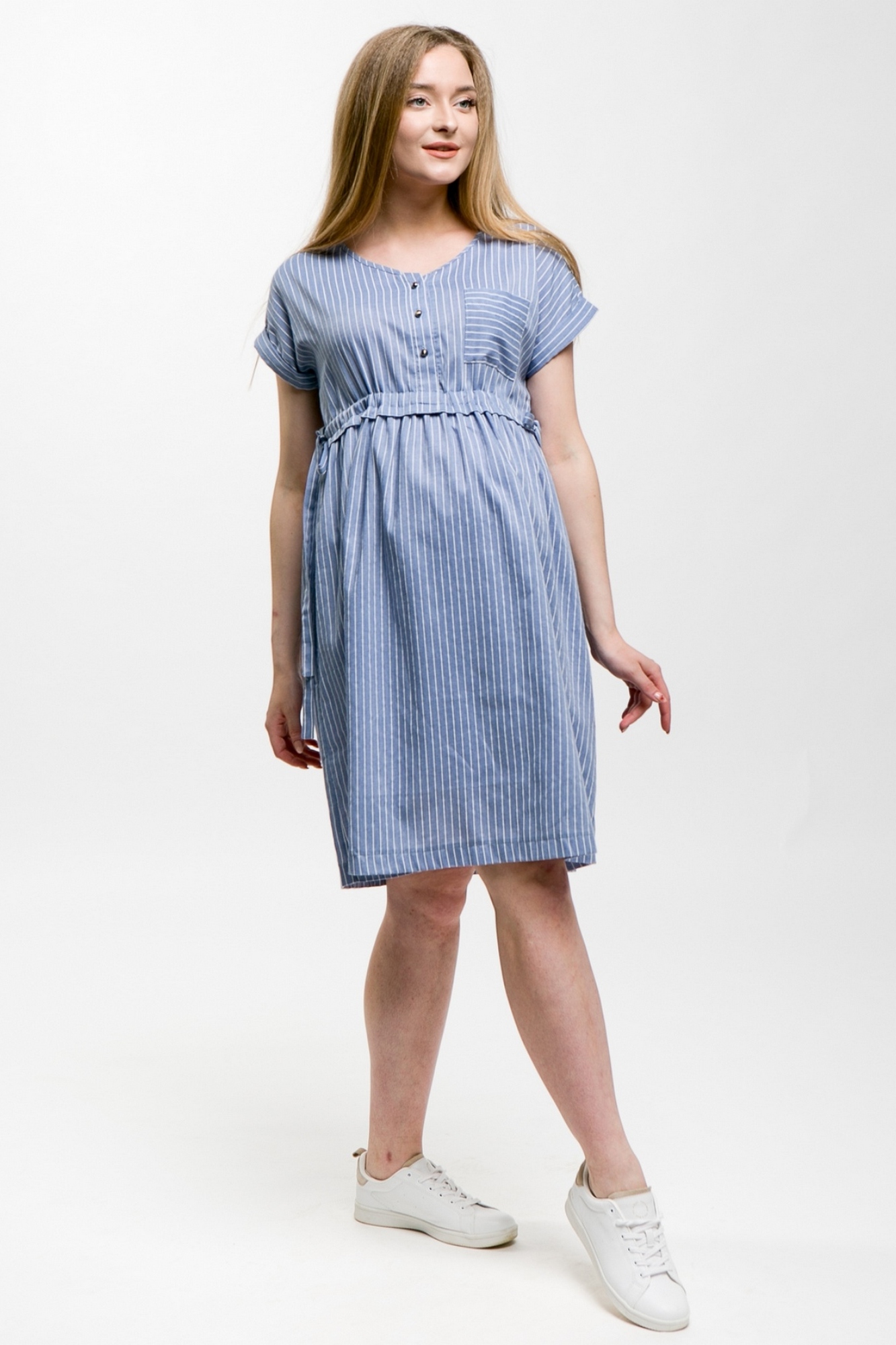 Легкое платье-рубашка для будущих мам. V-образный вырез горловины, короткий рукав, планка на пуговицах по переду, накладной карман на груди. Платье свободного кроя обеспечивает комфорт и предоставляет возможность носить его на всем протяжении беременности и после родов. Кулиски по бокам изделия позволят регулировать ширину платья под вашу фигуру, создавая приталенный силуэт.