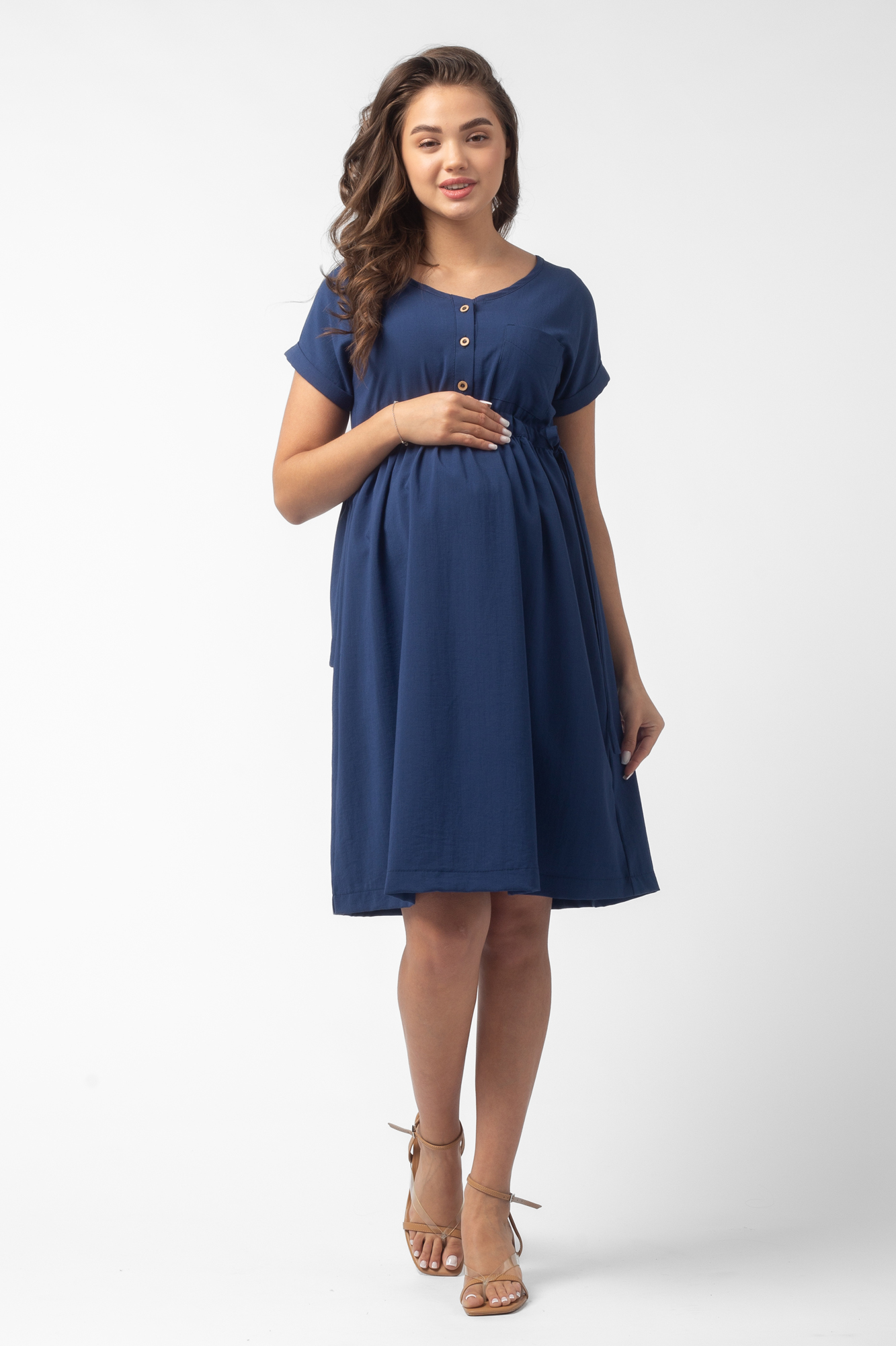 Легкое платье-рубашка для будущих мам. V-образный вырез горловины, короткий рукав, планка на пуговицах по переду, накладной карман на груди. Платье свободного кроя обеспечивает комфорт и предоставляет возможность носить его на всем протяжении беременности и после родов. Кулиски по бокам изделия позволят регулировать ширину платья под вашу фигуру, создавая приталенный силуэт.