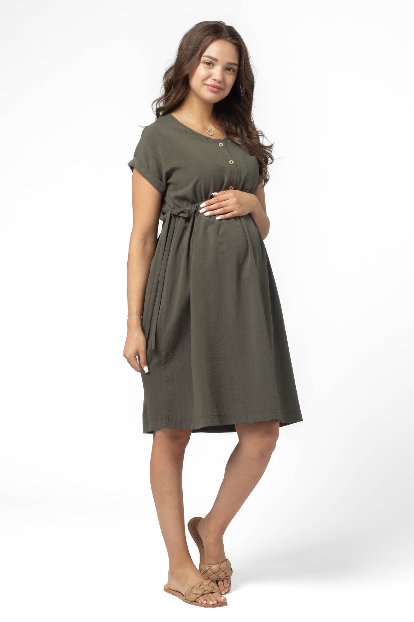 Легкое платье-рубашка для будущих мам. V-образный вырез горловины, короткий рукав, планка на пуговицах по переду, накладной карман на груди. Платье свободного кроя обеспечивает комфорт и предоставляет возможность носить его на всем протяжении беременности и после родов. Кулиски по бокам изделия позволят регулировать ширину платья под вашу фигуру, создавая приталенный силуэт.