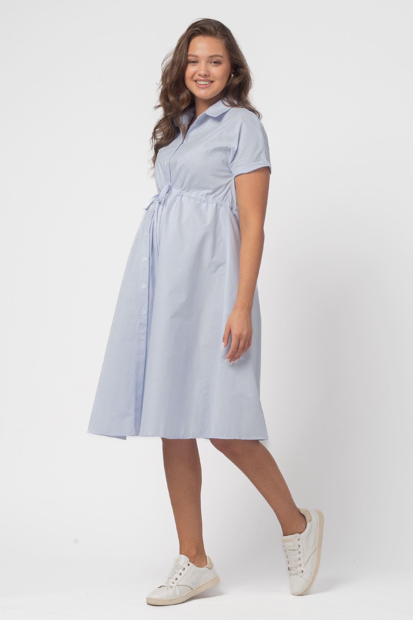 Легкое летнее платье-рубашка для беременных прекрасно подойдет для мероприятий и просто на каждый день. Модель имеет свободный, чуть приталенный крой и универсальную длину миди. Короткие рукава, воротник классический отложной, застежка на пуговице. Для удобства в платье добавлены завязки, которые можно затянуть и сделать фасон более приталенным или наоборот более свободным. В теплую погоду такую модель можно выбрать в качестве наряда на выписку.