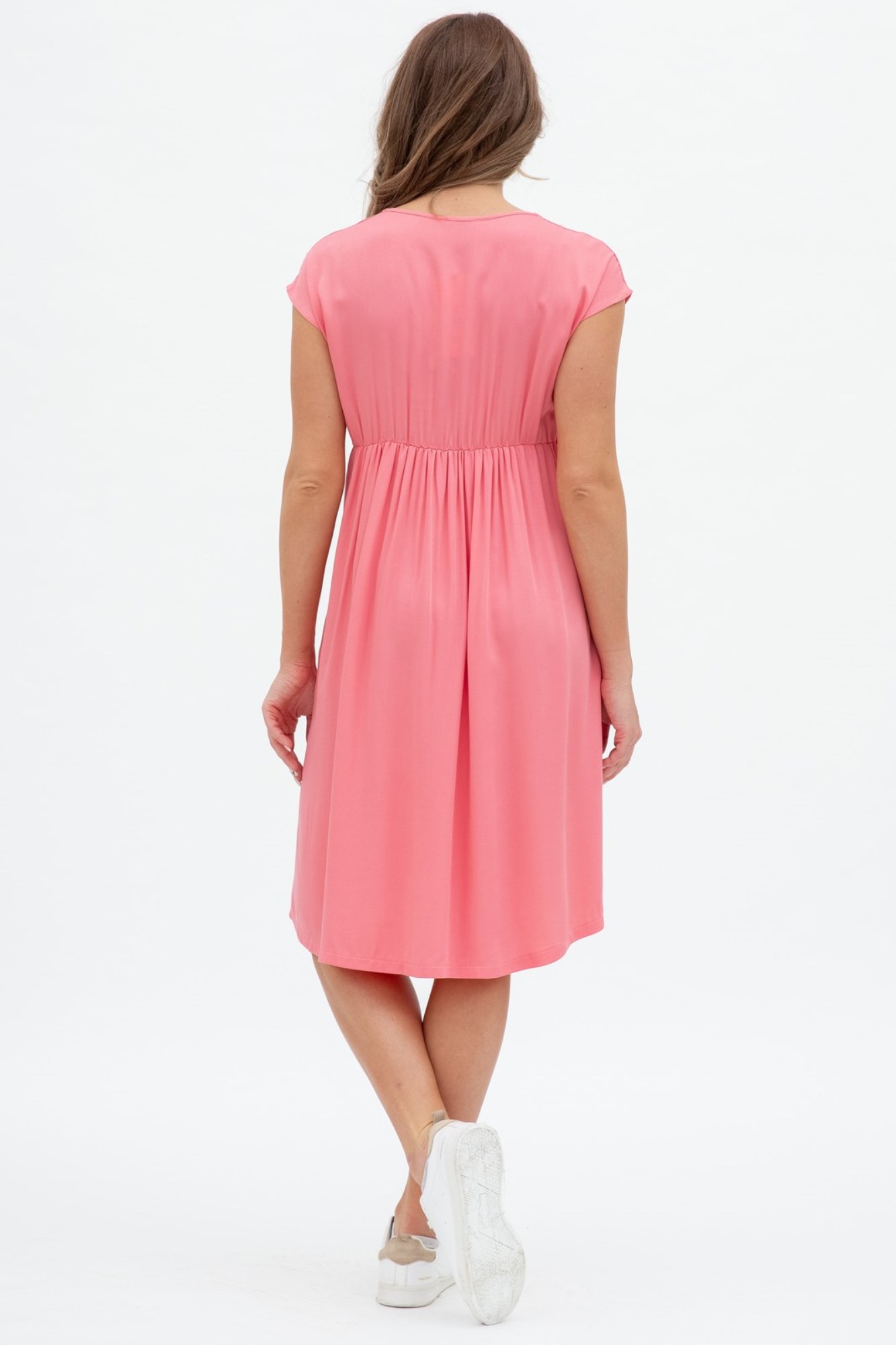 Платье из высококачественной шелковистой вискозы для будущих мам. Натуральный материал подарит приятные тактильные ощущения и обеспечит комфорт будущей маме и малышу. У платья округлый вырез горловины, короткий рукав, карманы по бокам изделия. Свободный крой из-под груди позволяет носить платье на всем протяжении беременности, а после родов скроет временные несовершенства фигуры.